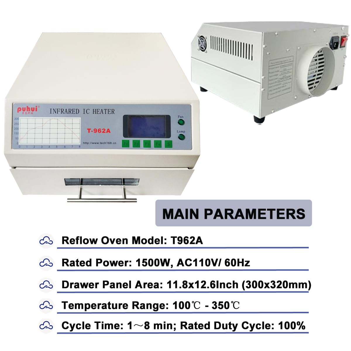 Technical Parameter: Power supply: AC110V/ 50~60Hz, rated power: 1500W, drawer panel area: 11.8x12.6Inch (300x320mm), temperature range: 0℃-280℃, cycle time: 1~8 min, rated duty cycle: 100%