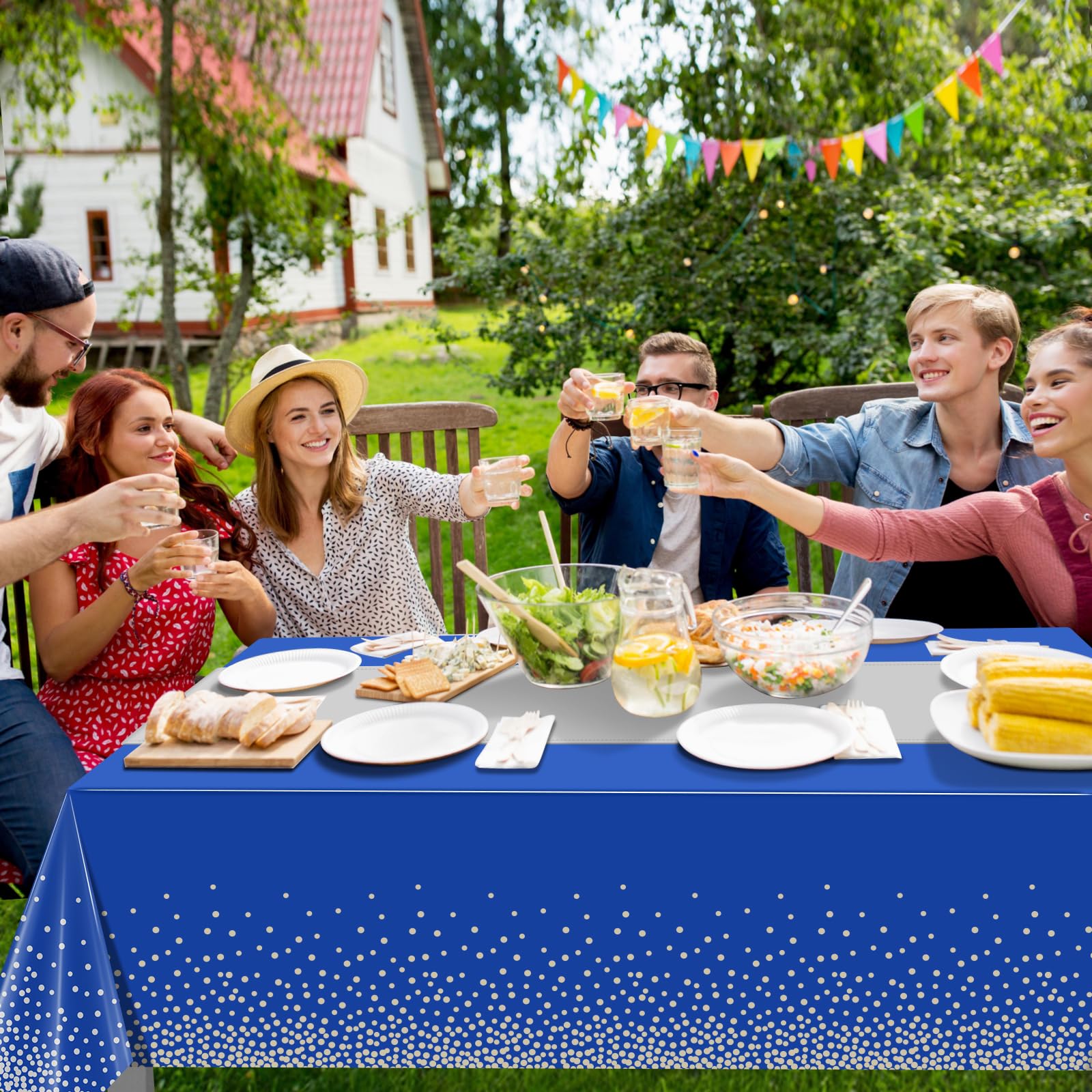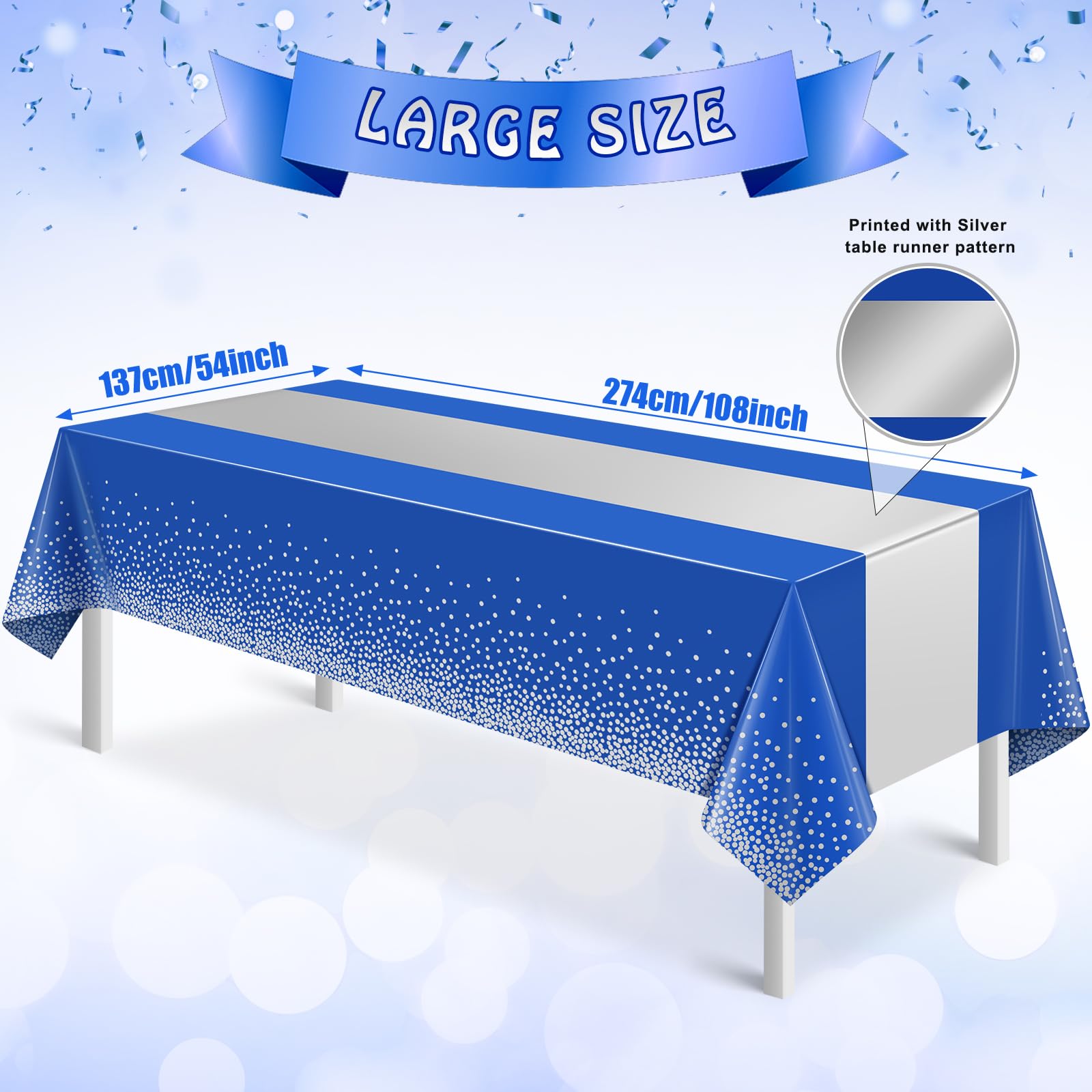 Large size:these plastic royal blue silver rectangle tablecloth measures approx. 137x274cm/54X108 inch, which fits for 8 feet long tables that can accommodate 8-10 people, It’s large enough for your to hold a theme party with your family and friends to share happiness
