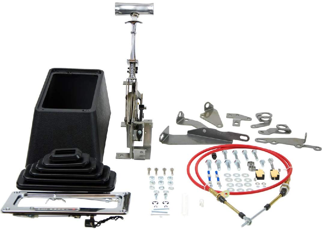 The look and feel of the T-handle and accordion style shift boot really shows off the racing heritage of the MegaShifter. Other features include a black console that you can trim to fit your vehicle floor for a perfect fit, 5 foot shifter cable, cable brackets, transmission shift levers, chrome plated top plate with lighted gear indicator and everything needed for an easy at home install.