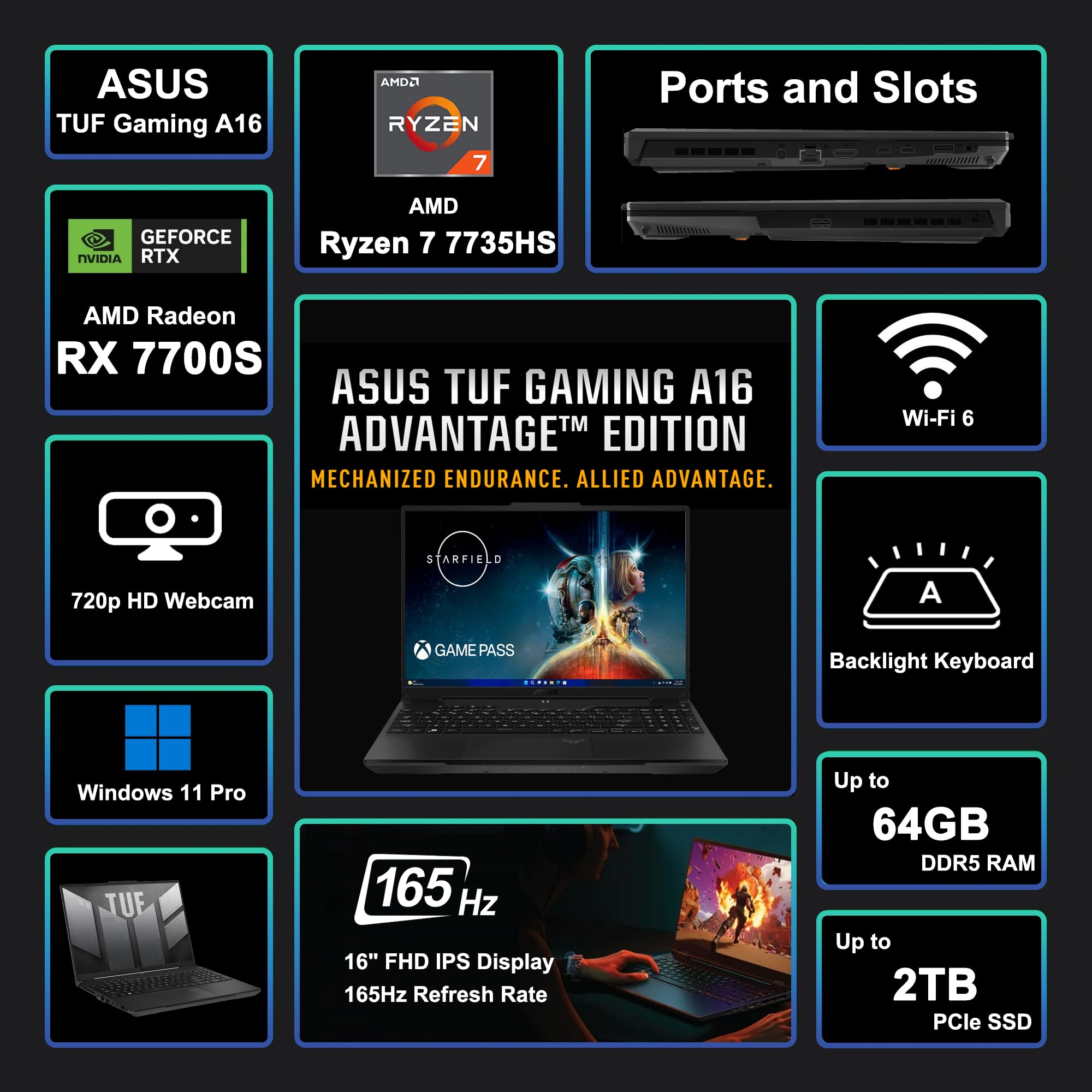 Unleash the Power Within. Introducing the Windows 11 Professional Performance Beast. This isn't just a laptop; it's your mobile command center. Engineered for creators, gamers, and power users, it's driven by the formidable AMD Octa-core Ryzen 7 processor and dedicated AMD Radeon RX 7700S 8GB graphics. Experience desktop-level performance for seamless multitasking, breathtaking content creation, and immersive gameplay. Command Every Pixel. Get lost in a stunning 16" WUXGA IPS display that redefines smoothness. With a buttery-smooth 165Hz refresh rate, 100% sRGB color, and AMD FreeSync Premium, visuals are breathtakingly fluid, tear-free, and incredibly vivid. See and feel the difference. Engineered for the Demands of Tomorrow. Thunderous Audio: Feel every explosion and note with a premium sound system featuring Dolby Atmos and Hi-Res Audio Certification for a truly cinematic experience. Connect Without Limits: From ultra-fast USB4 (40Gbps) for rapid data transfers to HDMI 2.1 for 4K output and Gigabit Ethernet for lag-free competition, every port empowers your workflow and play. Power Through Your Day: Stay in the zone with a massive 90Wh battery and a full-size, comfortable backlit keyboard. Wi-Fi 6 ensures you're always on the fastest network.