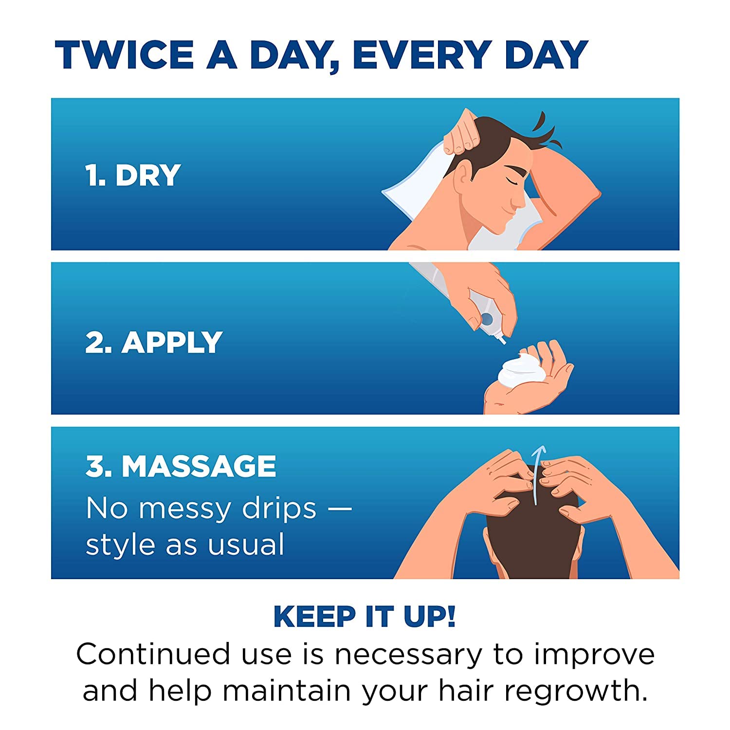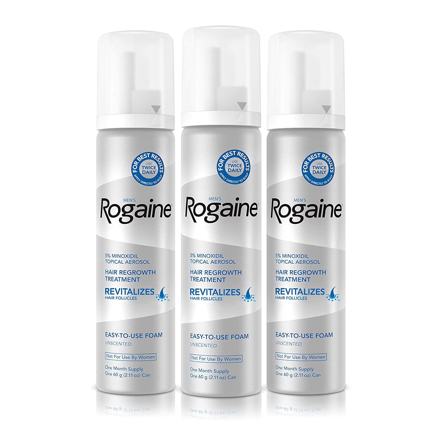 Men's Rogaine 5% Minoxidil Foam for Hair Loss and Hair Regrowth, Topical Treatment for Thinning Hair, 3-Month Supply - Help hair loss and regrow fuller hair with Men's ROGAINE Extra Strength 5% Minoxidil Topical Solution. Ideal for use at the early stages of hair thinning, this fast-working hair regrowth treatment is clinically proven to regrow hair. Unlike hair loss shampoos and hair thickening products that temporarily plump hair from the outside, ROGAINE penetrates the scalp to reactivate shrunken hair follicles, allowing for the regrowth of hair. The extra strength 5% Minoxidil formula works to boost hair follicle activity and hair protein production, helping to maintain hair density. This hair thinning treatment comes in a topical solution that is easy to use: Simply apply 1 milliliter directly to your scalp twice daily and massage it through your hair. Like all ROGAINE products, it is designed to fit easily into your routine.