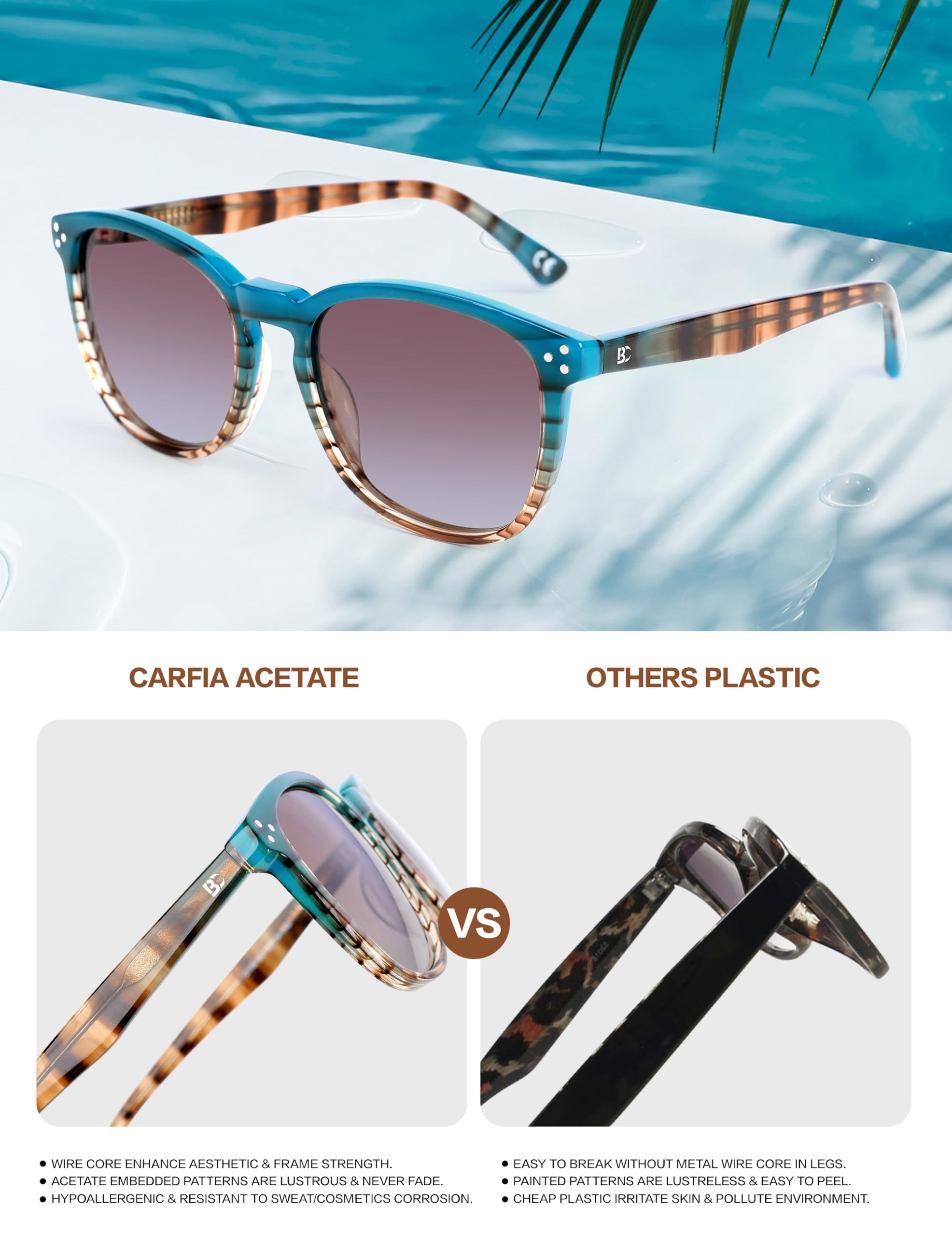 Acetate frame: Not ordinary plastic frame! Acetate is a high class material which full of shinny and scratch resistant,not easy to leave fingerprint on it and quite easy to manage,so the vintage shades will always looks new even wearing it a long time. this durable lightweight frame with one-piece nose pad will also enable a comfortable and head no-pressure wearing experience.