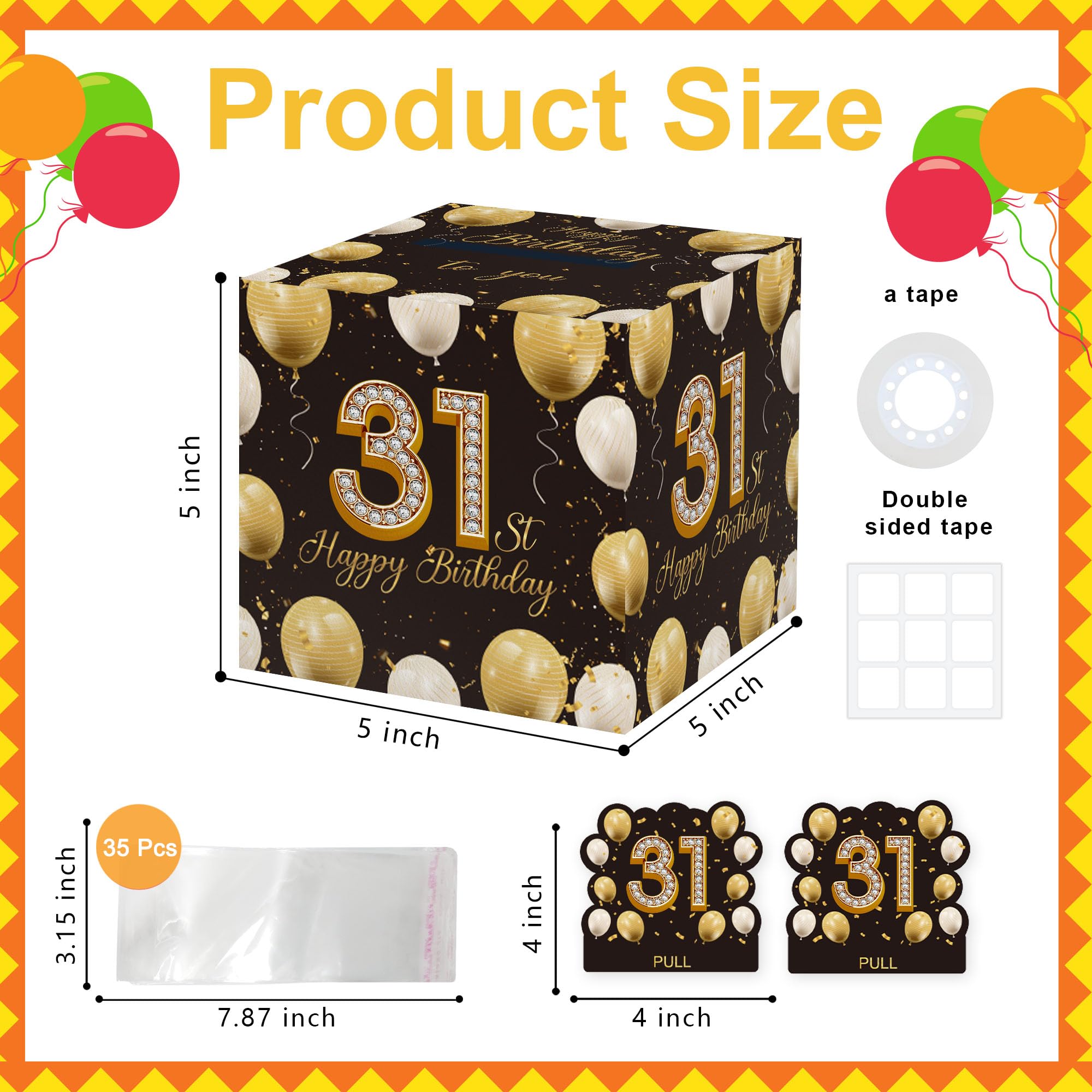 Surprise Gift Box: this gift box measures 5x5 inches, is made of durable cardboard. It also includes 2 theme-related shaped card(with adhere glue dots), 1 roll of transparent tape and 35 plastic pouches similar to the size of U.S. currency for easy placement of bills.