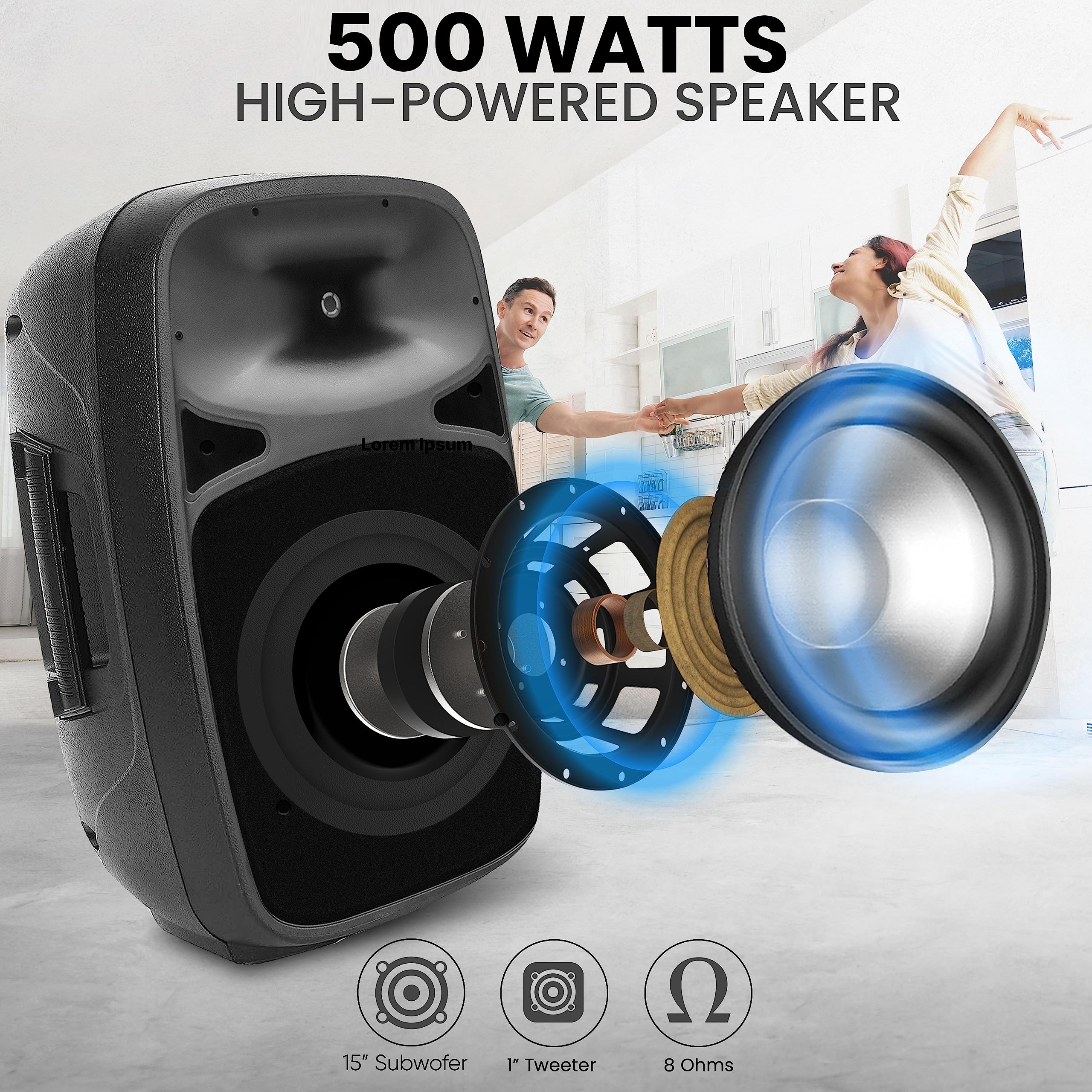 IDEAL FOR ALL OCCASIONS - Whether hosting a karaoke night, throwing a party, or want a PA system for a stage performance, this 500W portable speaker system is perfect for any event. It’s built for home, studio, or outdoor use, providing clear audio