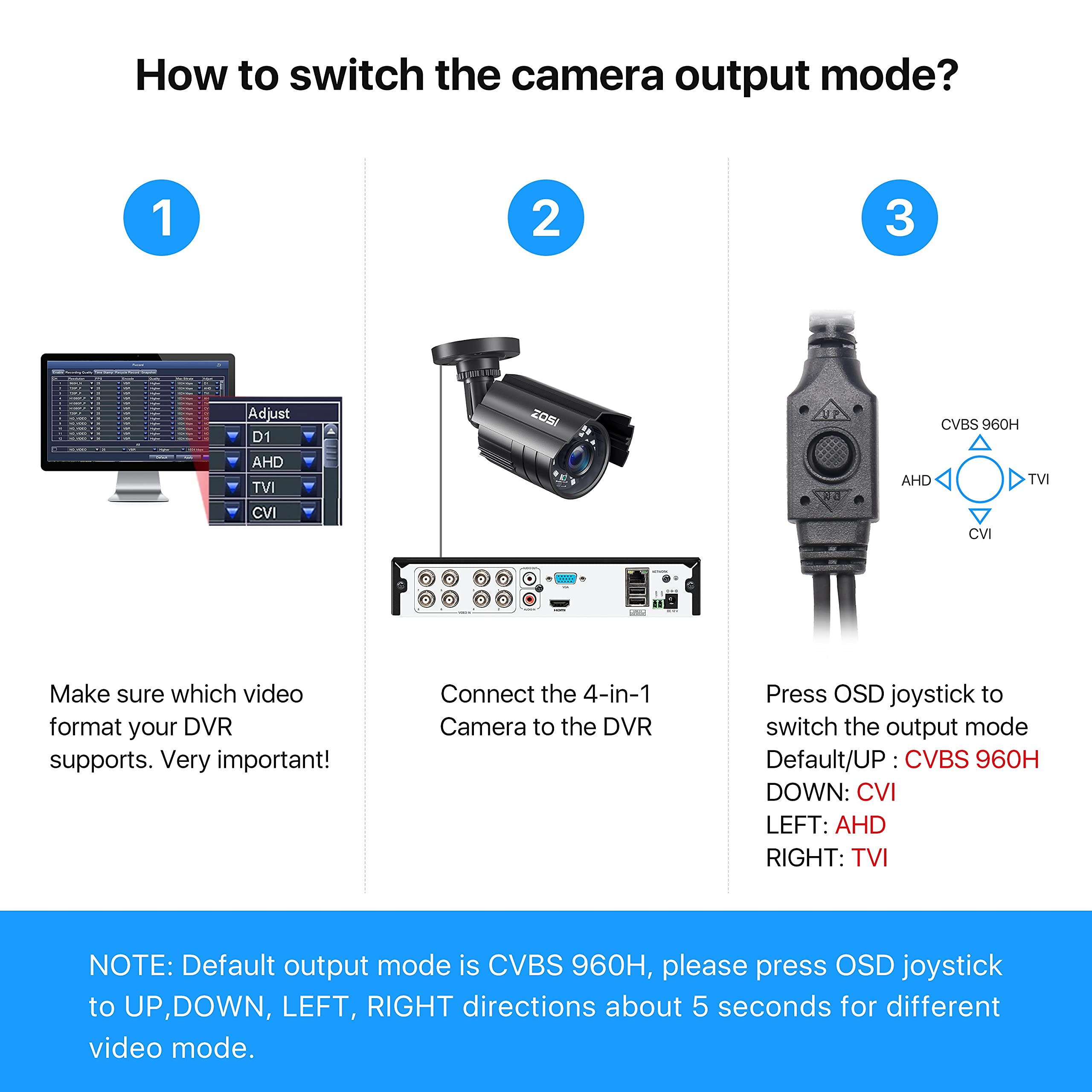 【Bulit in OSD Menu】-- It comes with OSD Menu which can change 4 different video output. 1080P AHD, 1080P CVI, 1080P TVI and 960H CVBS .Default Video mode is 960H mode, compatible with all analog DVRs. 1080P video mode must be switched according to your 1080P DVR type. Widely Usage: With OSD Menu, you can change signal mode freely and quickly in 5 seconds.