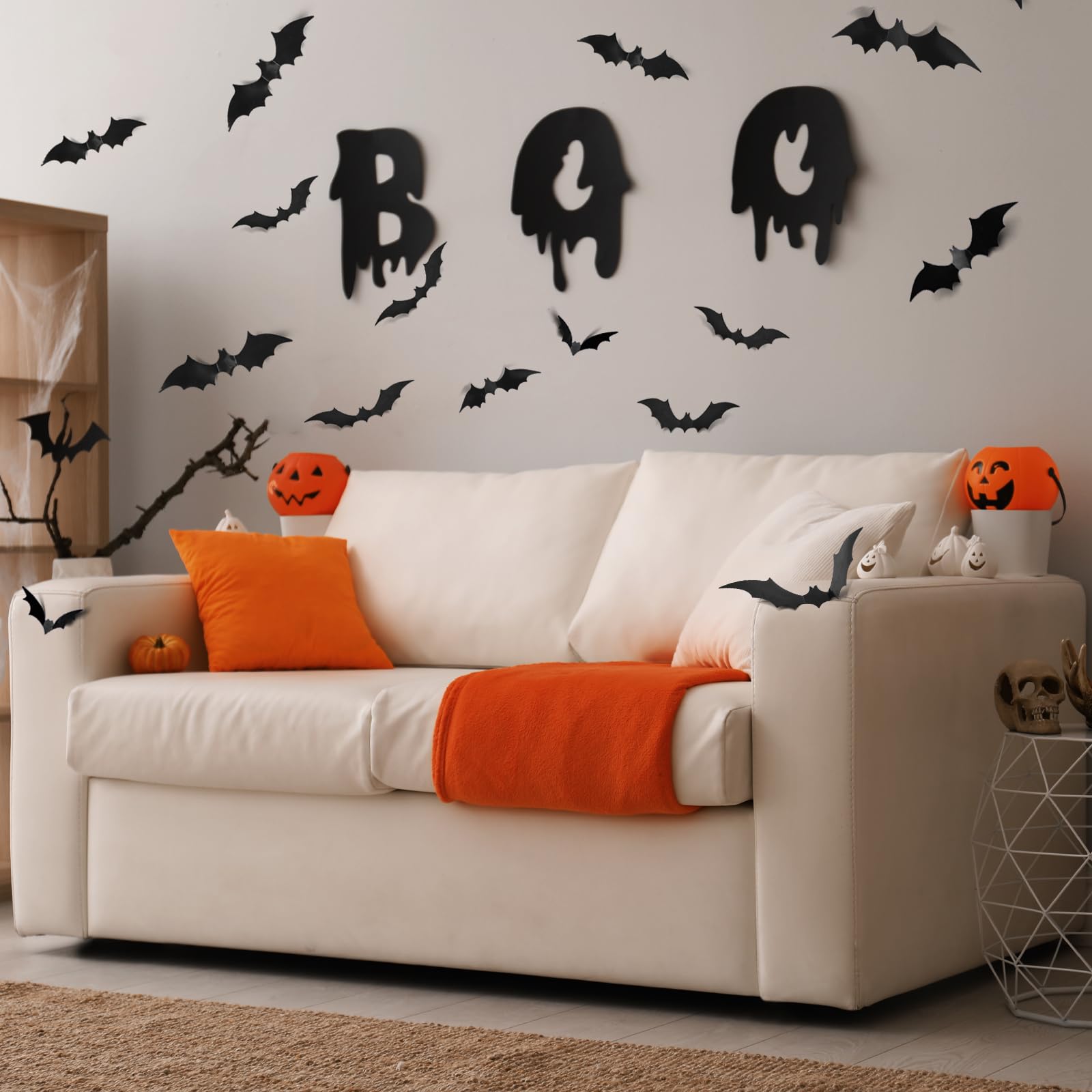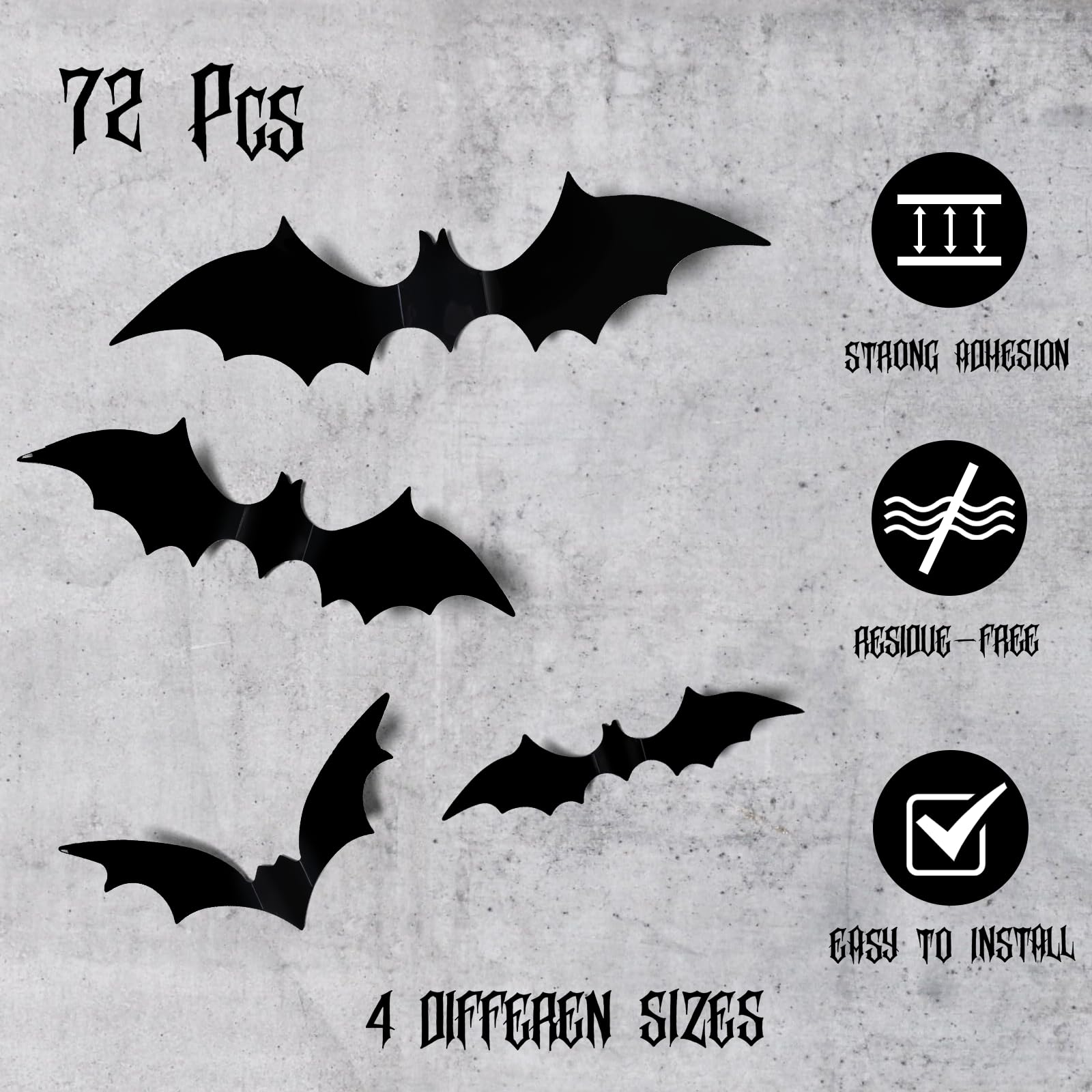GREAT VARIETY AND STYLES: This set includes 72 bat wall decals in 4 different shapes and sizes, available in black. Offering great value, these bats will meet all your decorating needs! Stick them on walls, windows, doors, stairs, tables, refrigerators, and more. They’re perfect for any dry, smooth surface in your living room, bedroom, bathroom, and beyond.