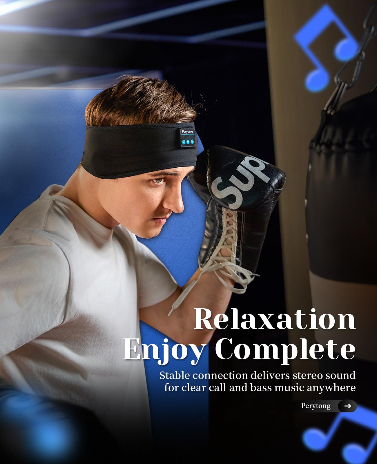 【Sleep Headphones & Sports Headband 2 in 1】Perytong Bluetooth headband allows you to listen to music without having to wear additional headphones, and protect you from being disturbed by your mess hair and sweat. Built-in microphone to let you won't miss any callings. Wireless sleep earbuds perfectly suitable for gym, workout, running, yoga, sports, other outdoor activities and take a nap indoors or in the office as a sleep mask with bluetooth headphones