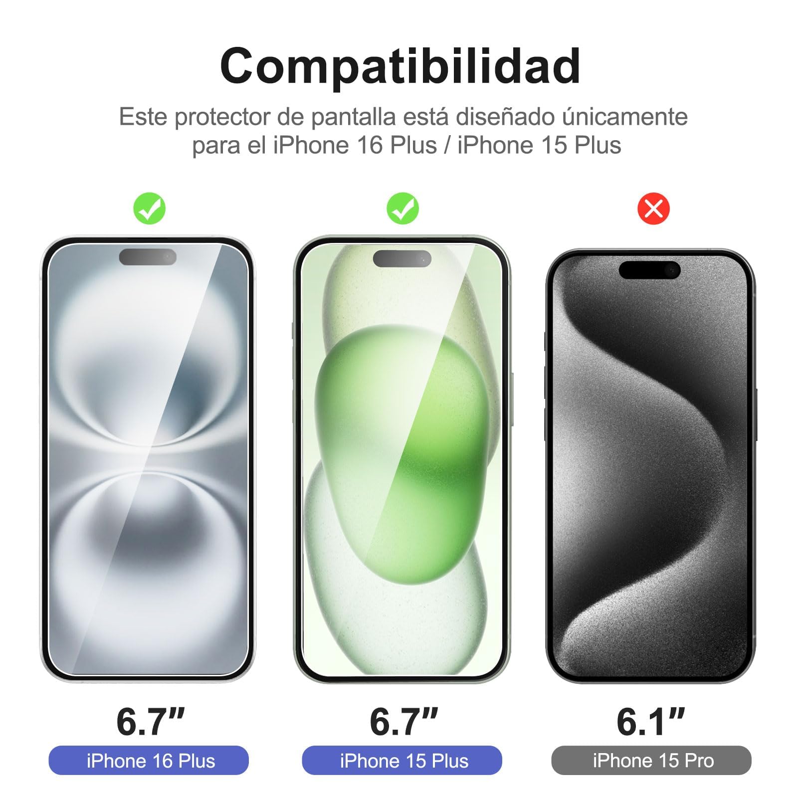 Content: 3 Tempered Glass Screen Protectors for iPhone 16 Plus,15 Plus (6.7 inches) and an easy installation tool. 9H hardness, scratch resistance. Enhanced touch response and super transparency.