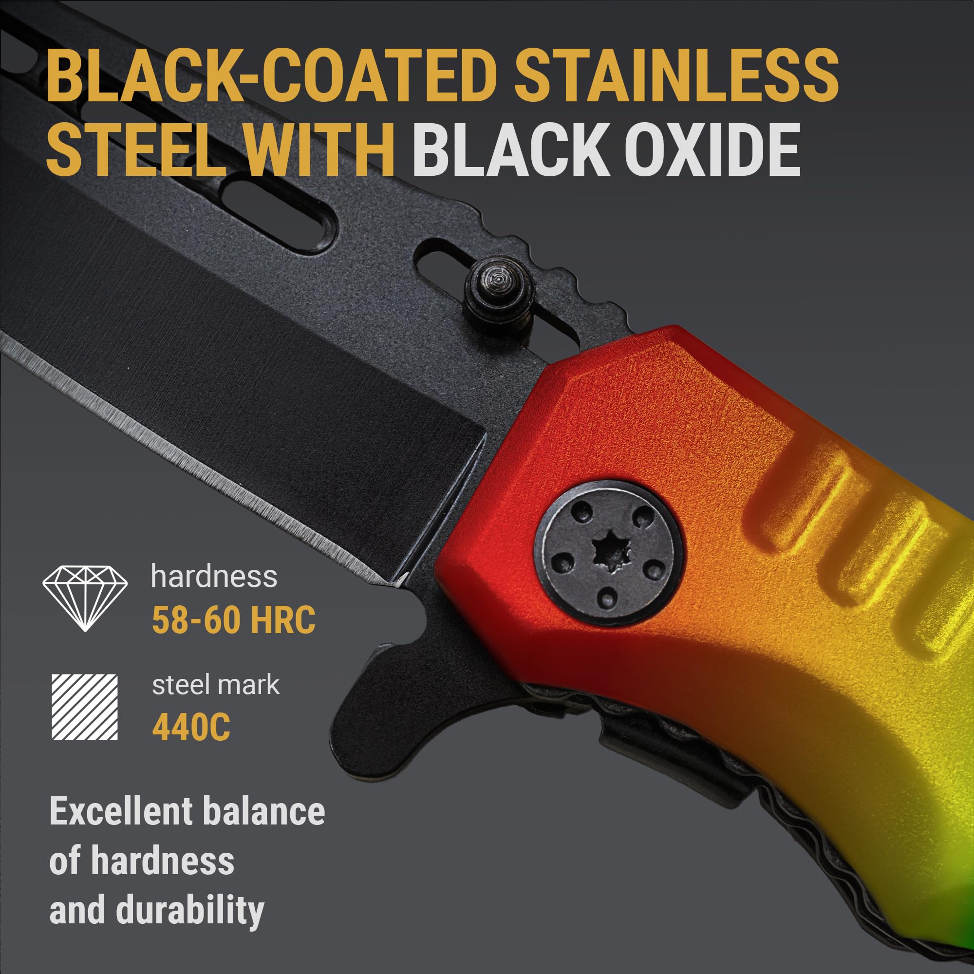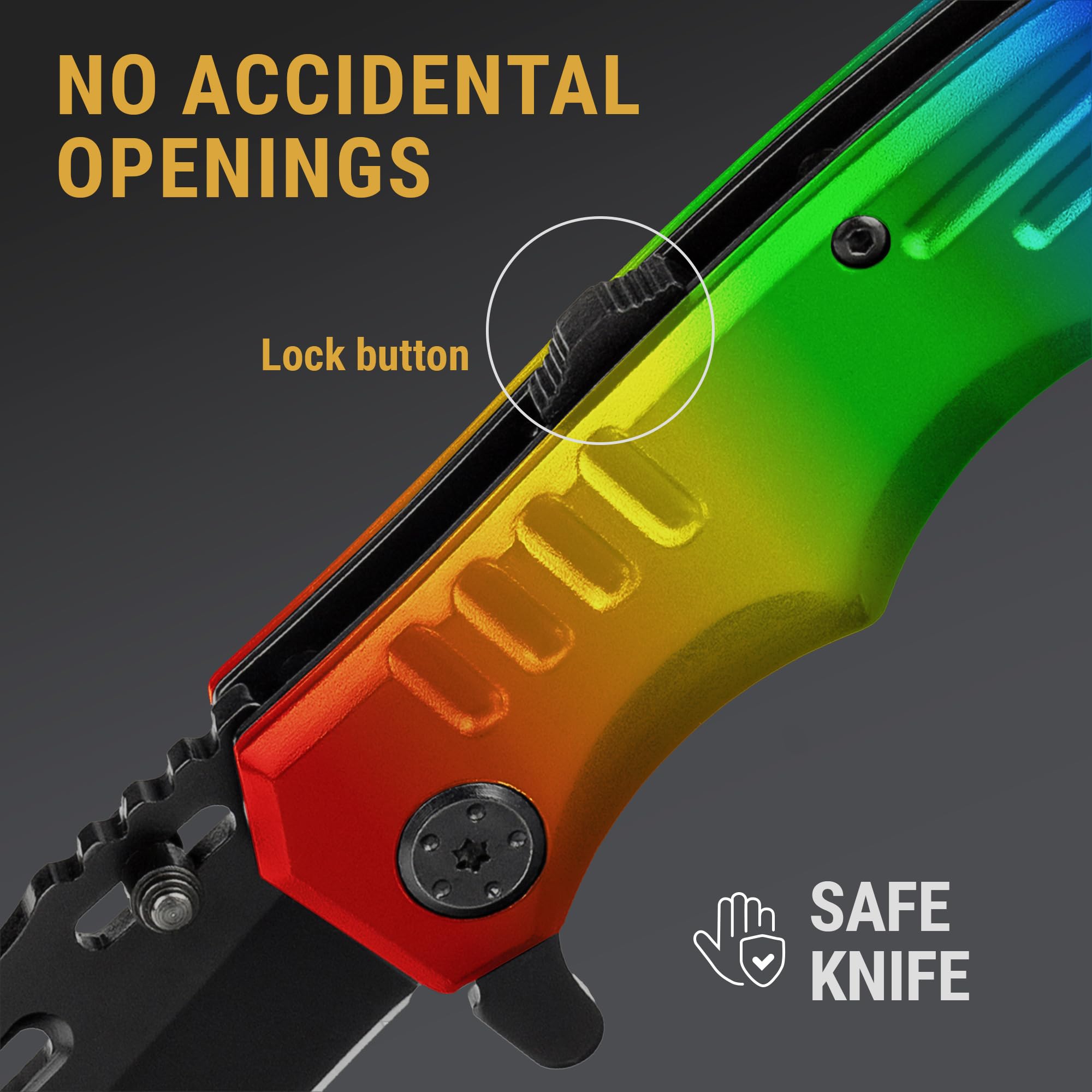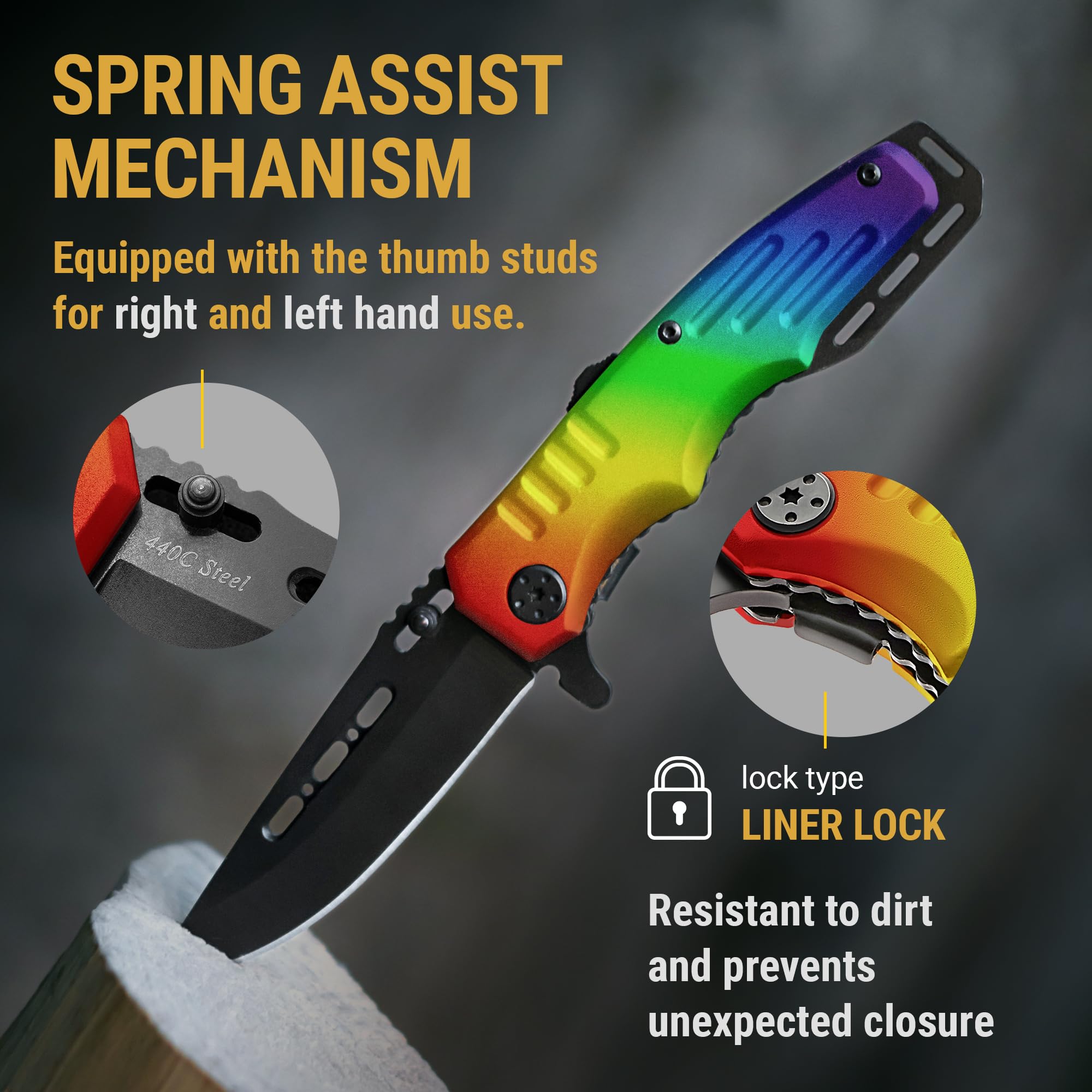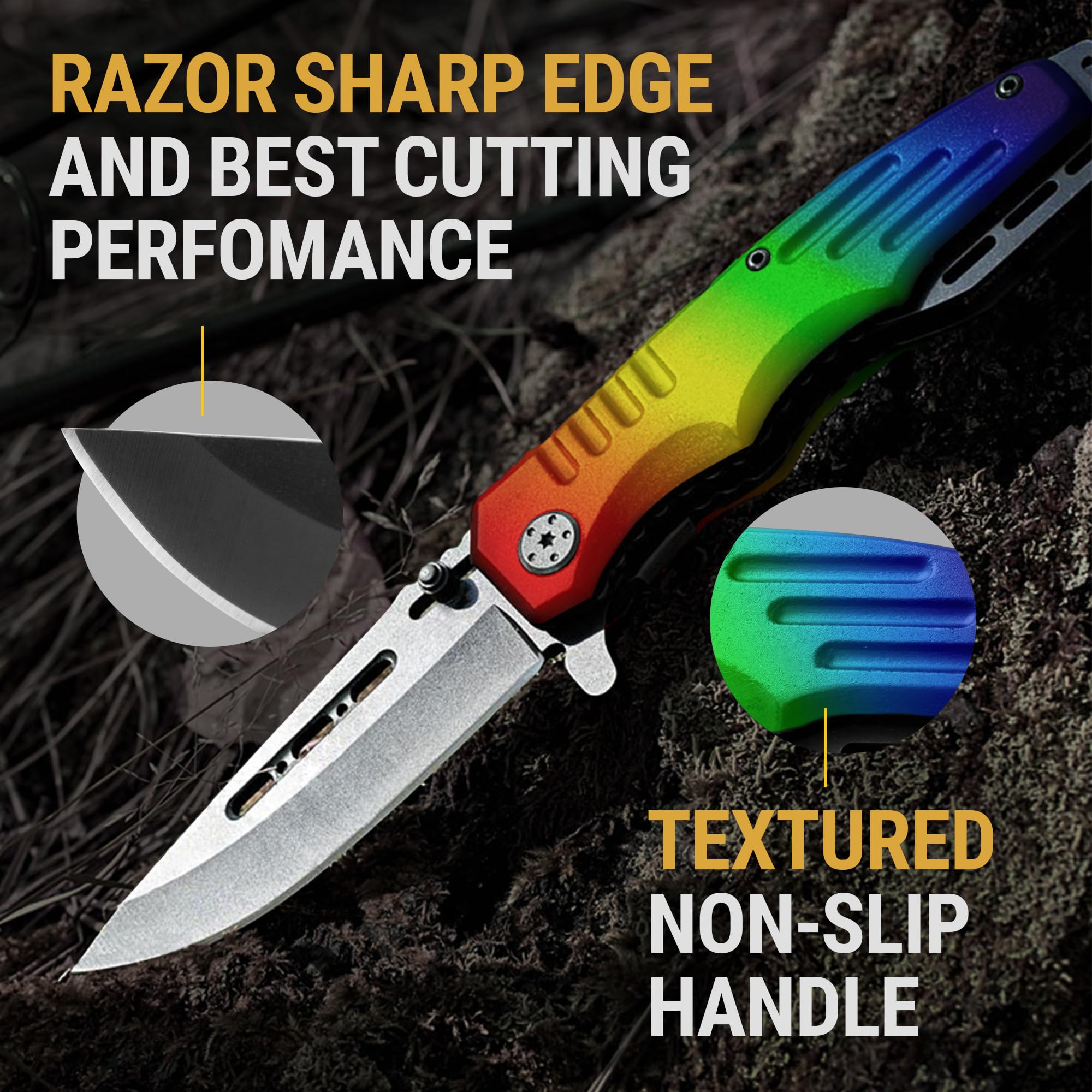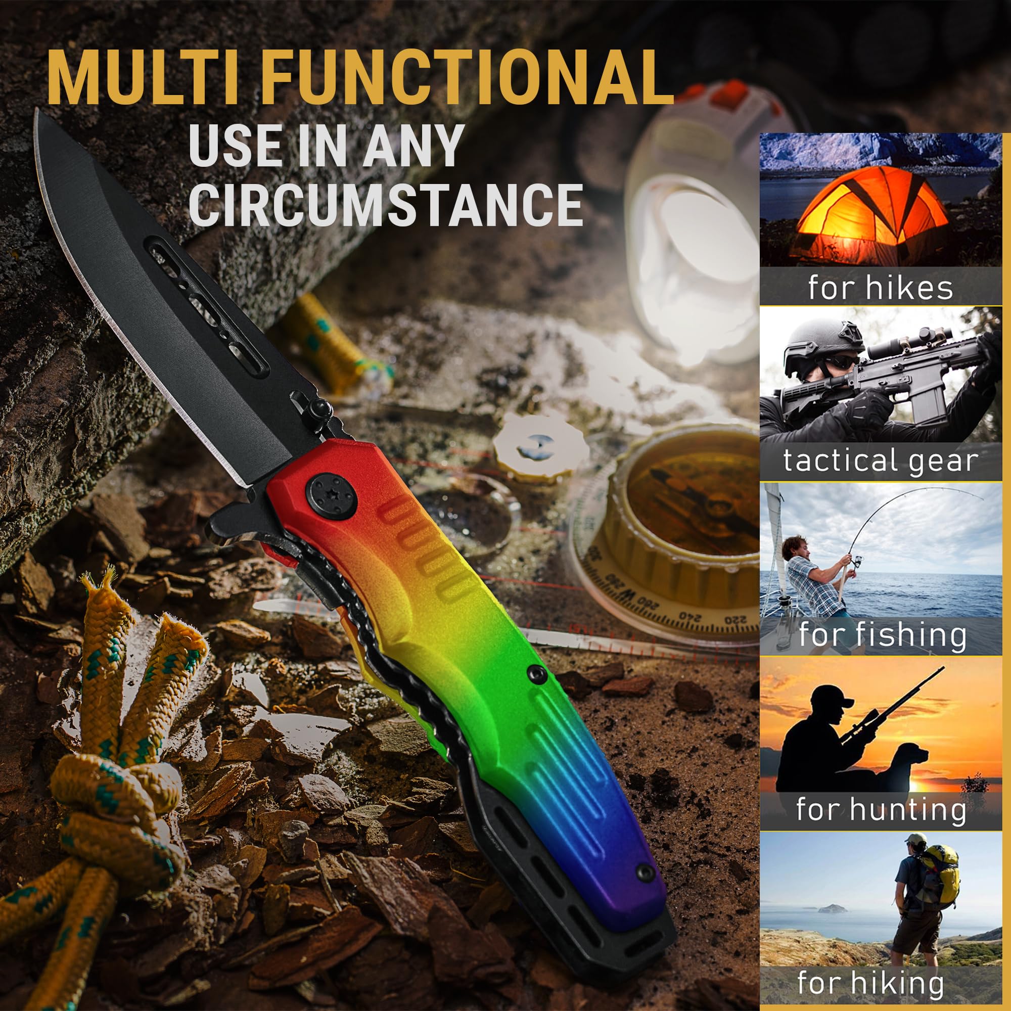 Rainbow pocket knife for men and women, made with high-quality stainless steel 440C and an aluminum handle for durability and comfort. It includes a pocket clip for easy carry and a reliable liner lock mechanism for safety. With thumb studs for effortless opening, this foldable knife combines sharpness, functionality, and a colorful design.