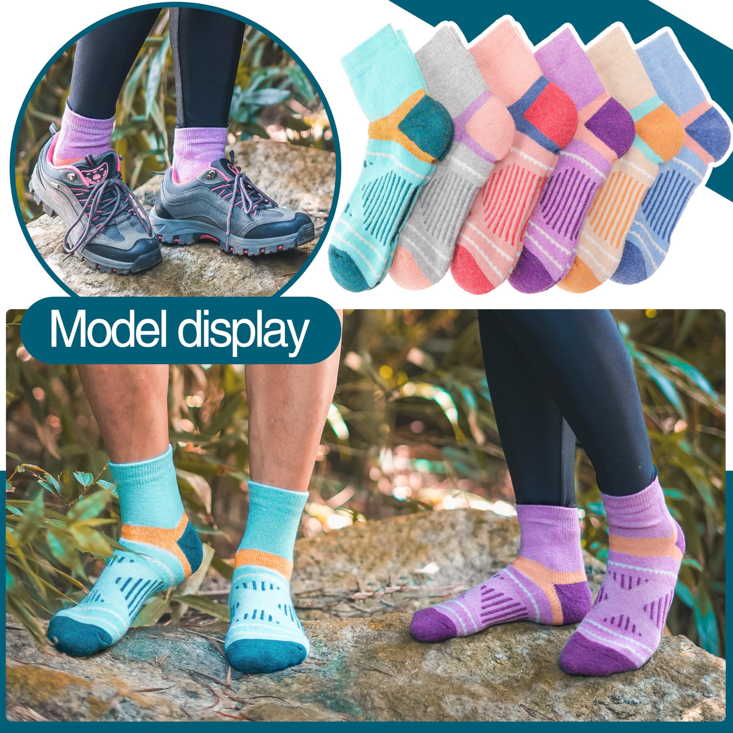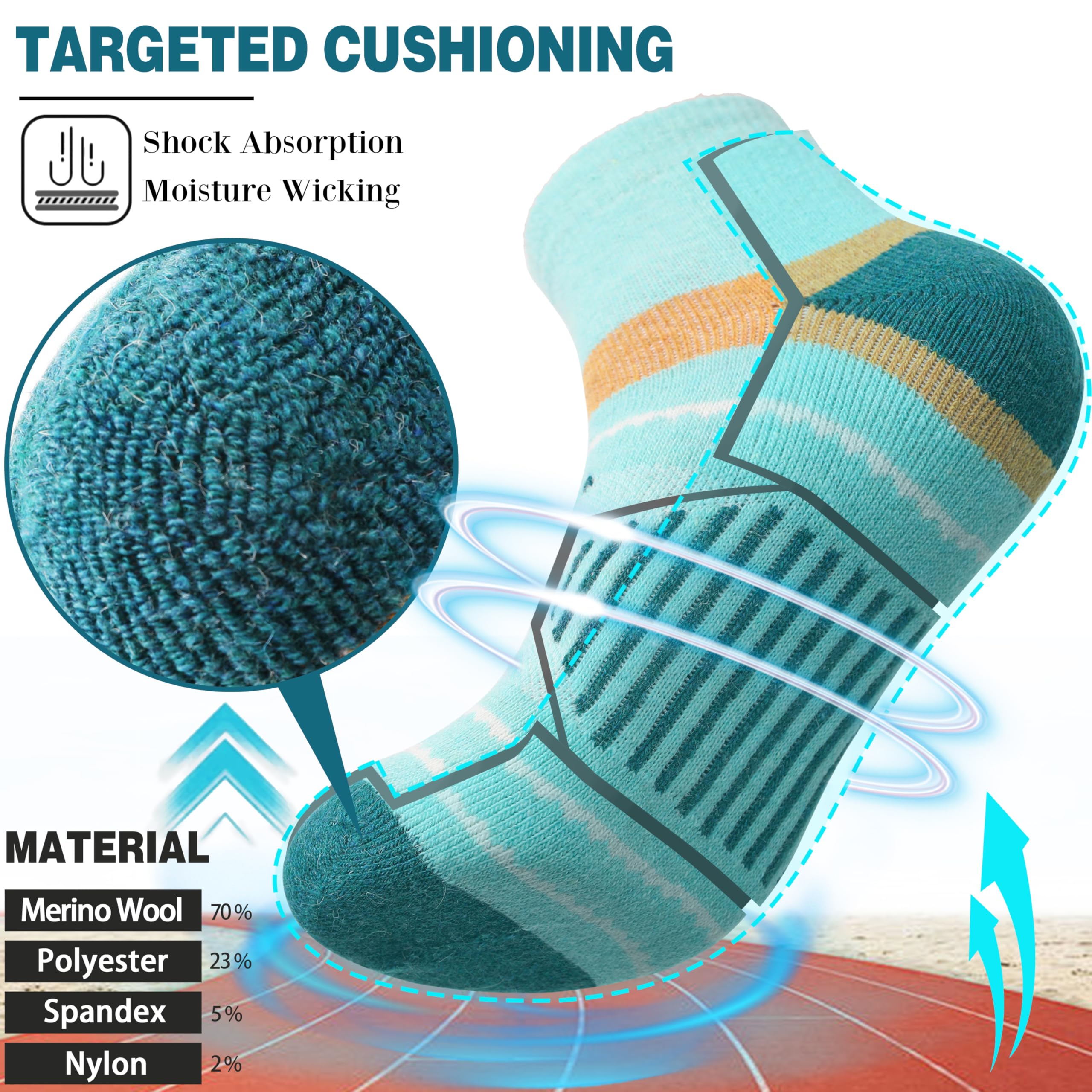 SELECTED MATERIAL - These hiking ankle socks for women are made of 70% MERINO WOOL, 23% polyester, 5% spandex , 2% nylon. They can keep the temperature and warm up your feet in cold weather. And the premium merino wool has great odor resistant property.