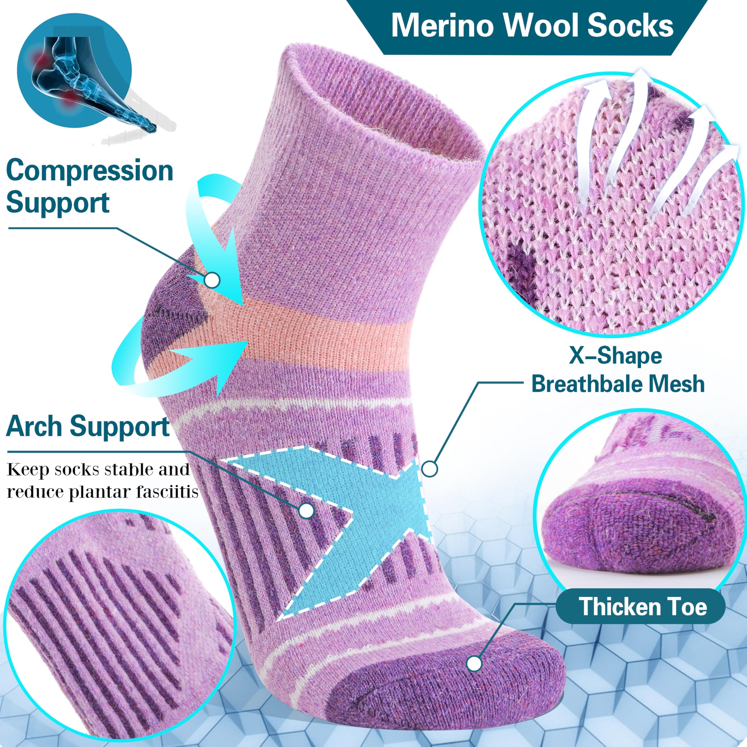 COMPRESSION SUPPORT- Targeted compression stripes can protect your achilles and reduce plantar fasciitis. High elastic fabric can enhance the blood moving, relieve symptoms varicose and keep socks stable. Anti abrasion tab prevents socks from slipping. These merino wool socks can greatly improve your comfort in hiking, running, walking, climbing, trekking or everyday wear.