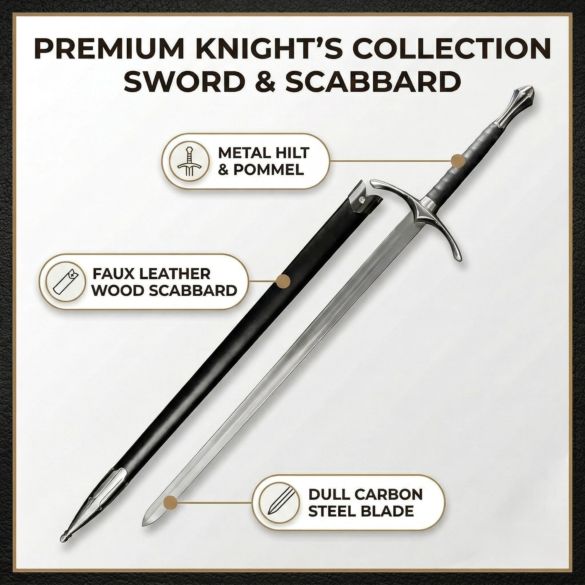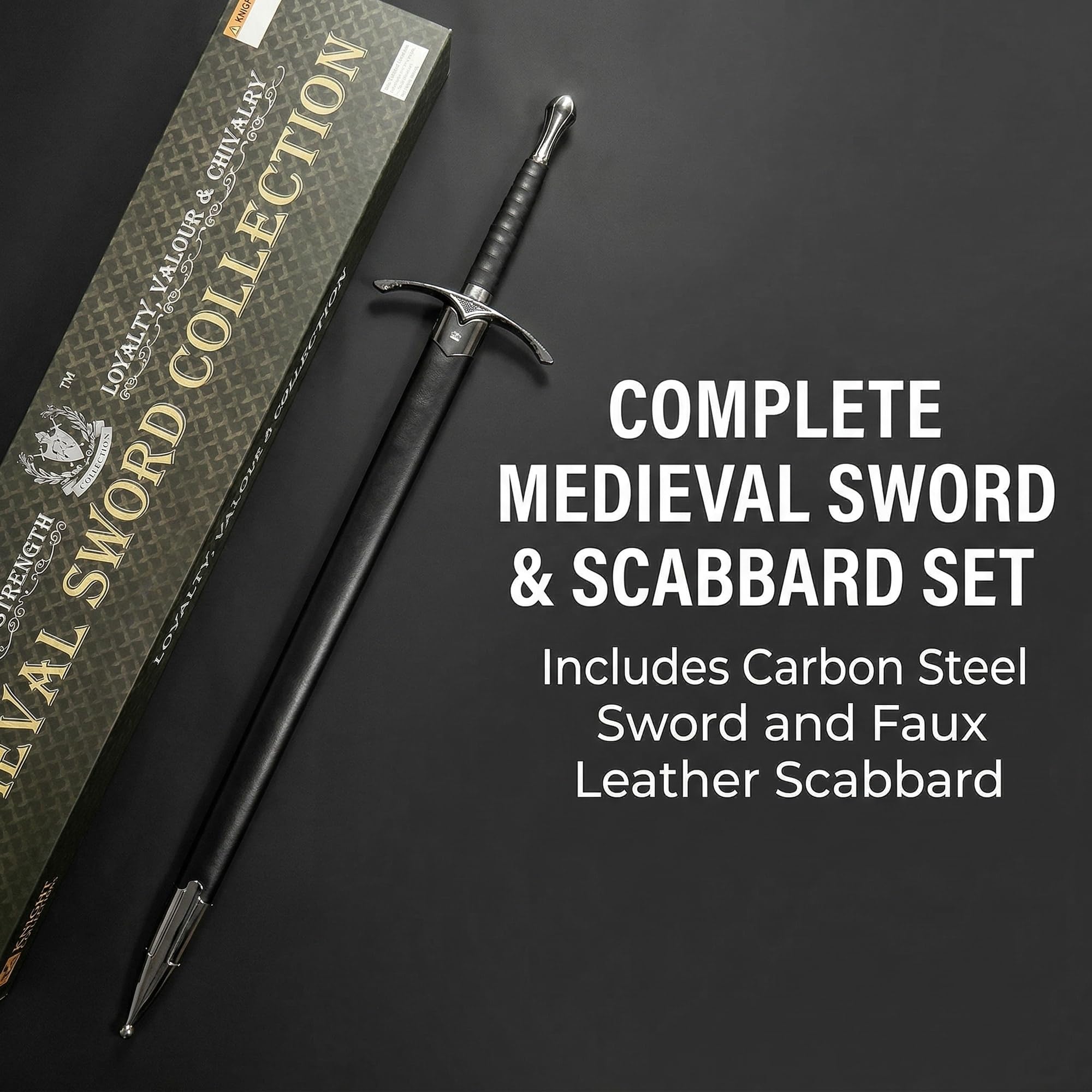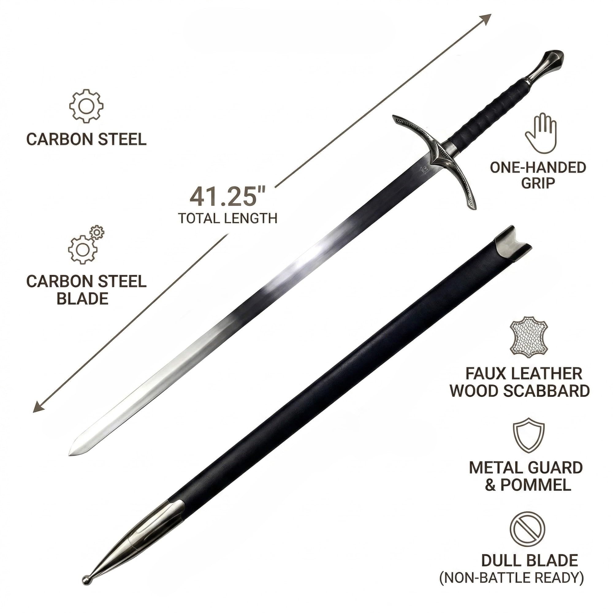 Step into the world of epic fantasy with this elegant one-handed medieval-style sword, designed to evoke the nobility and strength of ancient warriors. Measuring approximately 41.25 inches in total length, this replica sword is a perfect addition to any collection, costume, or live-action roleplay gear set. The blade is crafted from carbon steel with a classic, dull edge—non-sharpened and ideal for display or theatrical use. Its graceful taper and straight double-edged shape mirror the refined styling often associated with high-born knights or elven-inspired warriors. The hilt features a smooth, contoured grip, accented with a silver-toned crossguard and pommel that enhance its regal, timeless look. Included with the sword is a beautifully matched scabbard, crafted from wood and wrapped in faux leather. The scabbard not only completes the look but also allows for convenient transport and storage while maintaining a historically inspired aesthetic. This sword is an excellent choice for cosplay enthusiasts, collectors of medieval or fantasy arms, or anyone seeking a striking decorative piece. Channel the spirit of a legendary champion with this beautifully crafted medieval-inspired sword—where style meets storytelling in a bold, collectible form. This item is intended for decorative, cosplay, and theatrical use only and features a non-sharpened blade. Please check your local laws and regulations before purchasing, as ownership or display of replica swords may vary by region.
