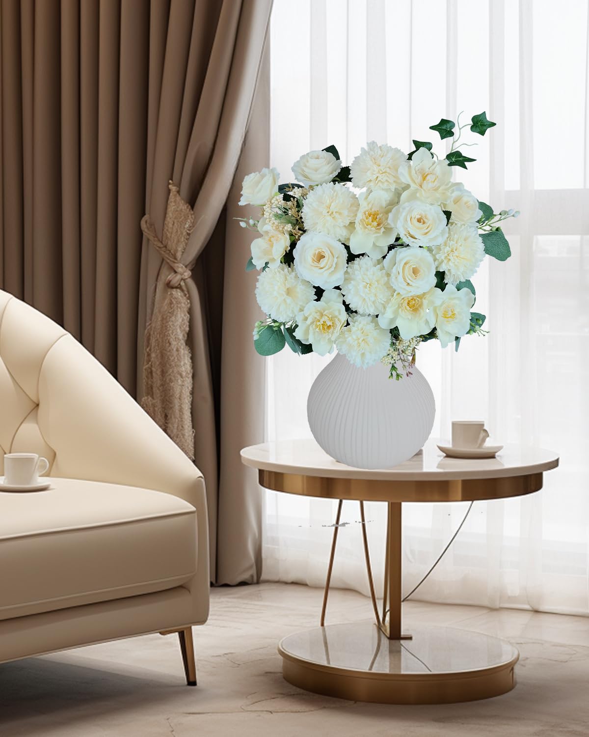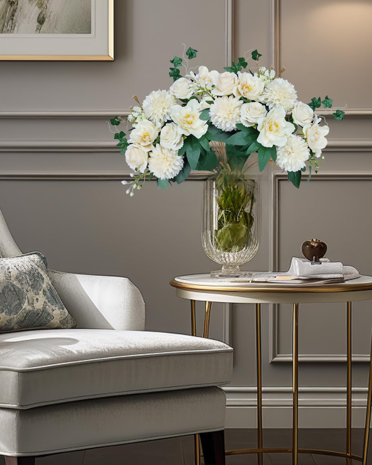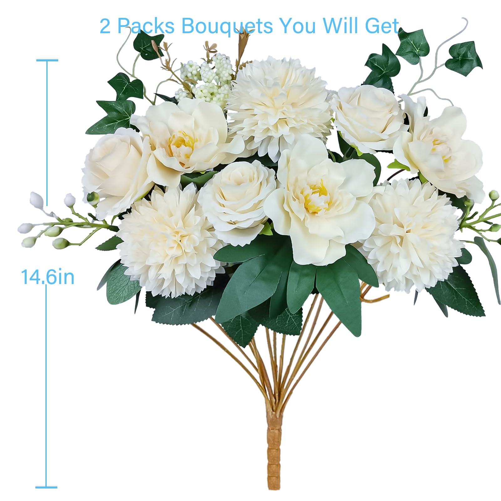 Including - You will get 2 bunches of assorted artificial flowers, each artificial bouquet has 12 fake flowers stems, including 3 big silk Chrysanthemums Ball, 3 fake peonies flowers, 3 artificial roses flowers, 1 bubble silk flower, 2 berries, and dense leaves. Each fake flower bouquet approx 14.6'' in height.