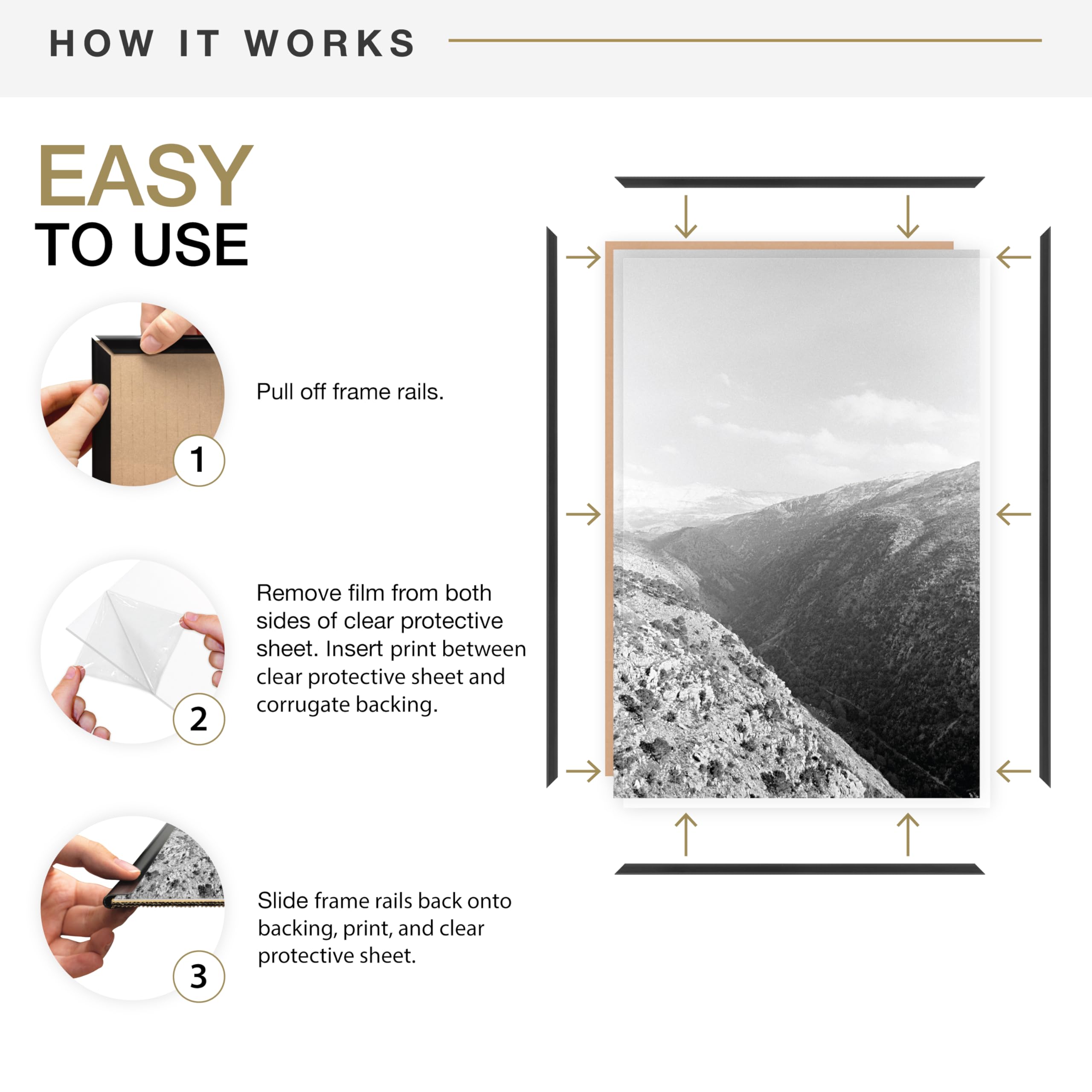 EASY SELF ASSEMBLY: With a quick and easy snap-in-place frame assembly and pre-installed hinged hanging hardware, decorating your space has never been so hassle-free. Frame can be displayed vertically or horizontally for maximum versatility.