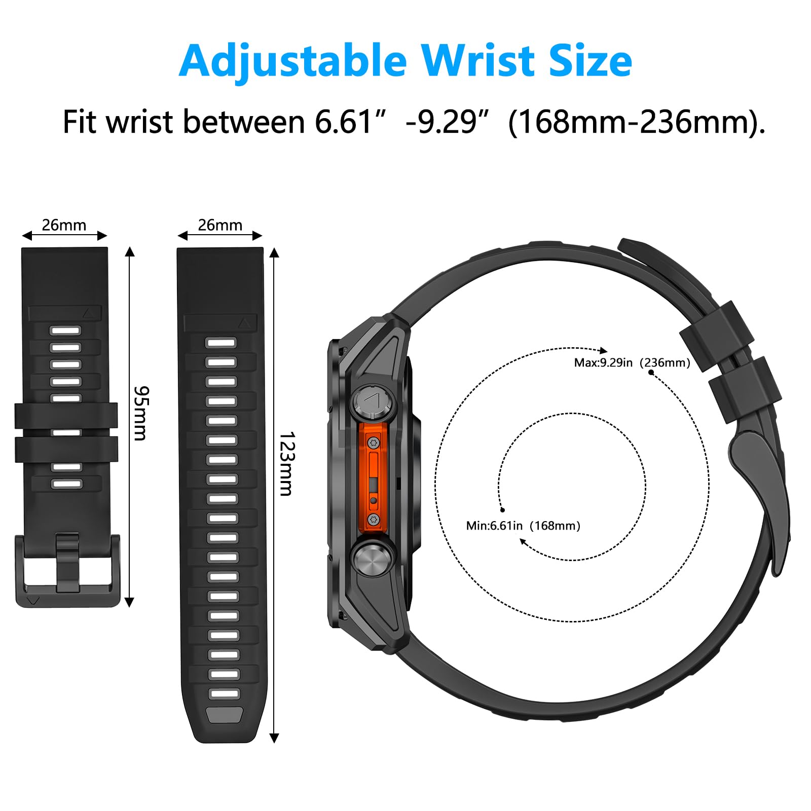 Suitable Wrist Size: Silicone watch strap fit for wrist 168mm-236mm(6.61in-9.29in),please kindly measure your wrist before purchase
