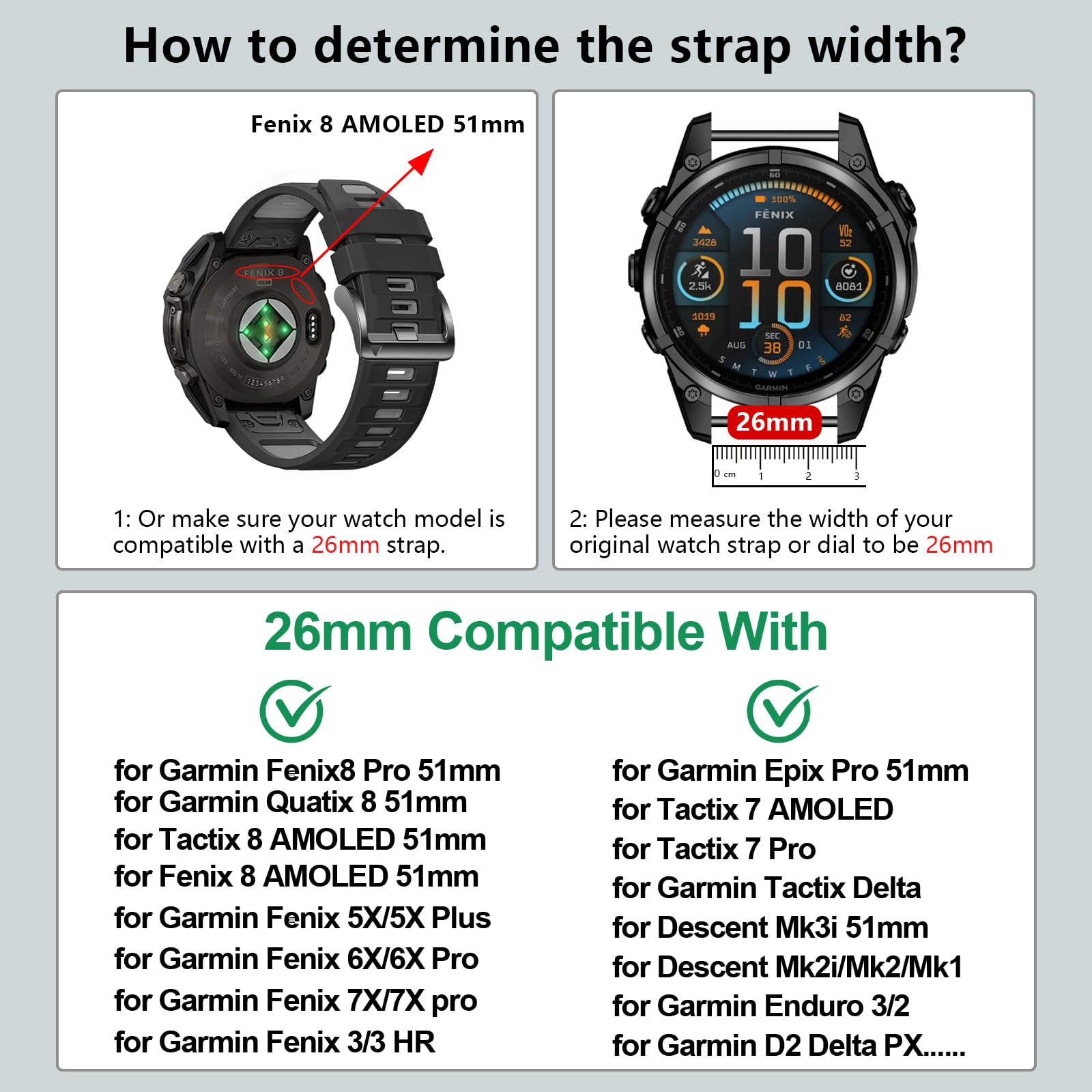 Compatible Models: 26mm Silicone watch bands Compatible with Quatix 8 51mm/Fenix 8 pro 51mm/Fenix 8 AMOLED 51mm/tactix 8 AMOLED 51mm/Fenix 7X pro/7X/Fenix 6X Pro/6X/Fenix 5X Plus/5X/Fenix 3 HR/3/Enduro 3/2/Enduro/Descent Mk3i 51mm/Descent Mk2i/Descent Mk2/Descent Mk1/epix Pro 51MM/tactix 7 AMOLED/tactix 7 Pro/tactix Delta. Please measure whether your original strap is 26mm wide before purchasing