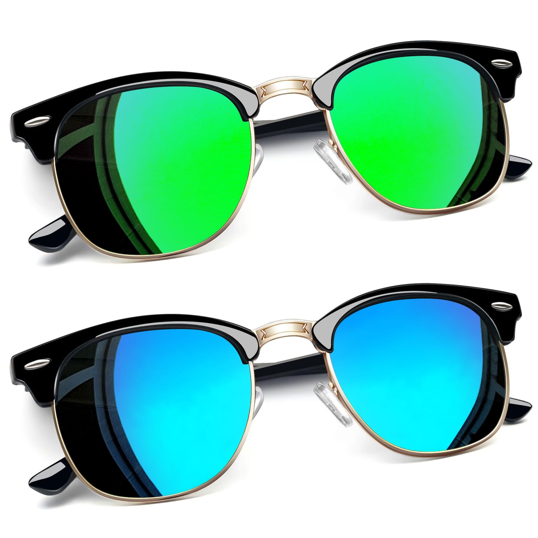 Timeless Browline Style: Club Masters sunglasses date back to the 1950s, were popular in the 1980s, and are still a classic today. Semi rimless sunglasses have a solid plastic browline area, with sturdy wire metal frame, soft silicone nose pads, double-burst metal hinges, and polarized lenses make retro mirror sunglasses perfect for everyday use. 2 pack sunglasses, the mirrored blue sunglasses make you attractive, the green sunglasses make you alive