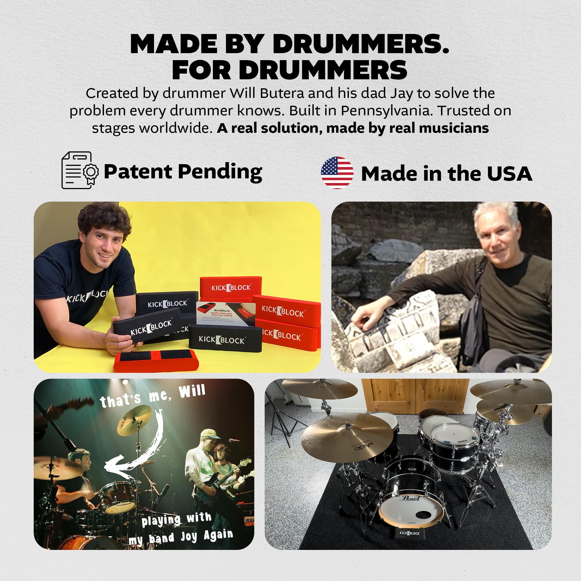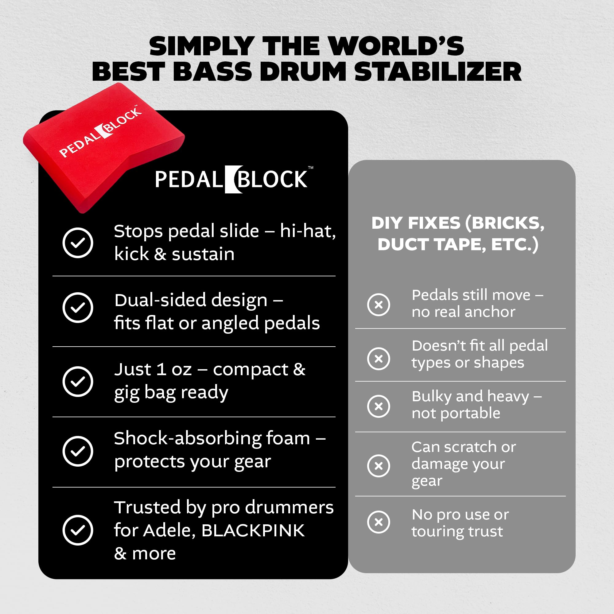 TRUSTED BY PROS & MADE IN THE USA: Used by pro drummers on tour with artists like Beyoncé, BLACKPINK, I Prevail, and many more, PedalBlock features shock-absorbing foam and a patent-pending design. A top-rated drum accessory and a great gift for drummers.