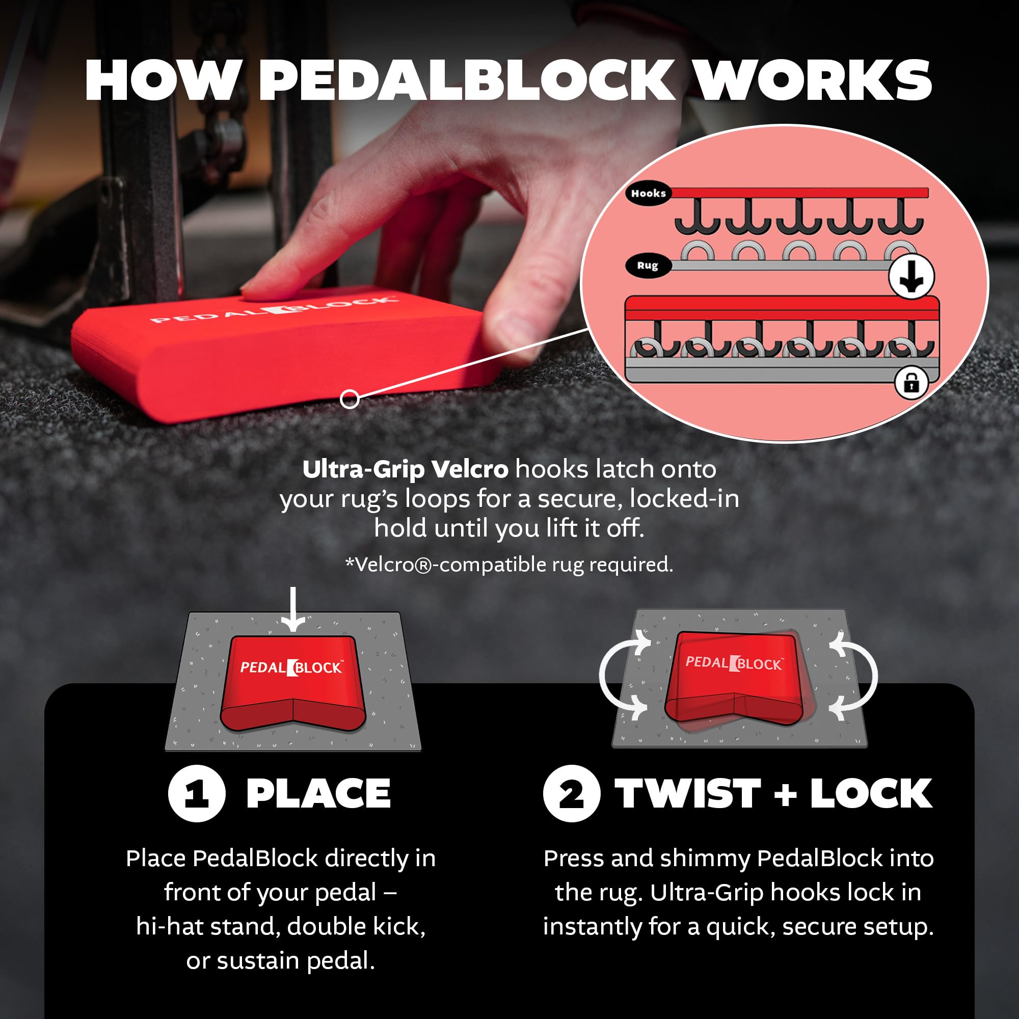 SECURE GRIP ON DRUM RUGS: The Ultra-Grip hook backing holds tight to hook-and-loop-friendly or loop-style drum rugs, locking your pedals in place. Eliminate pedal movement and enjoy consistent, rock-solid performance on every surface.