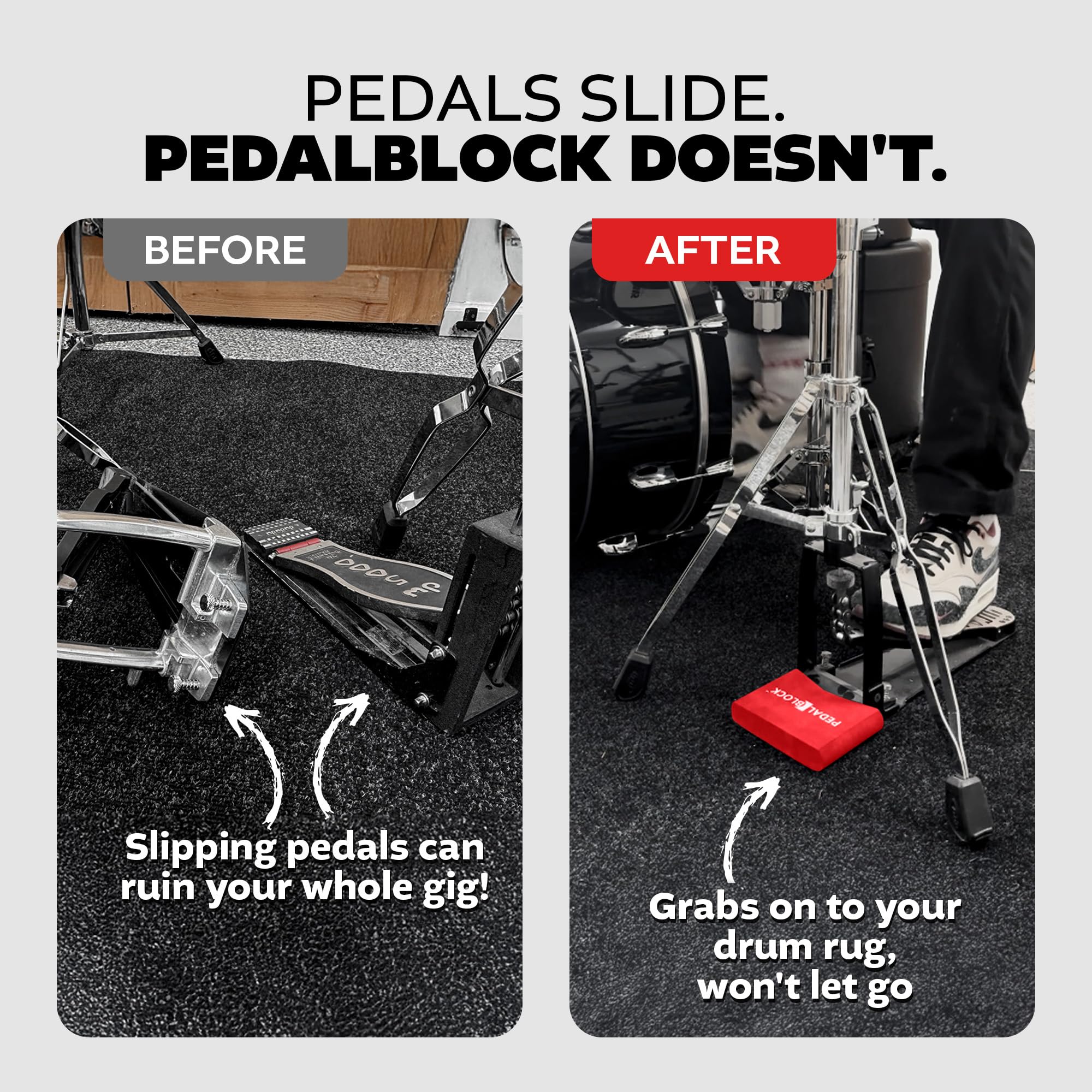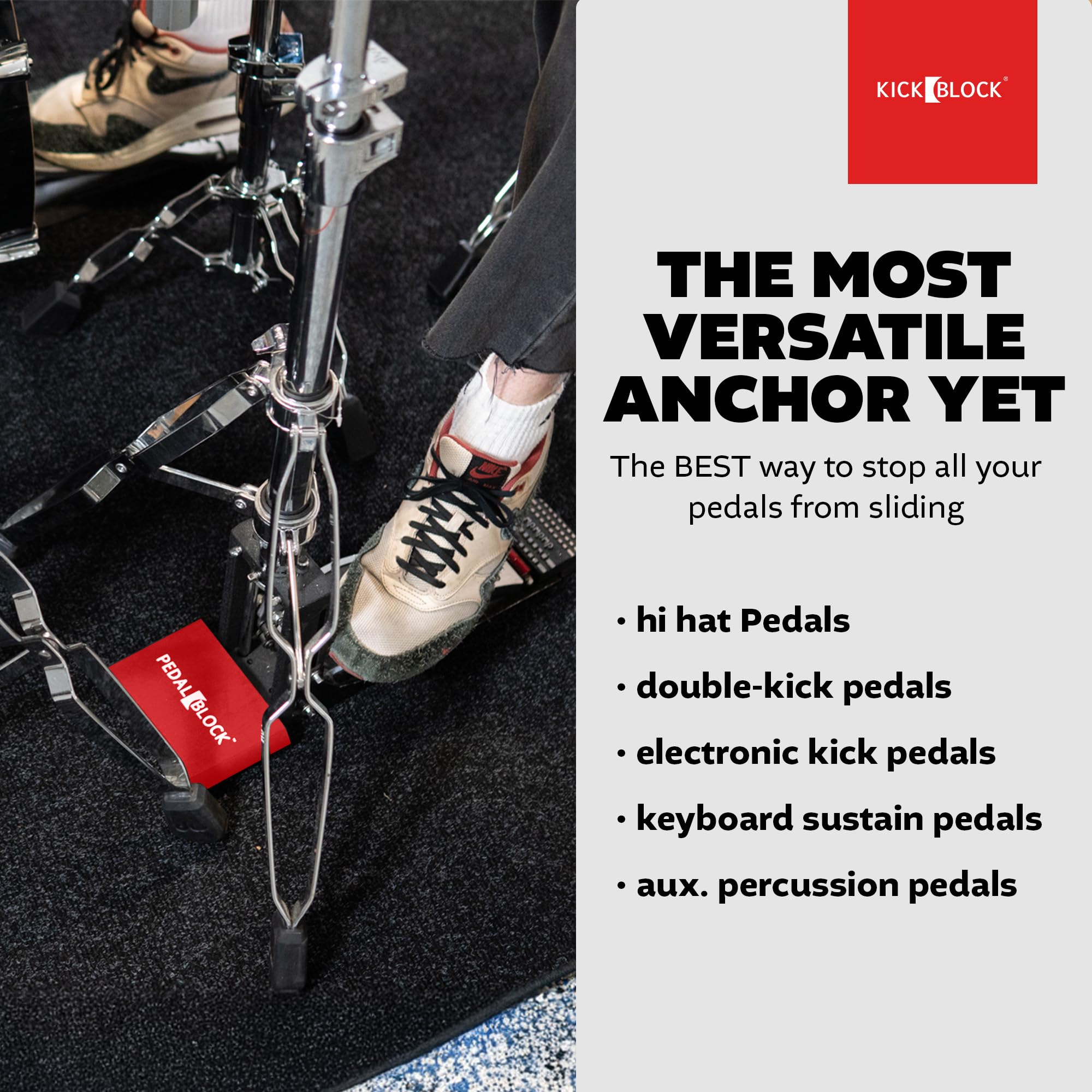 STOPS PEDAL SLIDE & DRIFT: The KickBlock PedalBlock is the drum pedal anchor that keeps your hi-hat stand, double kick, keyboard, or electronic bass drum pedal firmly in place. Play without interruptions or shifting gear.