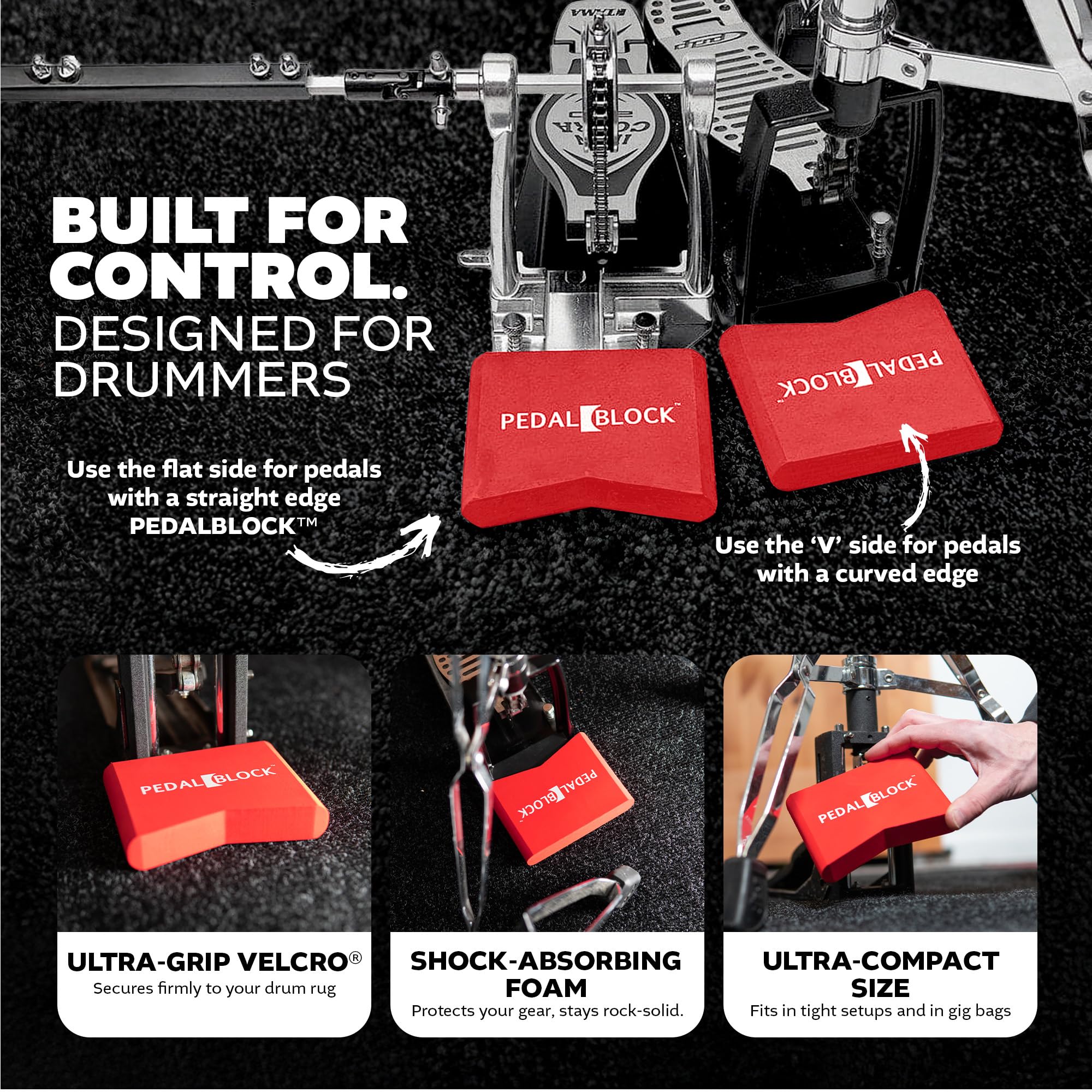 UNIVERSAL FIT FOR ALL PEDALS: With flat and V-shaped sides, this pedal block fits both curved and straight pedal edges. Works with hi-hat, double kick, electronic trigger pedals, and more on acoustic or electronic drum kits. It even works on keyboard sustain pedals.