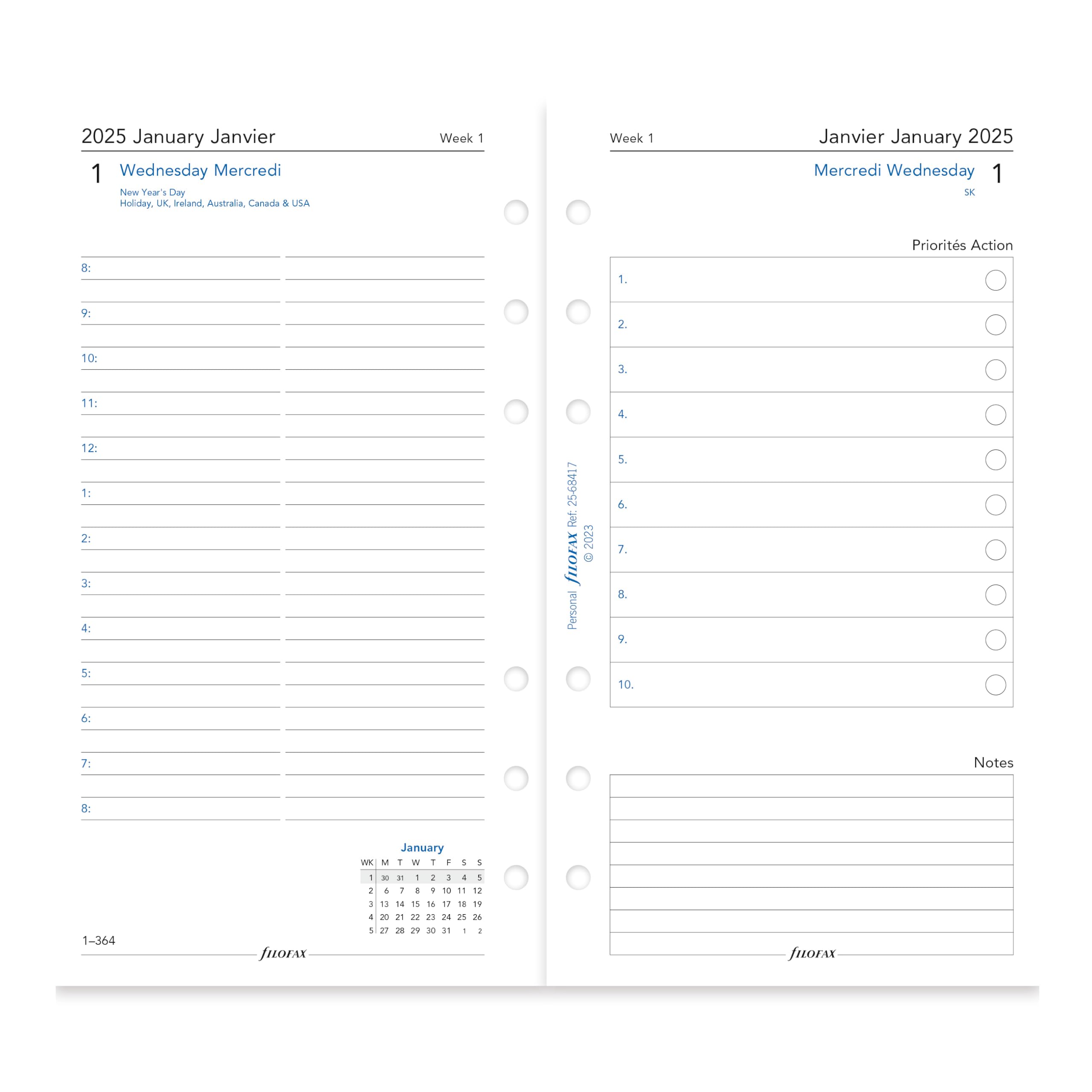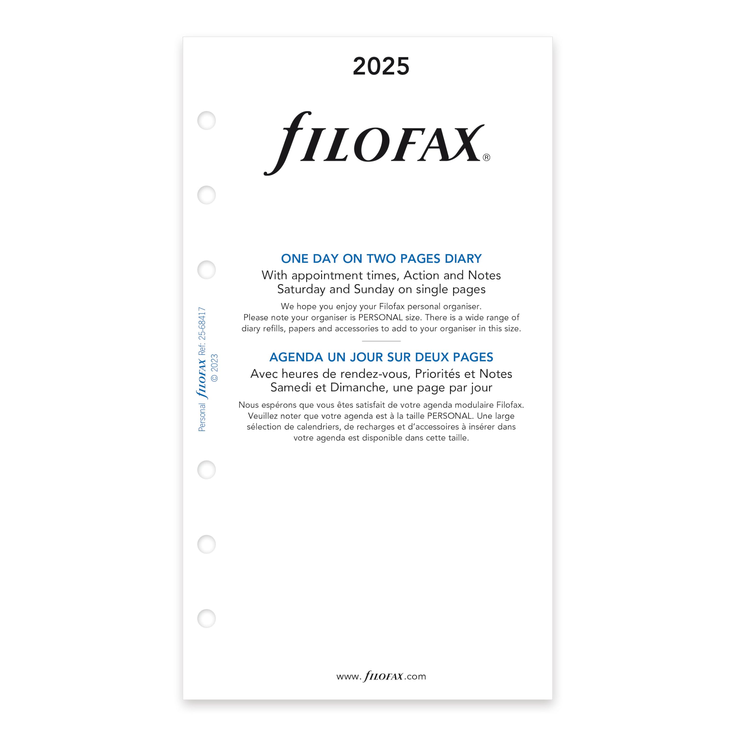 Plan the day in detail with the day on two page diary. Calendar Diary Refill features: Day on two pages with appointments, January to December, 2025. Hourly appointment schedule from 8:00 a.m. to 8:00 p.m. Saturday and Sunday on single pages. Right page has spaces for action items and personal notes. White 80 gsm fountain pen-friendly paper. 328 sheets printed with black and blue ink. Daily dated refill is personal/personal compact size for planners, organizers, agendas and diaries. Bilingual dated calendar diary in two languages: English and French. Over the years, the Filofax organizer has evolved from a simple loose-leaf system into an indispensable everyday accessory. The Filofax logo promises authenticity and the finest craftsmanship. It's a hallmark of impeccable quality, trusted worldwide, since 1921.