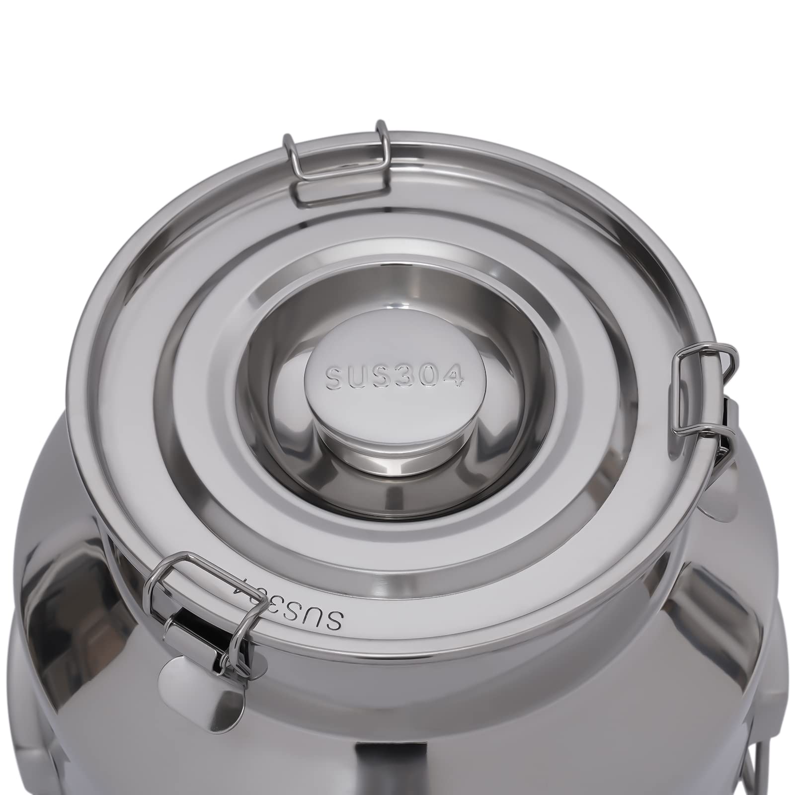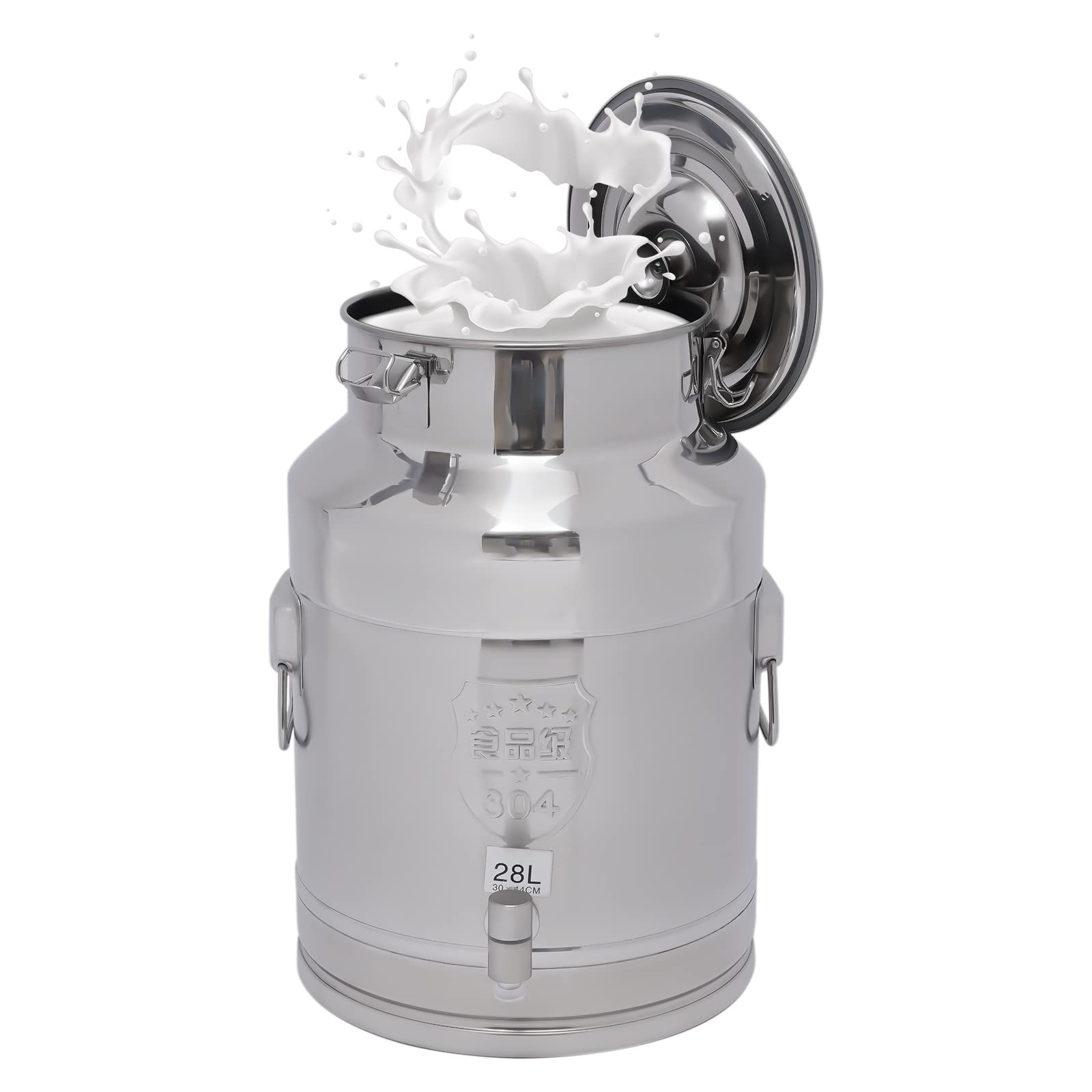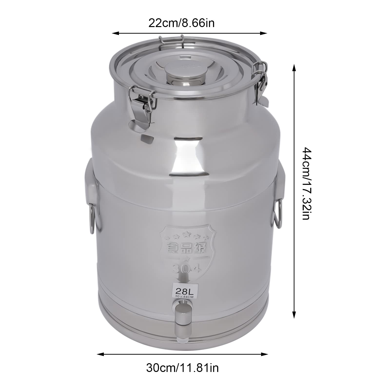 Application This item can use to store milk, wine, food, oil, water, etc. It is widely used in wine, food, pharmaceutical, chemical, electronics, and other industries. The 28L/7.4gal capacity allows it to store 28.58 lbs of oil, 55.12 lbs of water, 44 lbs of wine, or 8.82 lbs of tea. Specifications Material: 304 Stainless Steel Color: Silver Capacity: 28L/ 7.4Gallon Can Bottom Diameter: 30cm/ 11.81inch Top Opening Diameter: 22cm/ 11.81inch Can Height: 44cm/ 17.32inch Net Weight: 5.7kg/ 12.57 lbs Gross Weight: 6.7kg/ 14.77lbs Package Size: 58* 31* 31cm/ 22.83* 12.2* 12.2inch Package Included 1 * Stainless Steel Milk Can 1 * Faucet All Accessories for Use Notes Please allow the slight color difference caused by the shooting light and 1-3cm error due to manual measurement, and make sure you do not mind before you order.