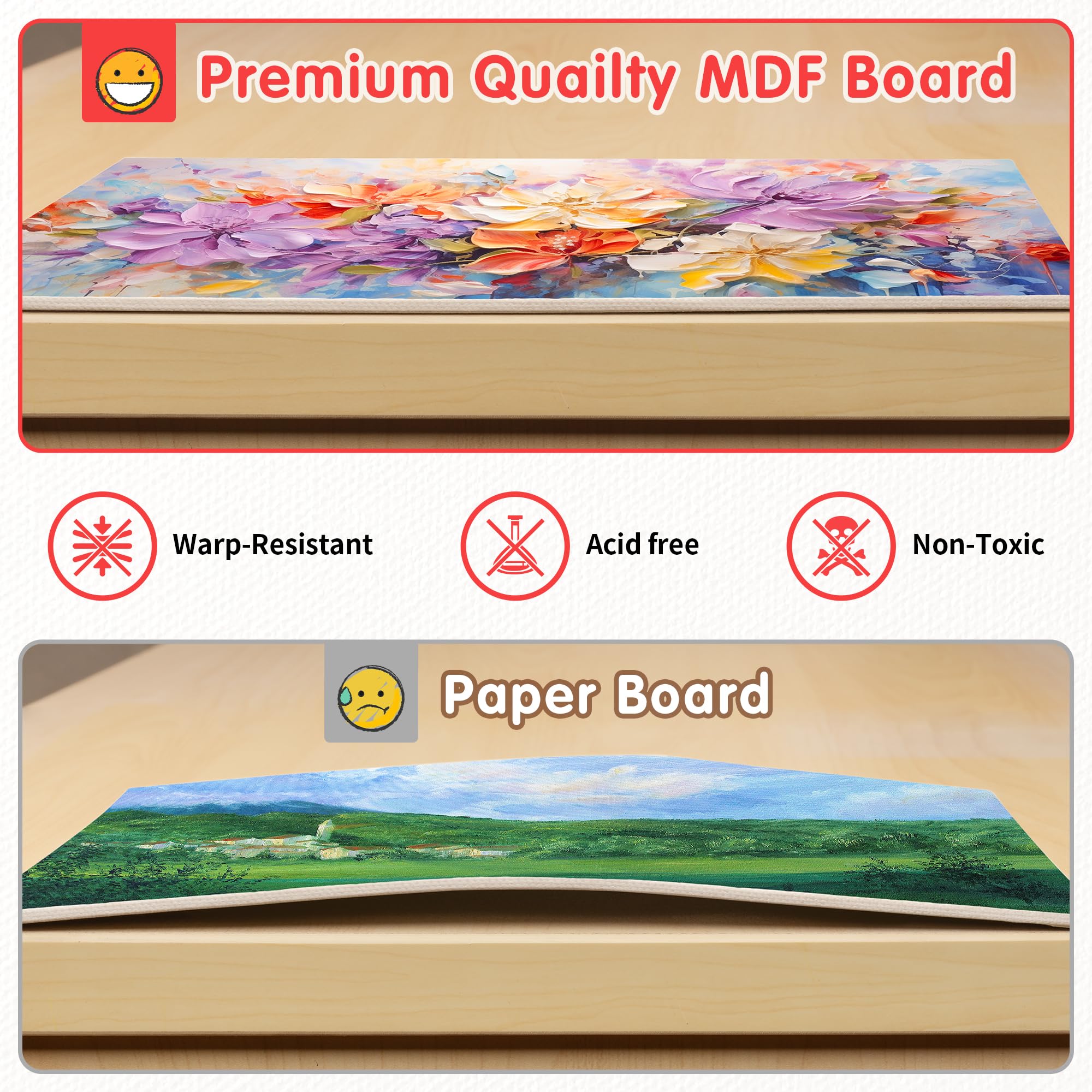 HIGH-QUALITY CORE MDF BOARDS: Our canvas panels are hand stretched and glued over acid-free MDF boards. These boards won't bend or curl, even with heavy paint application. Perfect for trying out new techniques or finding inspiration.