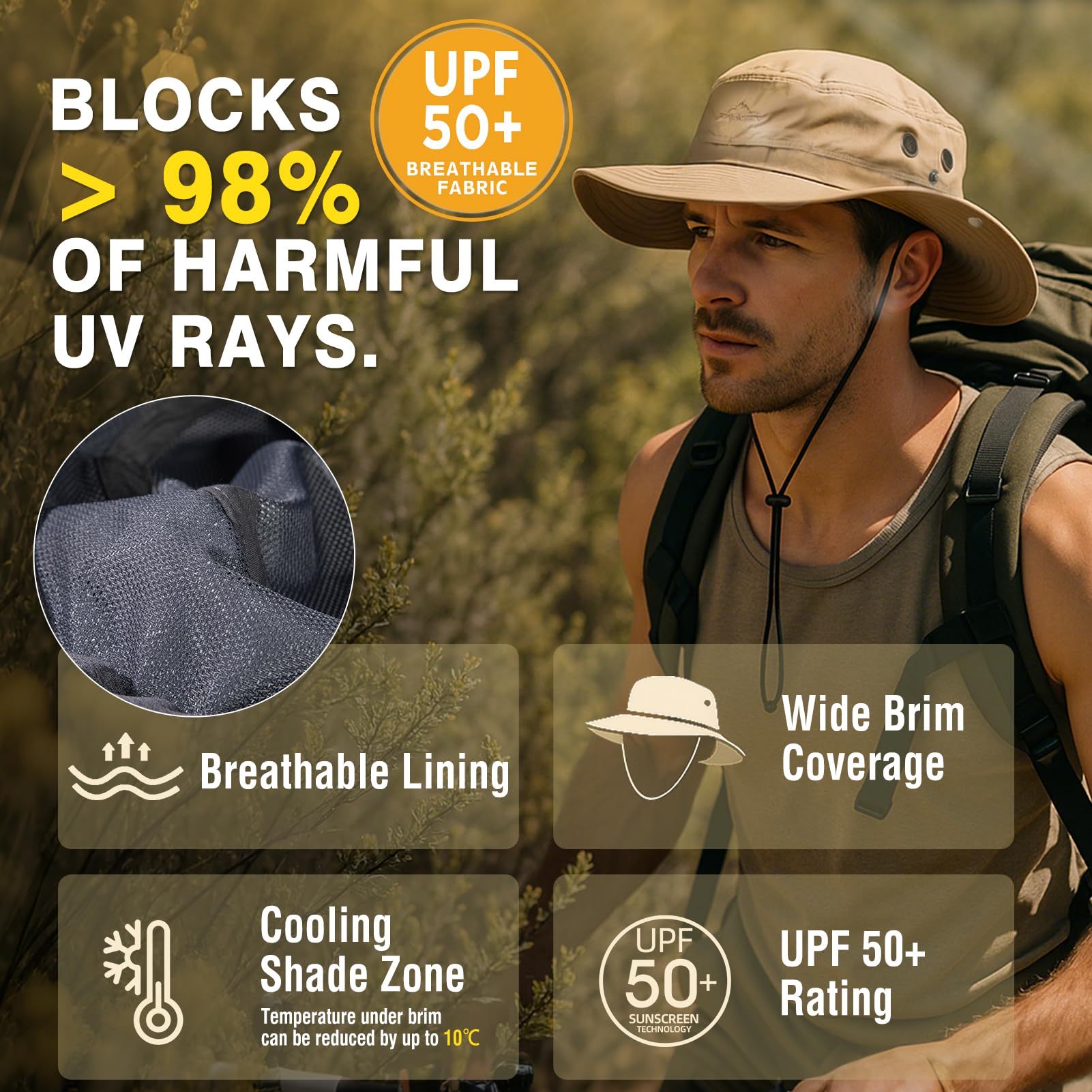 UPF 50+ Sun Protection: 3 inches wide brimmed hat could Block 97.5% of the sun's harmful ultraviolet rays.Our fabric is rated at an unbeatable UPF 50+ (Ultraviolet Protection Factor).These boonie hats are perfect for people who are engaged in outdoor recreation such as fishing, hunting, camping, hiking and many more. With this hat, you can spend more hours in your garden cutting the grass. This time, don't be afraid of the sun and enjoy nature.