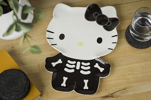 Celebrate Halloween in style with this themed plate! Ceramic plate features Hello Kitty in an adorable skeleton costume. Plate is shaped like Hello Kitty, making this item unique. With her button nose and cute bow, this kawaii character is positively adorable. Cute and functional, this plate is ideal for entertaining. This dish is perfect for serving appetizers, snacks, or desserts at any event, making it a must have for Hello Kitty fans to celebrate in style. Take a dive into the fictional world with Silver Buffalo! Silver Buffalo provides fans with official merchandise from their favorite characters. Working alongside licensors and brands, we create unique and imaginative products which are designed with great care and detail. Silver Buffalo aims to connect fans to their favorite cartoon characters, superheroes, movies, tv-series, and more. Celebrate your fandom!