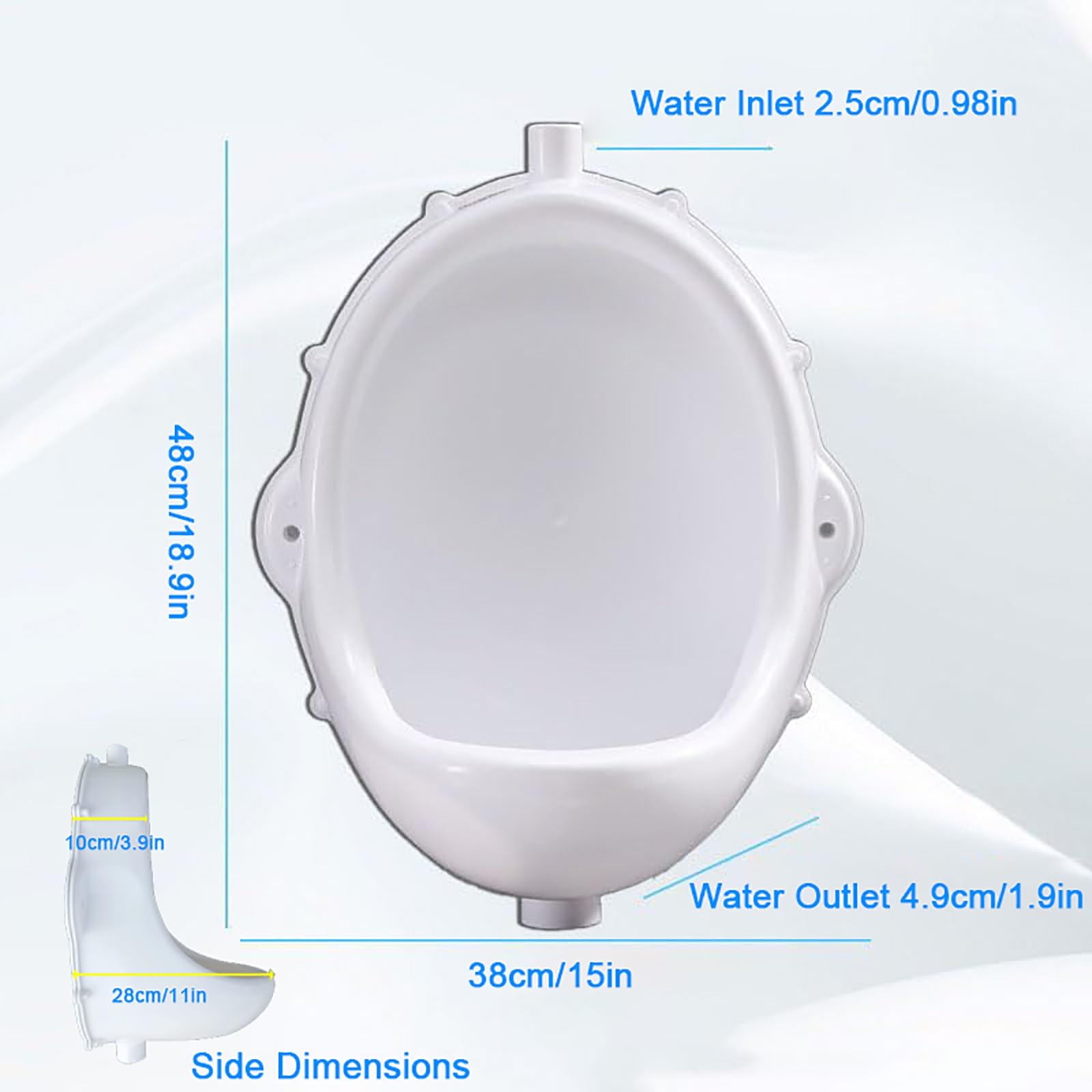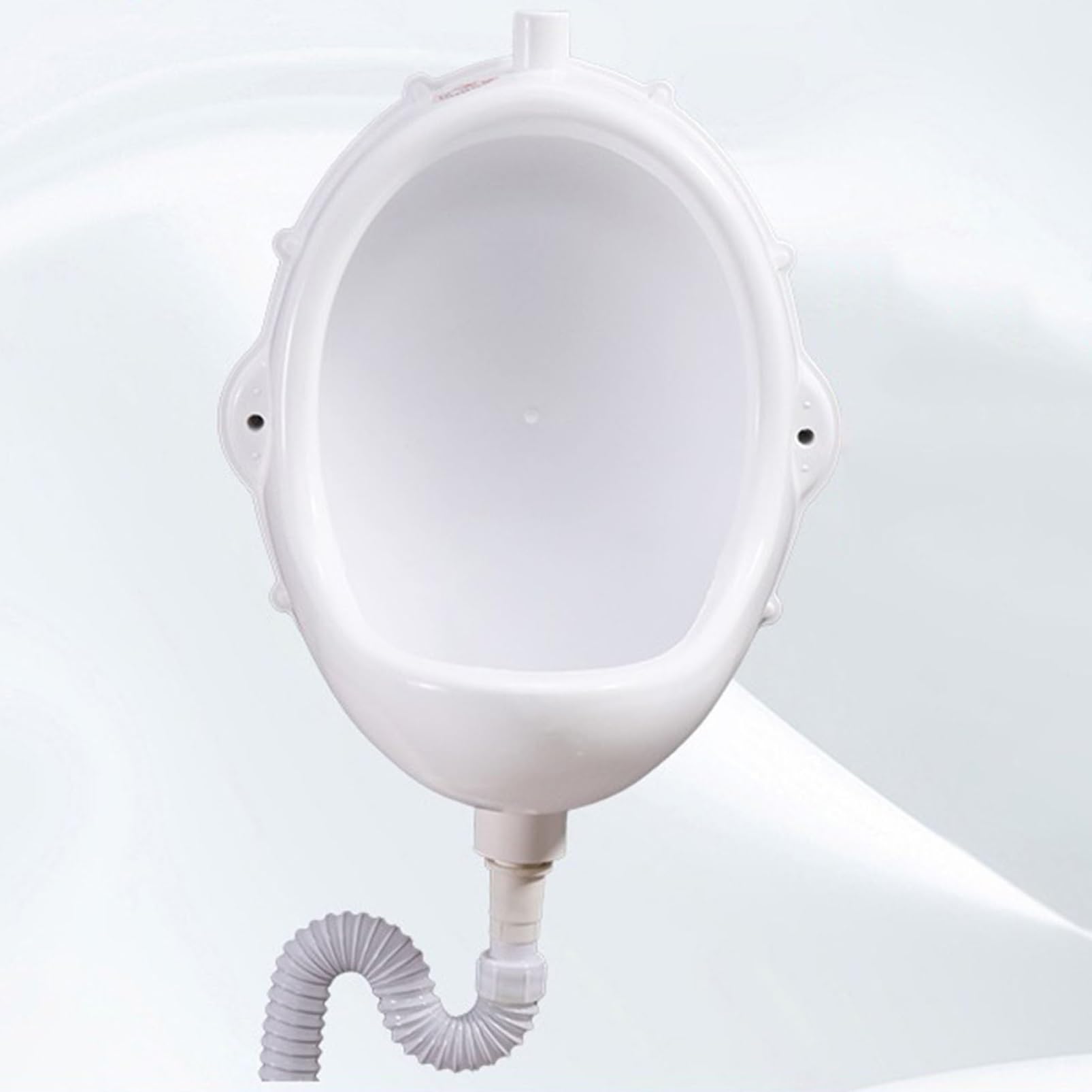 Simple plastic urinal, wall-mounted men's urinal, outdoor toilet, temporary urinal, portable urinal tray, waterless urinal with water pipe The men's urinal is made of thickened plastic material, with a sturdy and overall structure that tipping, ensuring a long service life. The interior walls of the portable urinal are smooth, easy to clean and maintain, and do not retain residues. The natural curved design ensures thorough cleaning with no spots. The bottom features a 32mm-wide drainage port for smoother drainage, and is equipped with a clog-resistant filter to effectively prevent pipe blockages and odor backflow. The outdoor urinal can be connected to a flush valve for efficient rinsing; it can also be used as a waterless urinal to help conserve water. The waterless urinal is equipped with a drain pipe for quick drainage, allowing urine to be effectively collected, managed, or safely discharged outdoors. Name: Waterless Urinal Material: PP Plastic Color: White Dimensions: 48×38×28 cm (18.89 inches × 14.96 inches × 11.02 inches) Drainage pipe length: 61 cm (24.01 inches) Installation method: Wall-mounted with drilling/no drilling required Application scope: Homes, schools, prisons, hospitals, construction sites, hotels, bushes, lawns, station service areas, and other public restrooms Packaging list: Urinal, drainage pipe, flush valve