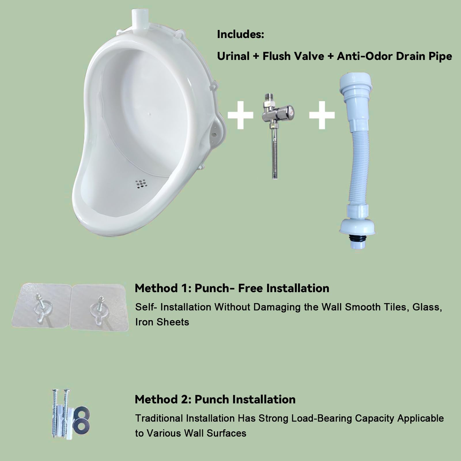 【2 Installation Methods】: This bathroom urinal offers two installation methods. is a non-adhesive hook installation, which is easy to install and does not damage the wall. The other is a drilling installation, which can be securely and permanently fixed to walls or trees.