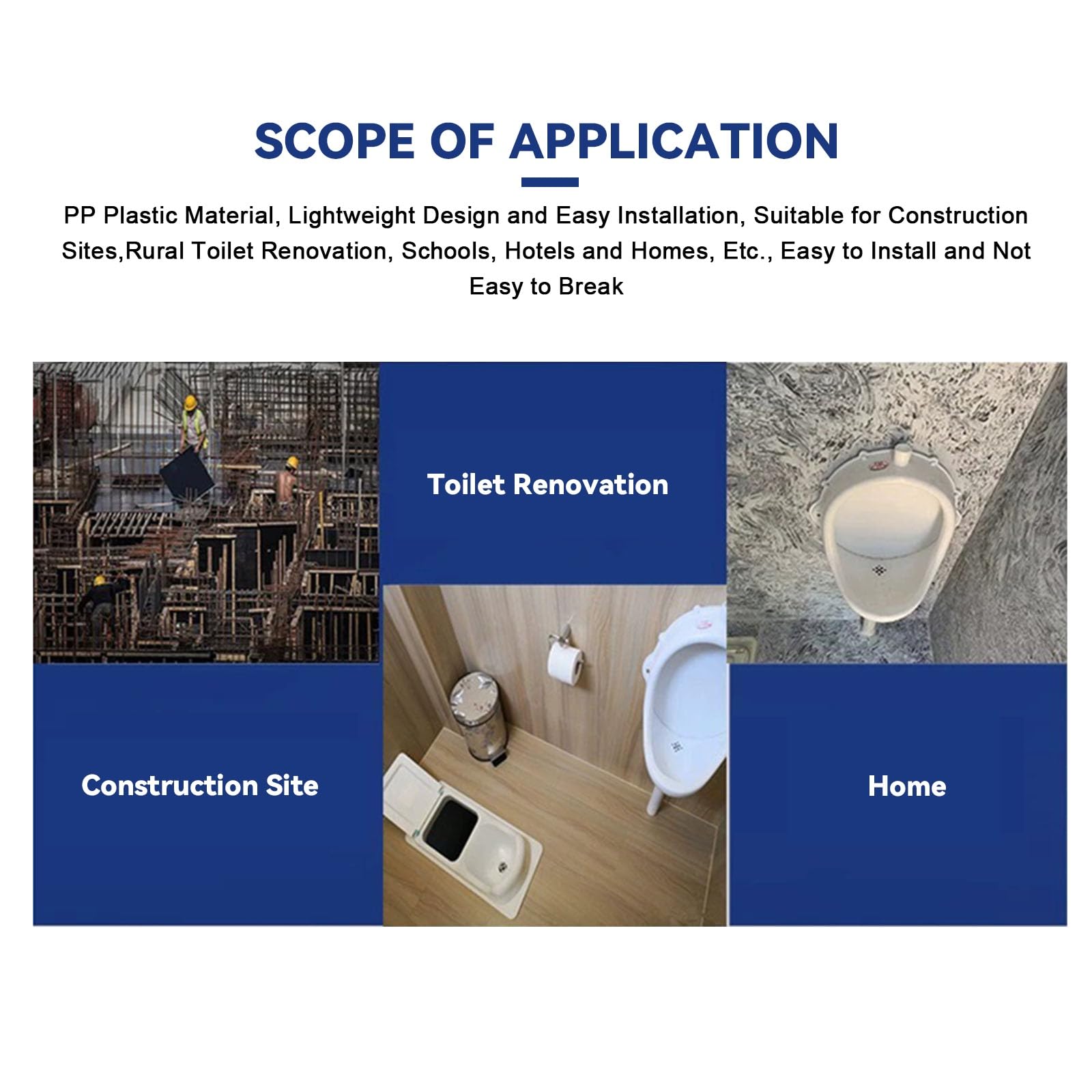 【Application Scope】Made from lightweight PP material, it weighs only third of traditional ceramic models. Its foldable structure makes it convenient for vehicle transport. It perfectly suits scenarios such as camping tents, temporary construction site toilets, and farm orchards. It can be connected to a liquid storage tank for centralized processing or use a drainage pipe for ecological discharge, solving outdoor toilet challenges.