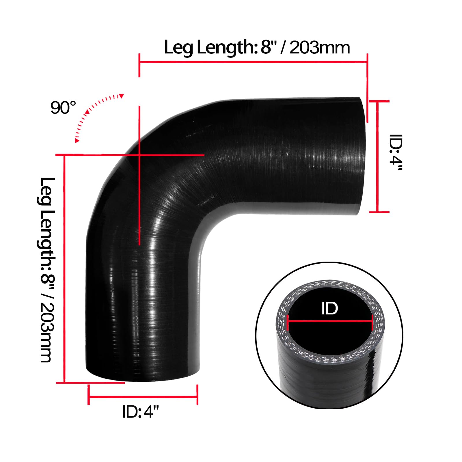 SIZE: 90 degree silicone elbow inner diameter: 4 inch(102mm). Leg length: 8 inch (203mm). Wall thickness: 0.2 inch (5mm).