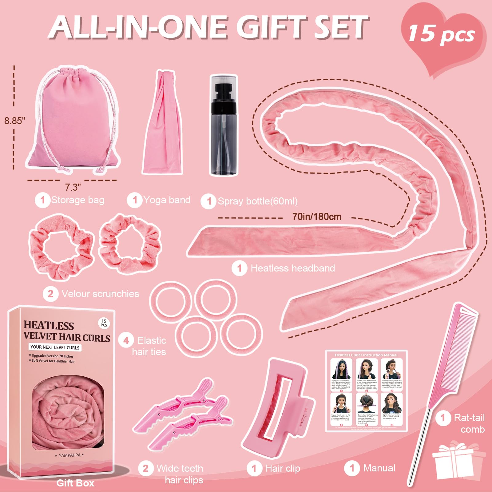 15 Pcs Hair Curlers Set: All-in-One travel hair curlers kit includes 1 x 70-inch long curling headband, 2 x velour hair ties, 4 x elastic hair ties, 1 x hair clips, 1 x rat tail comb, 1 x spray bottle, 1x yoga band, 1 x storage bag and instruction, and it's well-packed with an exquisite present box. This heatless curls headband allows you to get a beautiful wave hair any time