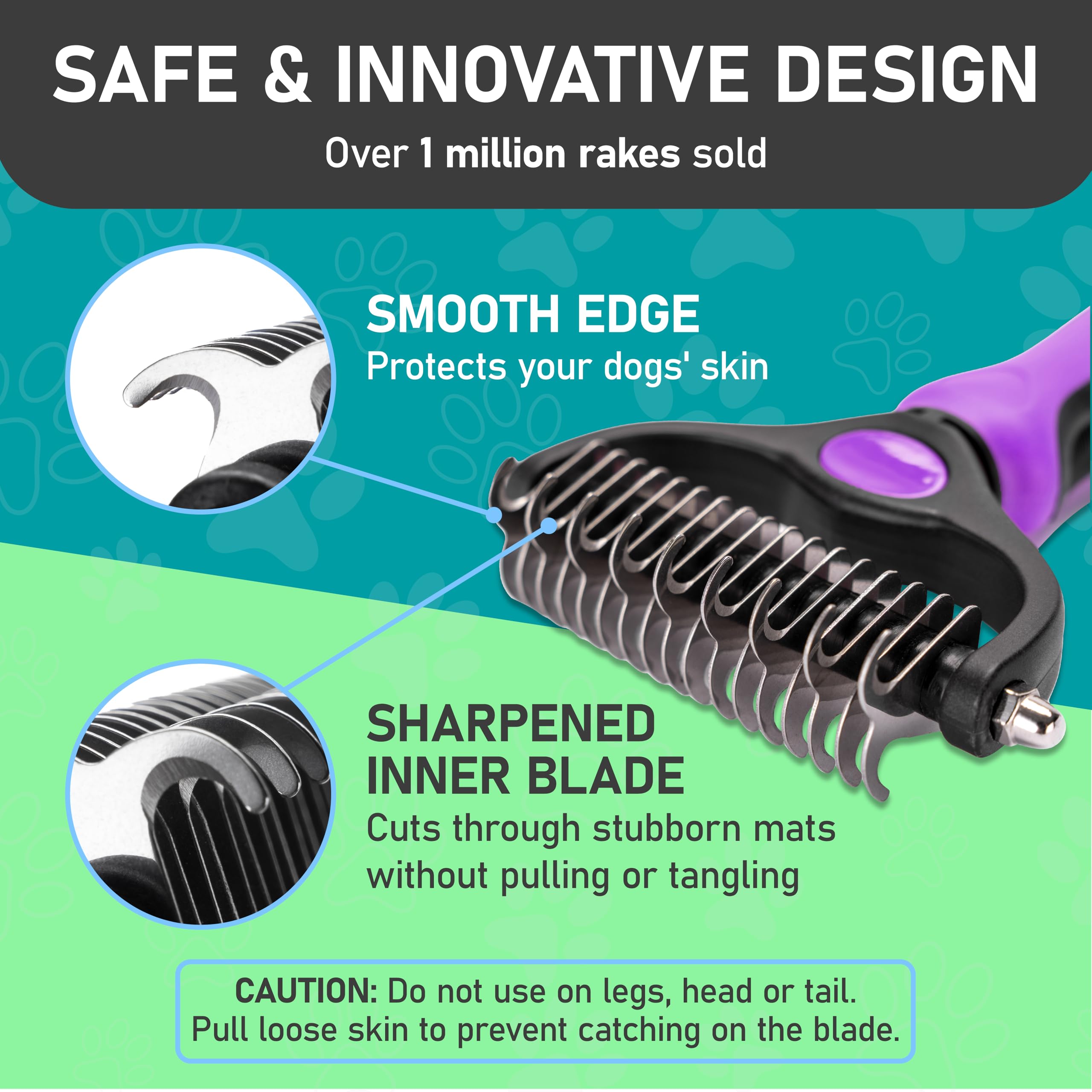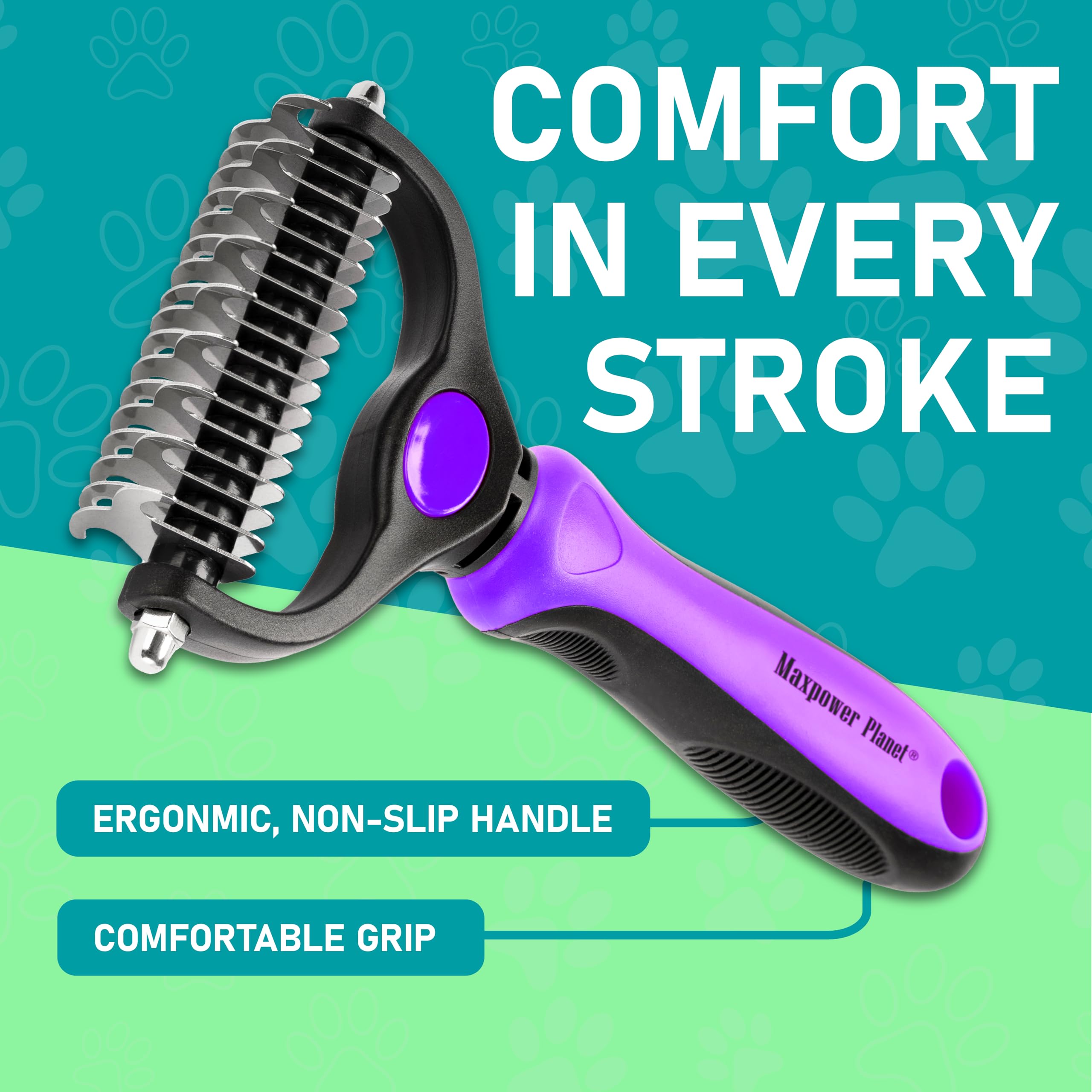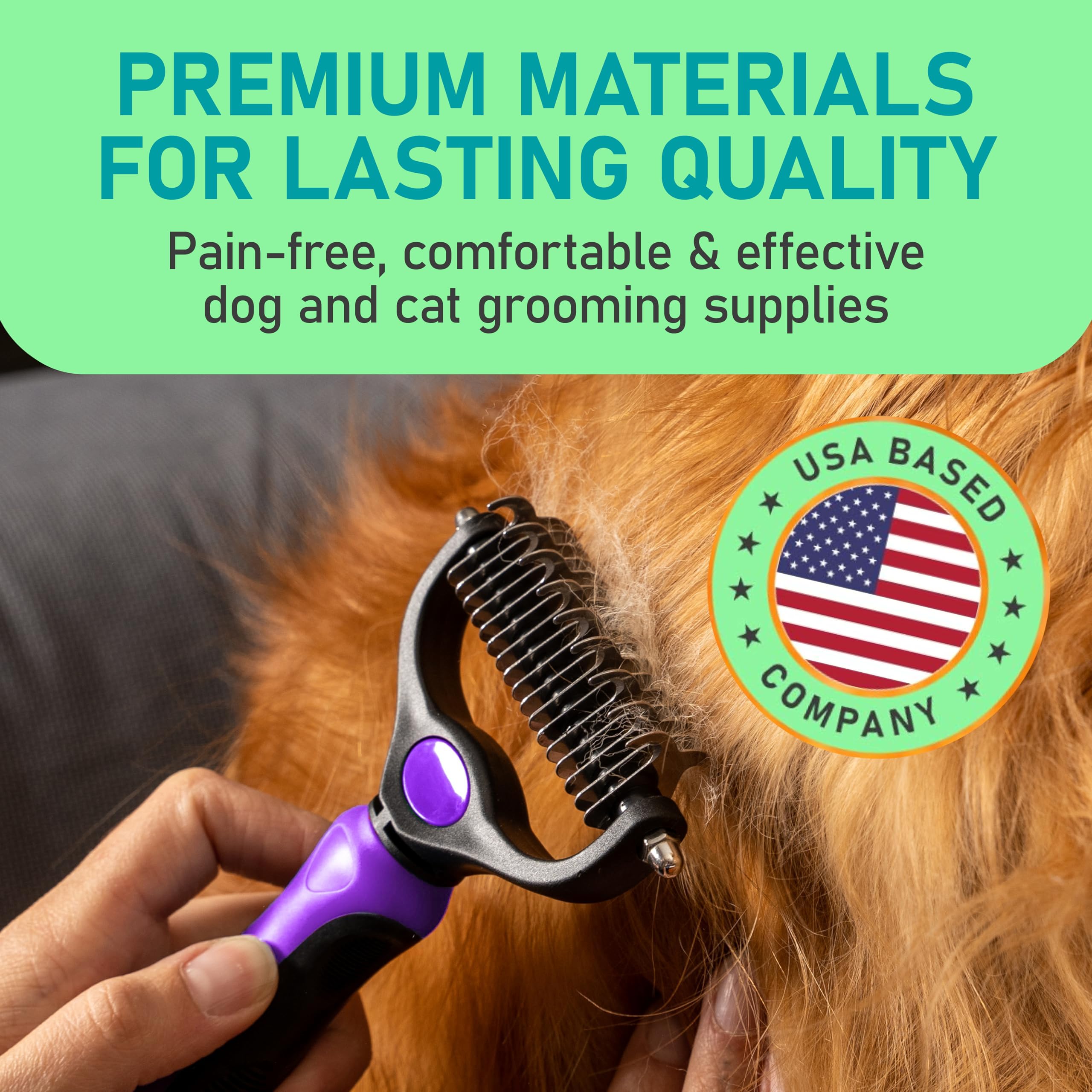 EFFECTIVE DESHEDDING TOOL: Our dematting and deshedding tool gently removes loose hair and eliminates tangles, knots, dander, and trapped dirt. The perfect cat brush or dog grooming brush solution for pets with thick fur or dense double coats.