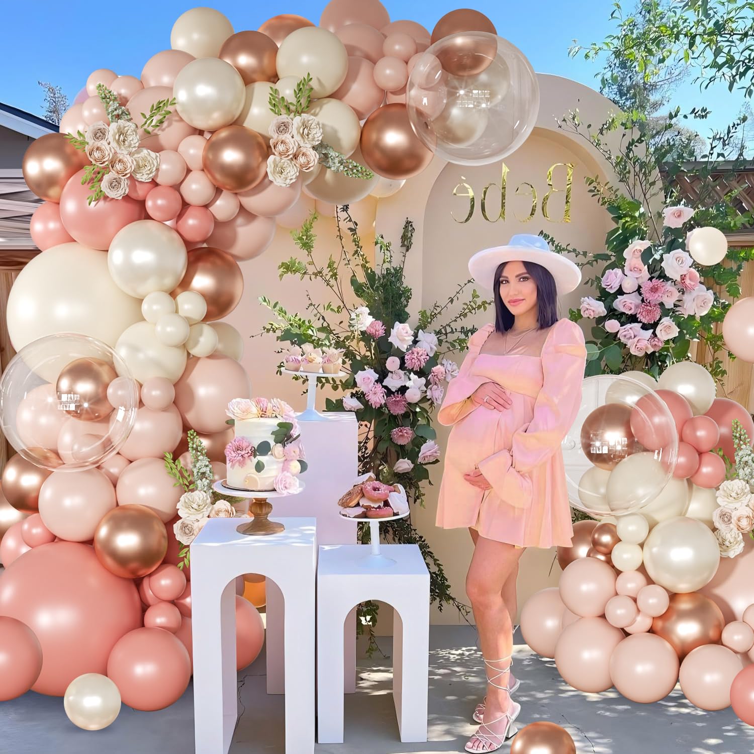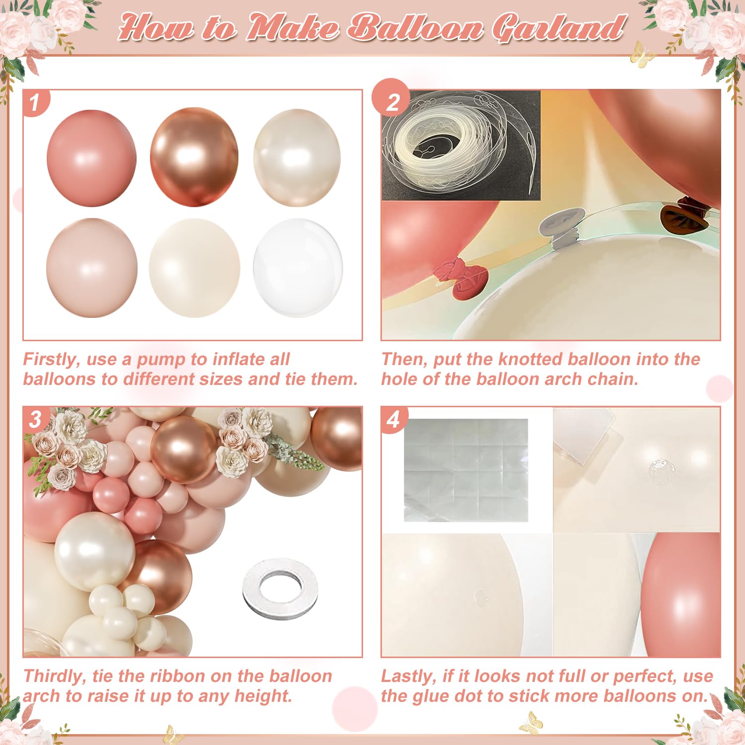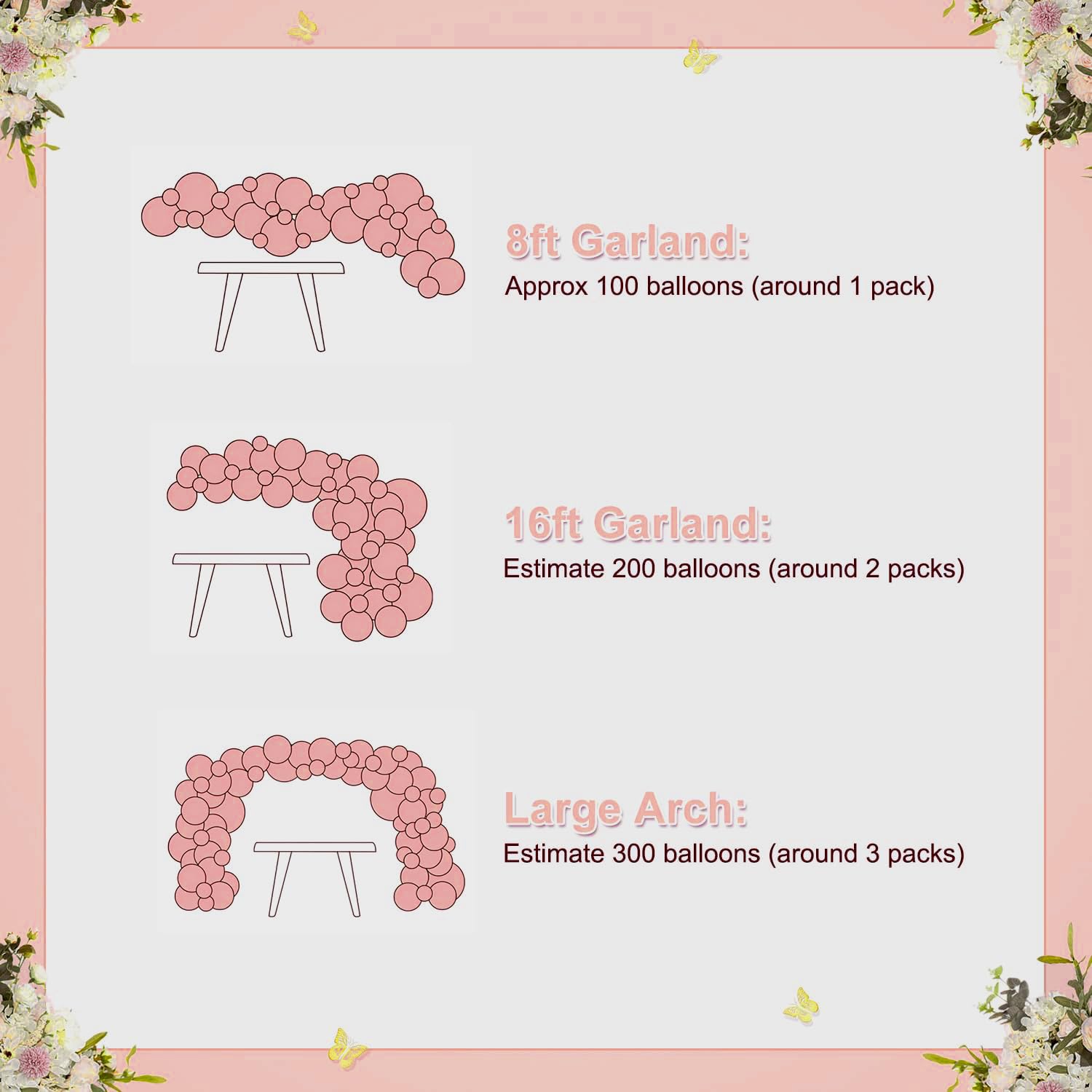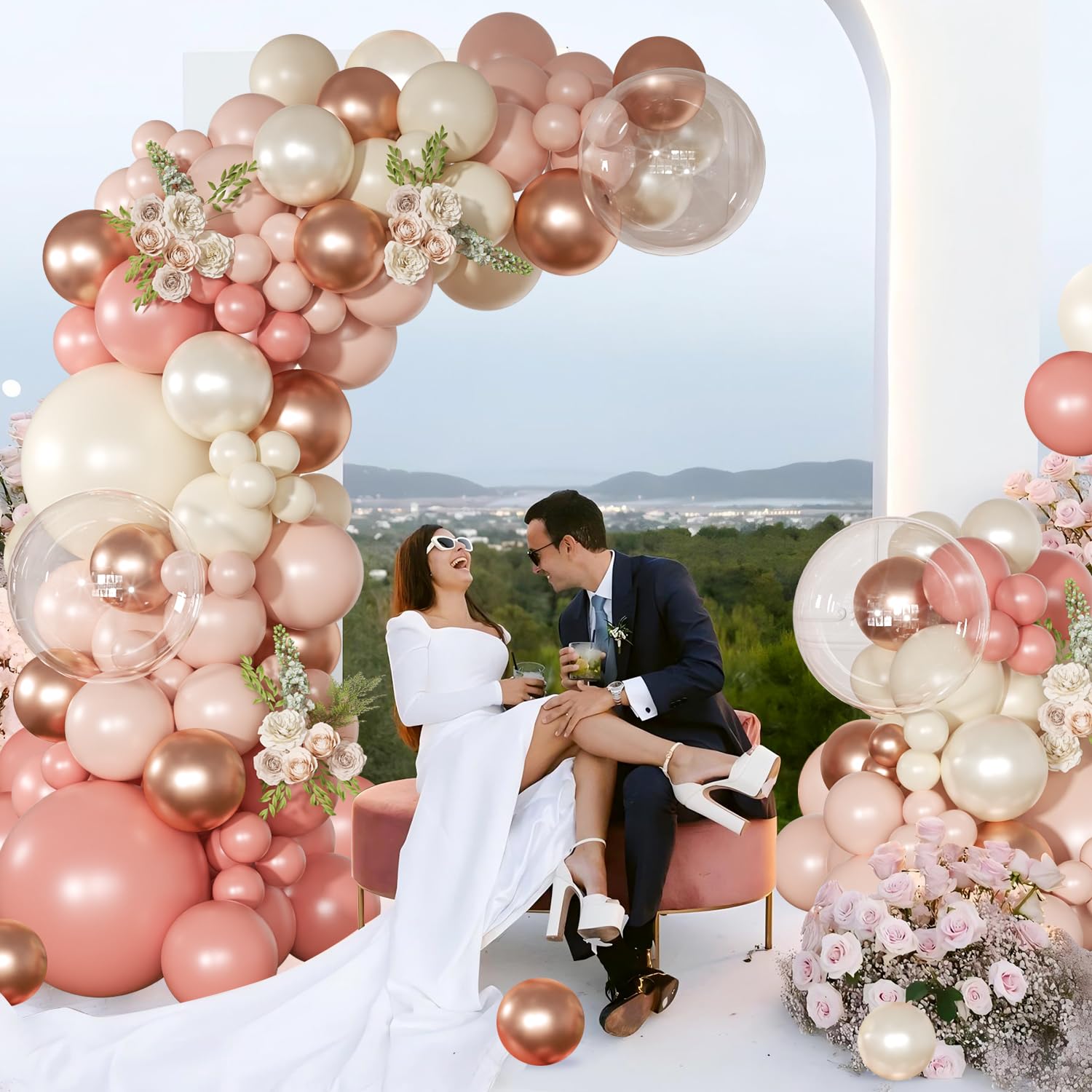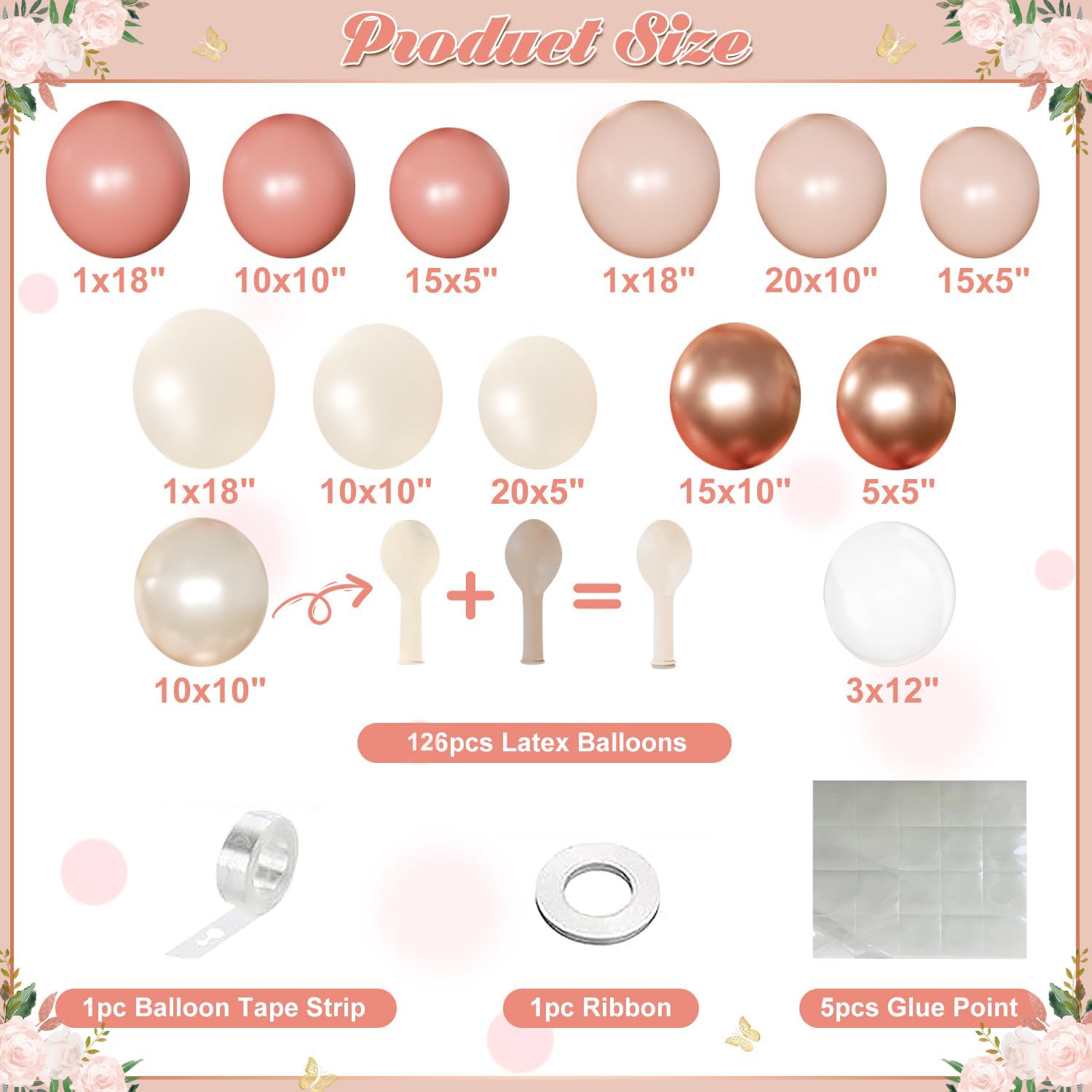 Package Includes:136-piece dusty rose pink double stuffed balloon arch garland kit in 6 elegant colors: rose gold, retro pink, macaron pink, dusty white, pearl white, and clear.Balloon Sizes & Quantities:3 × 18" balloons,3 × 12" balloons,75 × 10" balloons,55 × 5" balloons,Accessories: 1 × balloon chain, 5 × glue dots.This dusty pink and rose gold balloon garland creates a stunning statement piece for weddings, birthdays, baby showers, and more. The mix of sizes and soft hues adds dimension and sophistication to any event decor