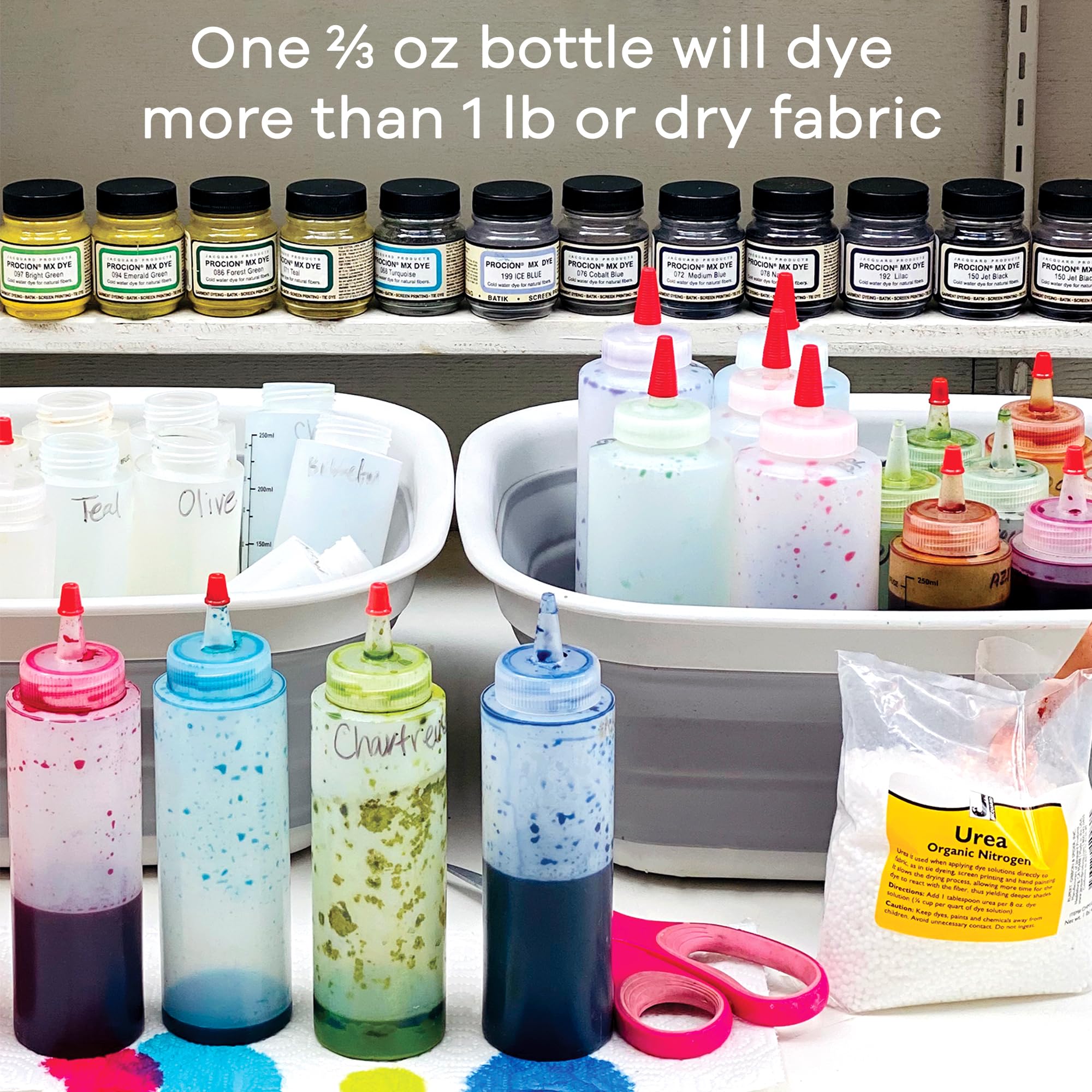 Create 1 or 100 Designs - A little goes a long way with this powder dye. For average, medium colors use 1 tablespoon of dye to 3 gallons of water and 1lb of dry fabric. Create a whole teams worth of t-shirts, hats, aprons, or other accessories
