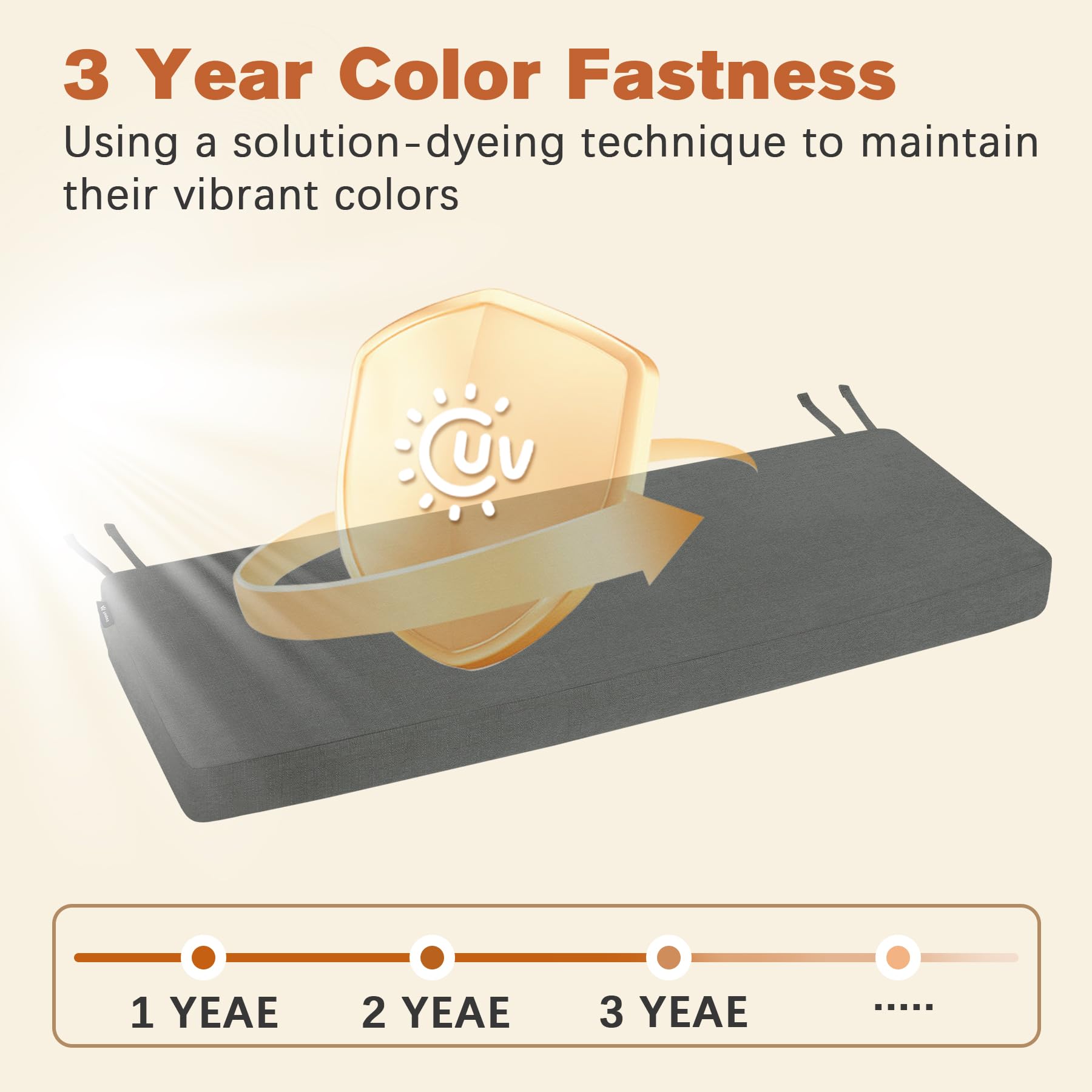 3-Year Color Fastness: Our outdoor loveseat cushions crafted with solution-dyed fabric. This type of fabric is renowned for its exceptional color fastness, making it suitable for outdoor use. With this fade-resistant fabric, our patio furniture cushions can maintain their vibrant colors for up to 3 years, even when exposed to intense midday sunlight for at least 1500 hours.