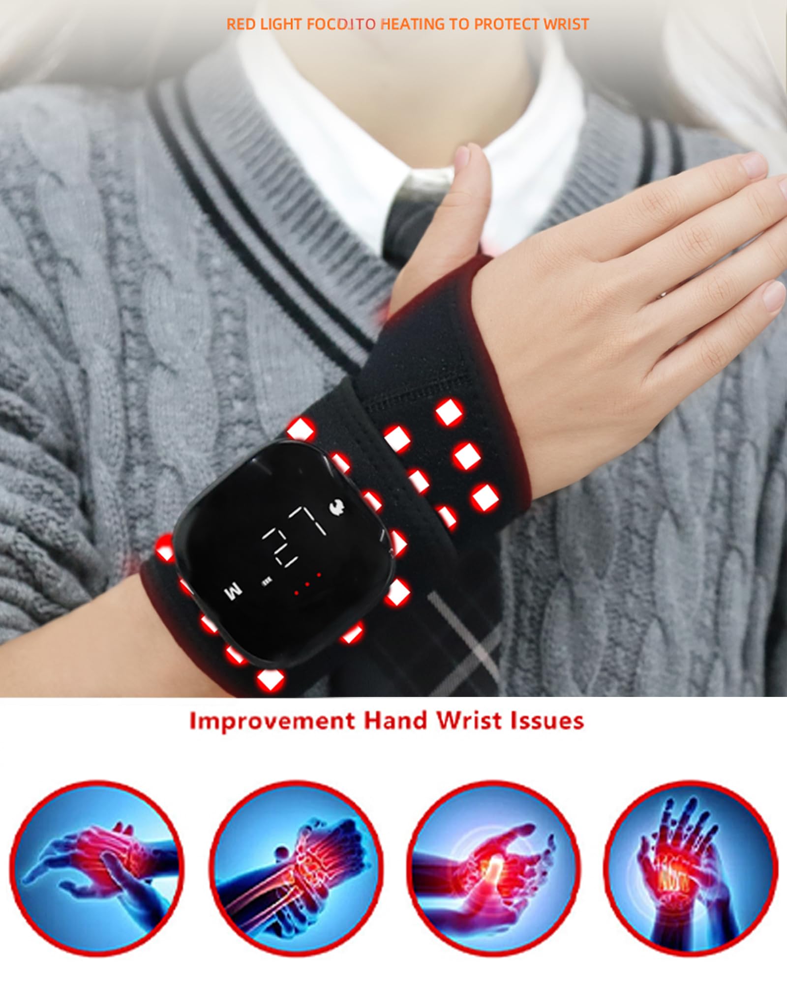 【Customizable Heat & Massage】Dr.WYFOOT red light treatment wrist mask is designed with 3 adjustable heat levels (35-50℃/95-122℉) and 5 massage modes provide personalized comfort for wrist areas.
