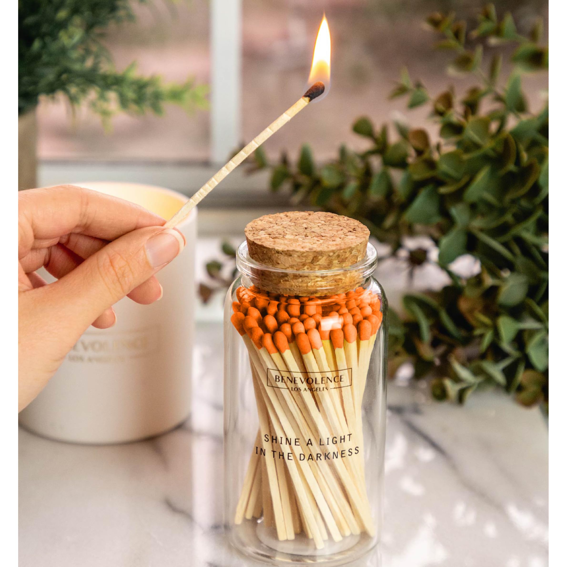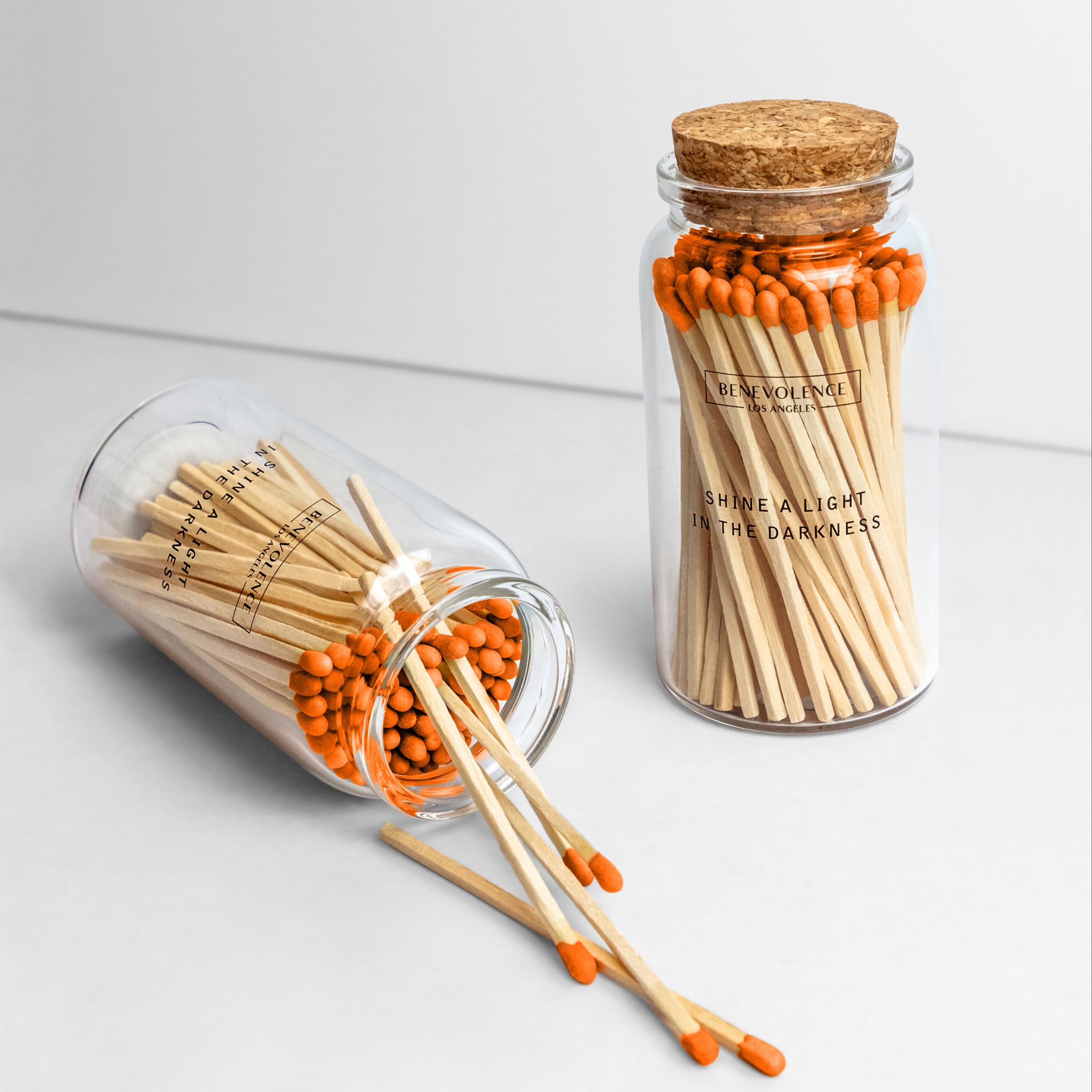 LIGHTING MADE SIMPLE: Our orange tip matches in a jar with a striker is the perfect matches for candles. This handy glass match holder comes with a striker and 10cm matches, making lighting things up in your home a breeze, whether it's for the living room or even in the bathroom.