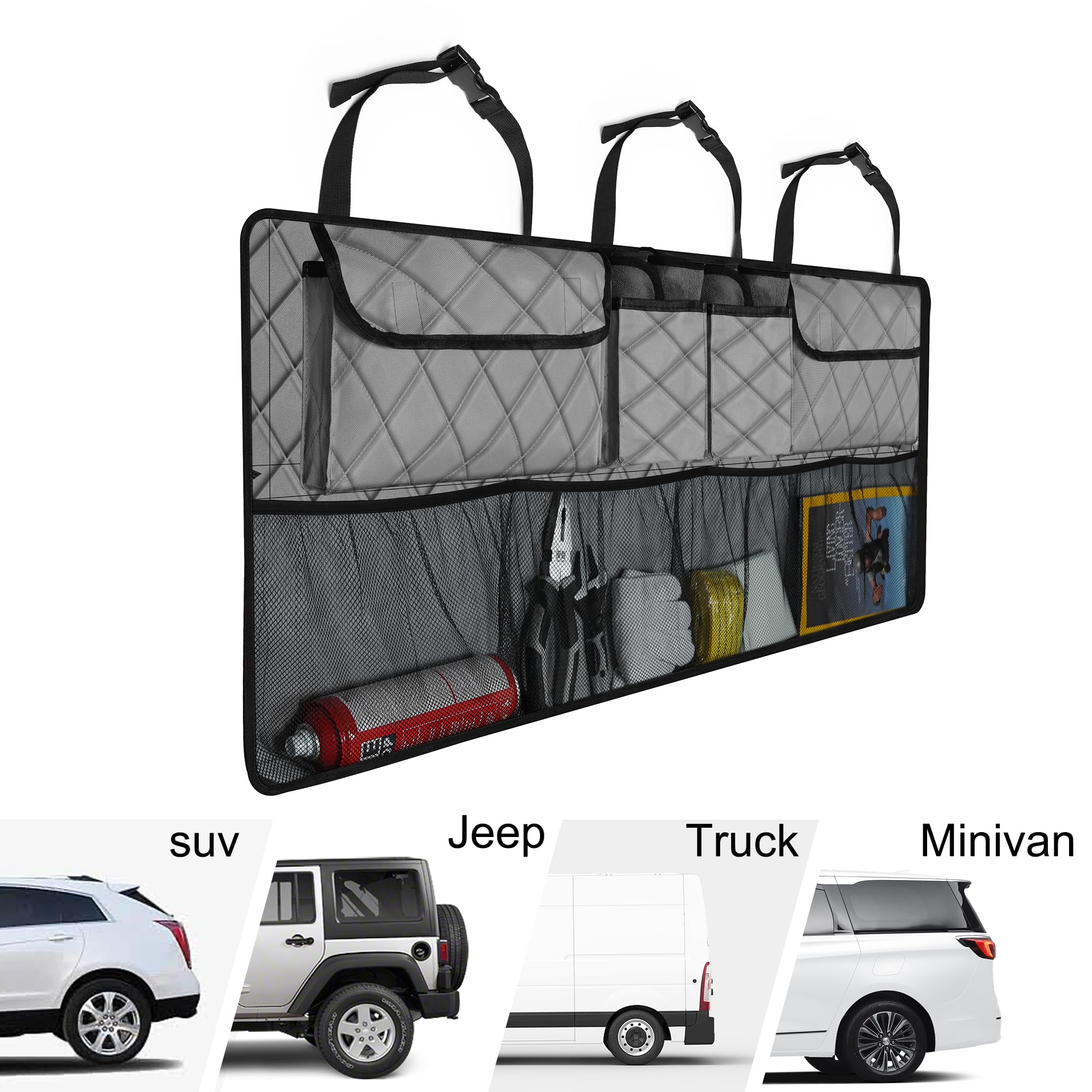 【Install Easily & Fit 90% Cars】The car trunk organizer holds with 3 strong straps and clip on and off buckles to install easily in seconds. Also fits 90% car types, this trunk organizer for suv,jeep, trunk, minivan,ect.