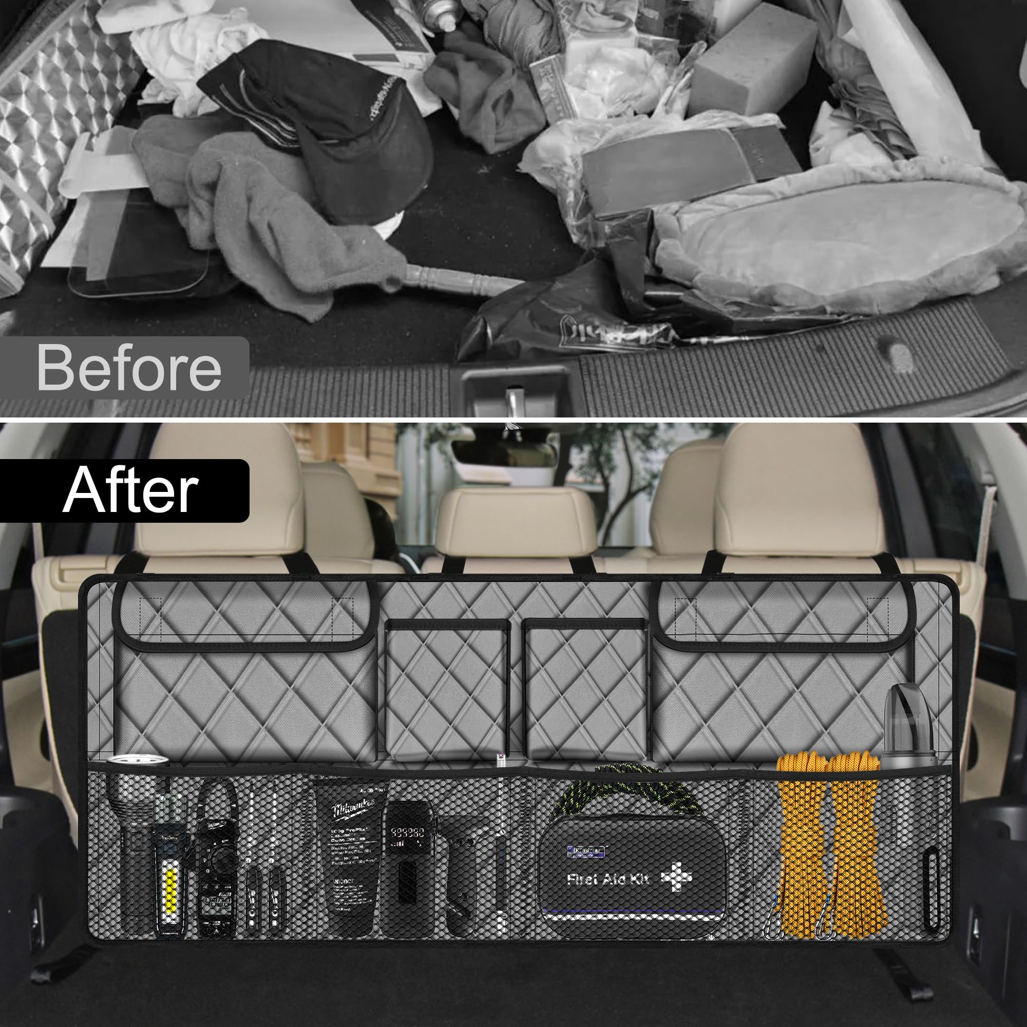【Upgrade Size】: Improved design for car organizer size to meet more car models and storage needs. The size of the backseat trunk organizer has been changed from about 30 inches to 44 inches, providing more storage space, four cloth pockets and four mesh pockets.Ideal for keeping your car neat and organized.