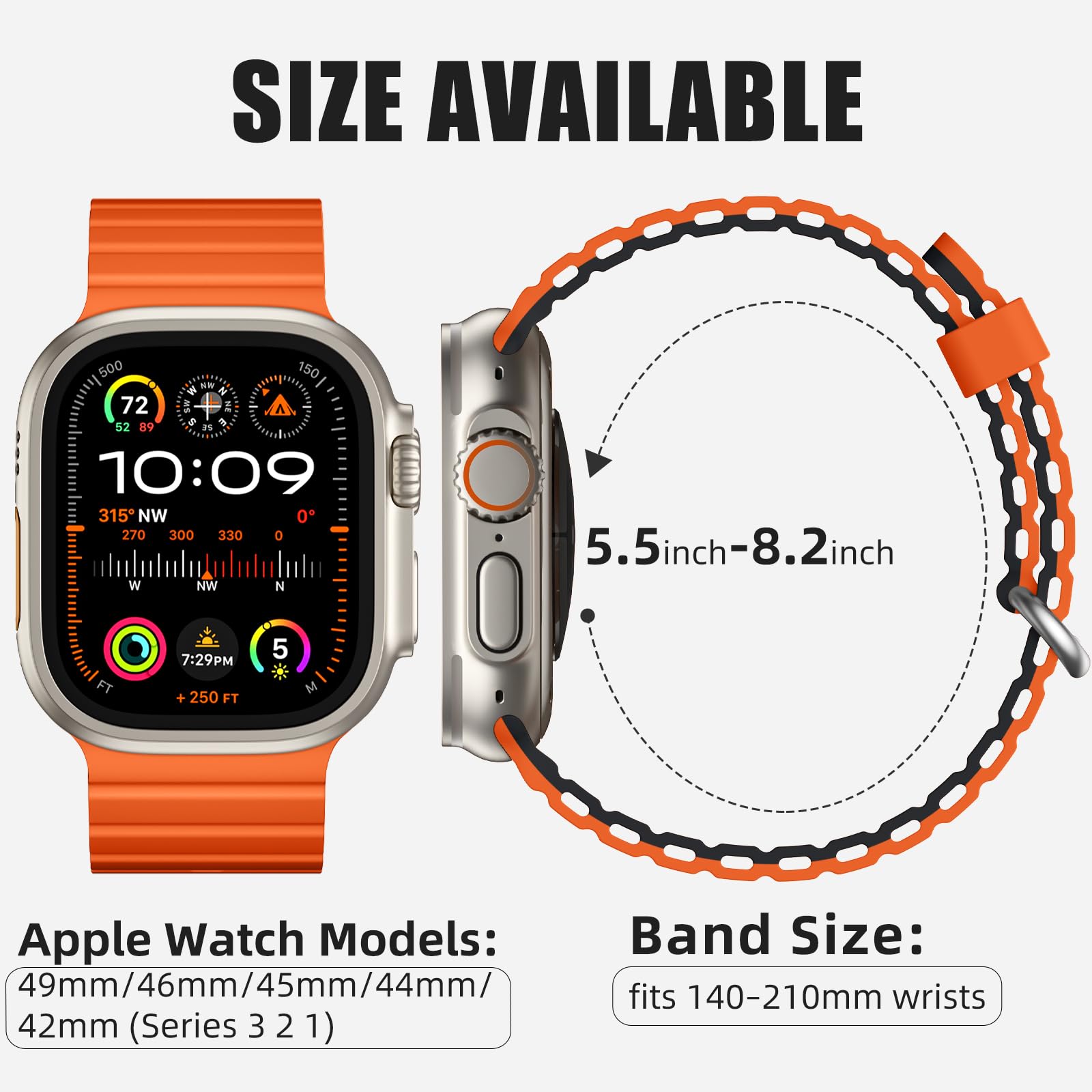 【Compatible Models & Band Size】DaQin sport ocean band specifically designed for apple watch band. Only compatible with Apple Watch 49mm 46mm 45mm 44mm 42mm(Series 3), including fit for Apple Watch Ultra 3/Ultra 2/Ultra 49mm, iwatch bands series 11, series 10, series 9, series 8, series 7, series 6, series 5, series 4, series 3, series 2, series 1. Suitable for 140mm–210mm (5.5"- 8.2"inch) wrist. Please check the model size on the back of your watch and your wrist size before purchasing