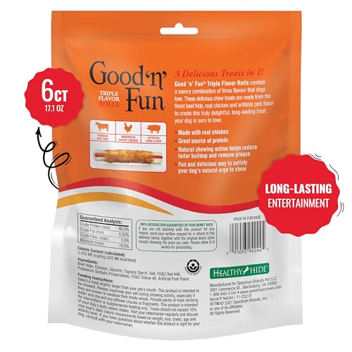 Good ‘n’ Fun® brand contains a savory smorgasbord of flavors that dogs love most. These delicious chew treats are made from the finest ingredients, including long-lasting beef hide and premium chicken, to create truly delightful, long-lasting treats your dog will love. Good ‘n’ Fun® Triple Flavor Rolls contain a savory combination of three flavors that dogs love. These delicious chew treats are made from beef hide with delicious artificial pork flavor, then wrapped with premium chicken to create this truly delightful, long-lasting treat your dog is sure to love. Natural chewing action helps reduce tartar buildup and remove plaque. Roll chews are a fun and delicious way to satisfy your dog’s natural urge to chew. Always provide your dog with fresh, clean water daily. Supervise your dog when giving chews. Recommended size is slightly larger than your dog’s mouth. Let your pup enjoy a delicious snack along with you with the Good ‘n’ Fun product line.