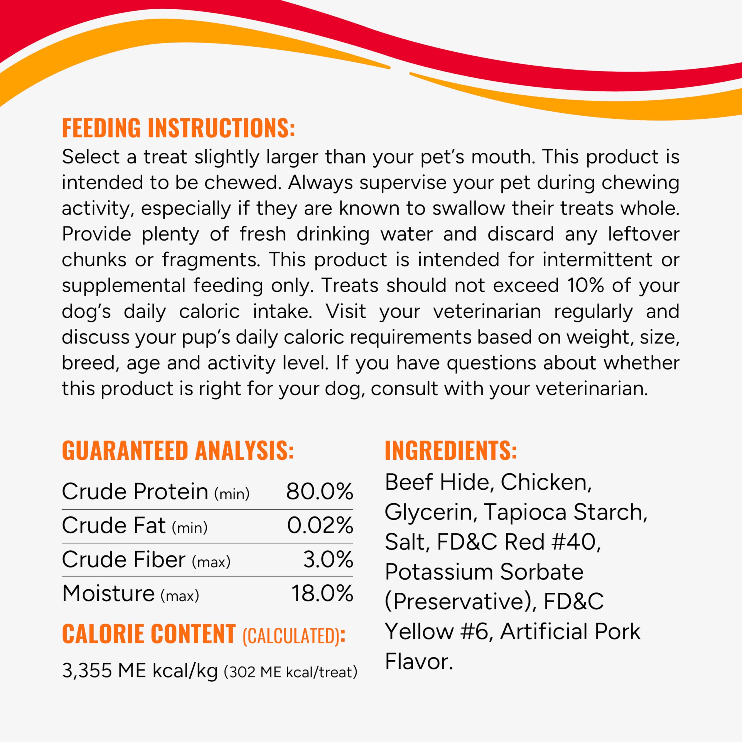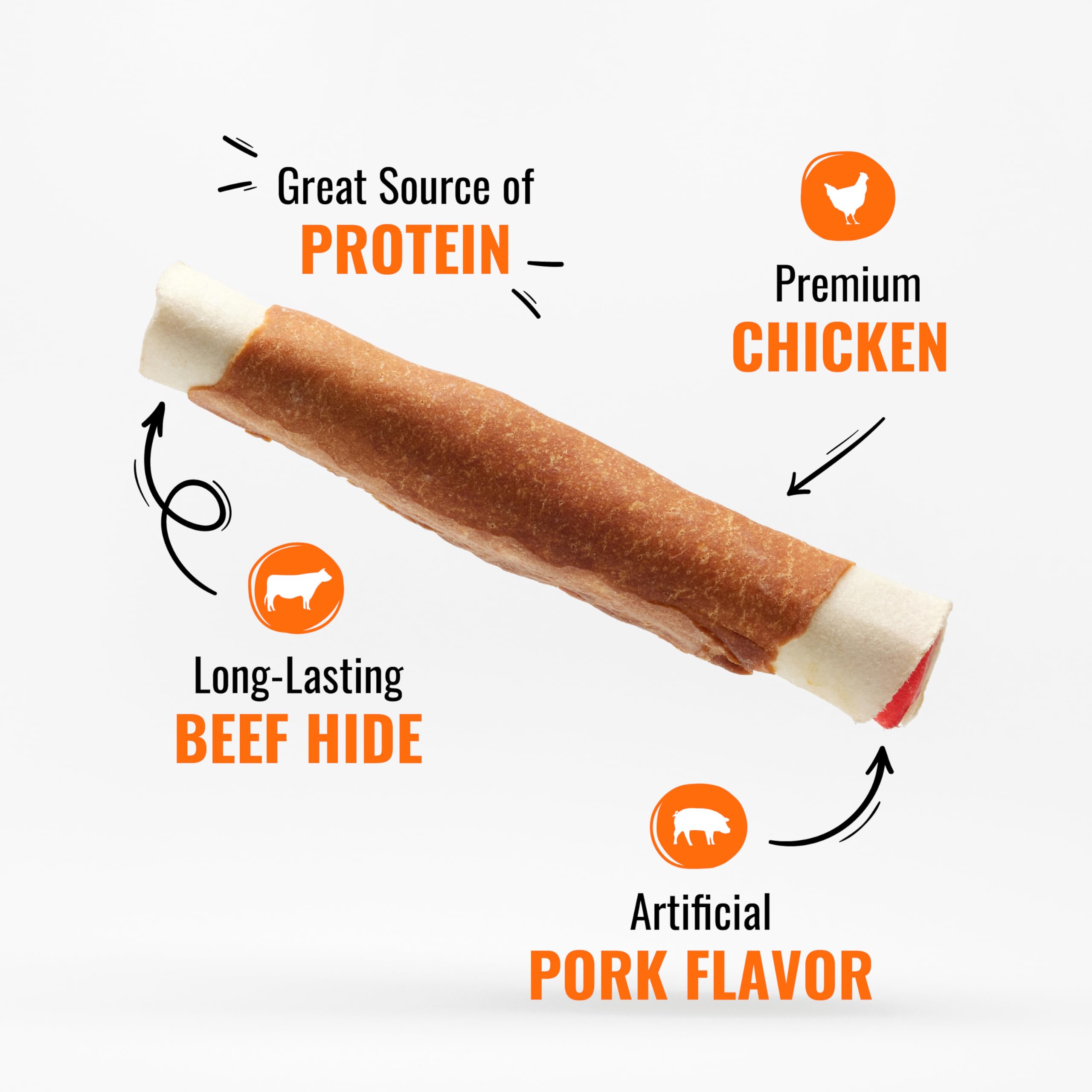 THREE DELICIOUS TREATS IN ONE: Each roll combines long-lasting beef hide, artificial pork flavor and premium chicken.