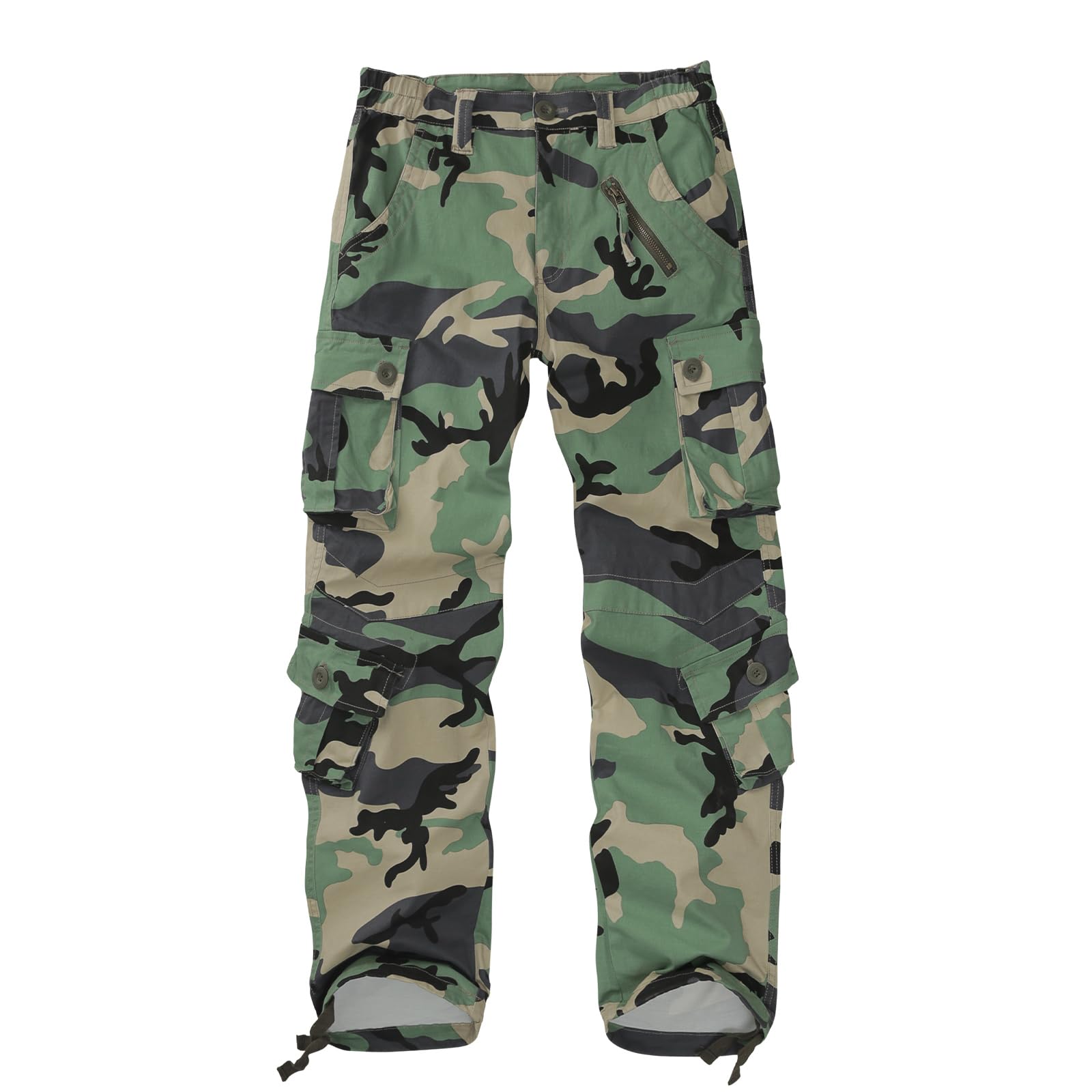 Womens Camouflage Pants with 9 Pockets: Featuring plenty of storage pockets, Front slant pocket x2; thigh buttoned flap pocket x2;leg buttoned flap pocket x2; rear buttoned flap pocket x2; Left zipper coin pocket x1.
