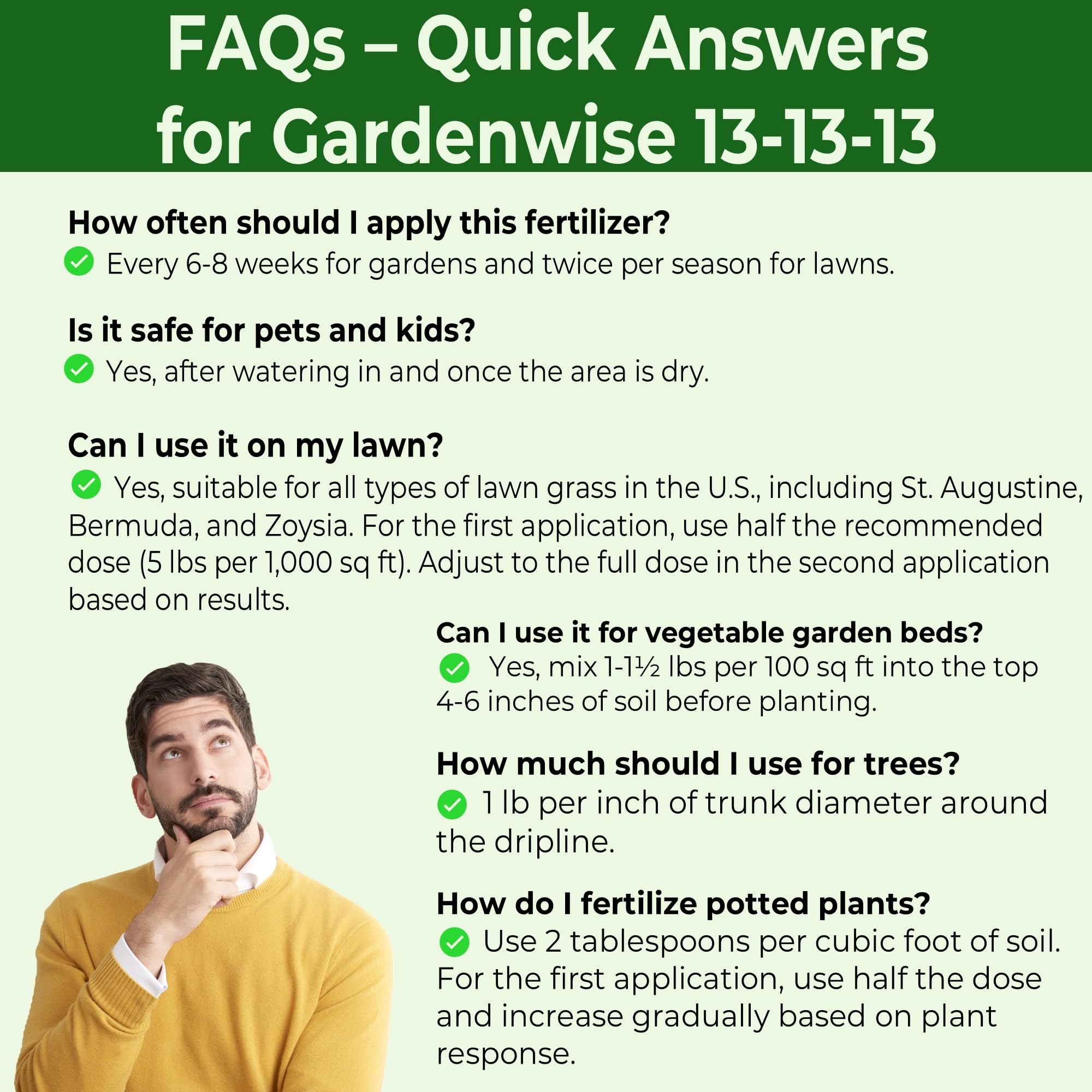 🌿 Balanced 13-13-13 Fertilizer for Outdoor Plants: Provides 13% Nitrogen, 13% Phosphorus, and 13% Potassium for optimal growth. Perfect for lawns, vegetable gardens, rose bushes, flowers, shrubs, and trees. Ideal for St. Augustine grass, evergreens, and all outdoor plants.
