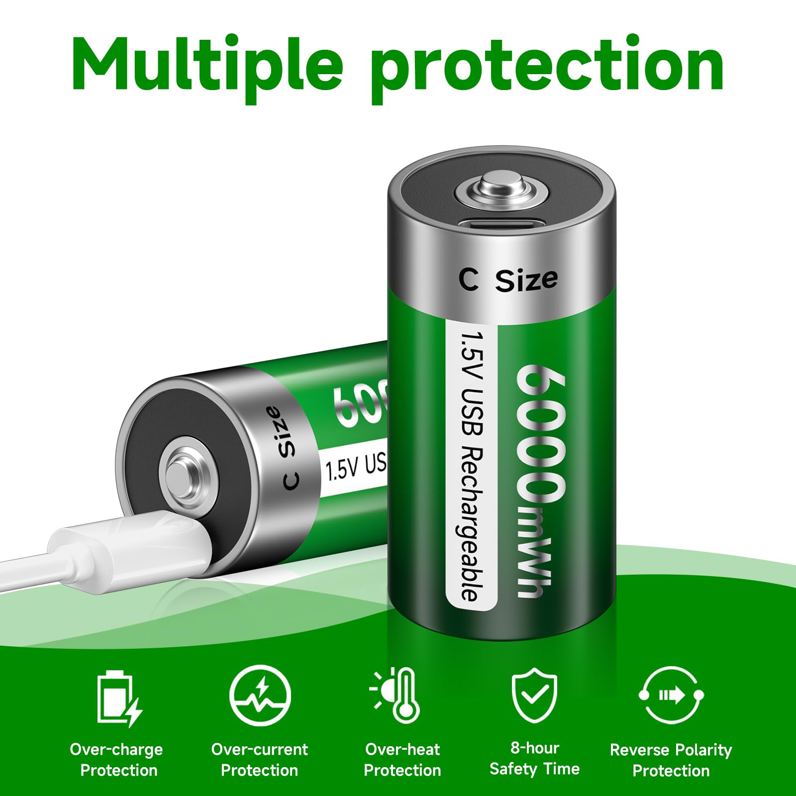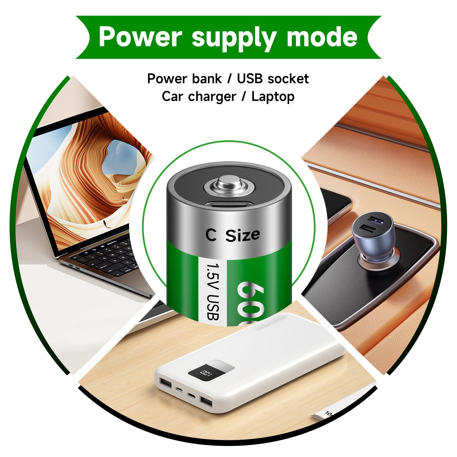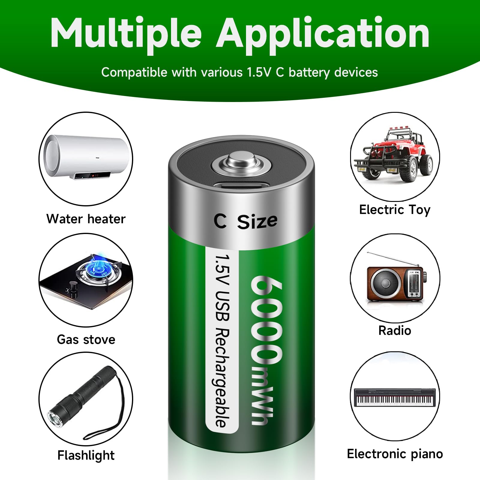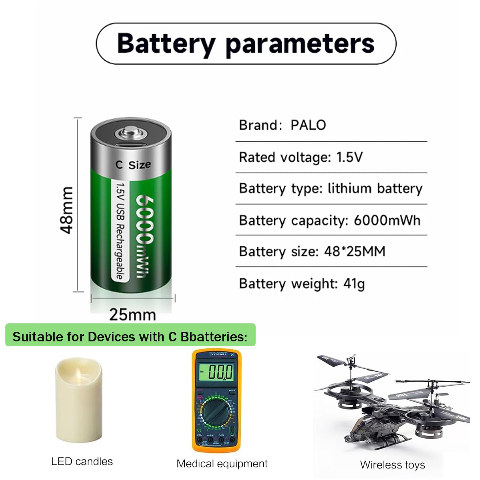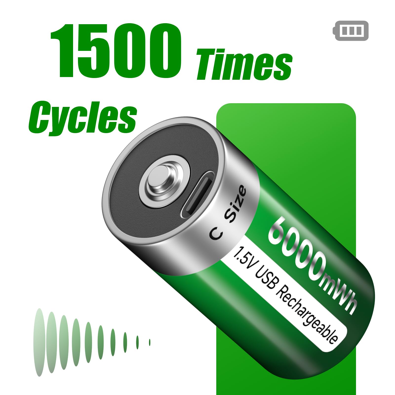 【C Cell Batteries Durable and long-lasting】Constant 1.5V Output C cell rechargeable batteries 6000mWhlong lasting lithium batteries with no memory effect, steady 1.5v output voltage.