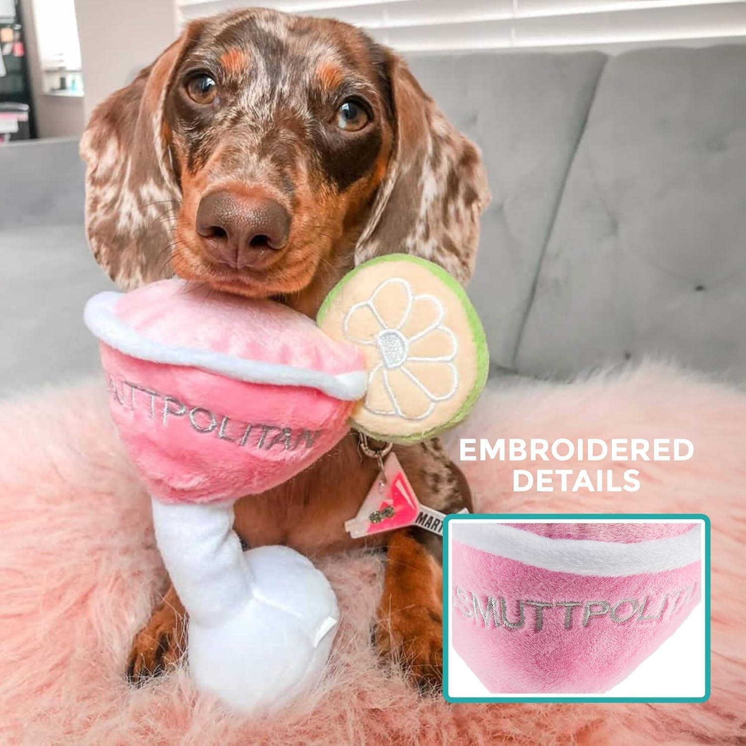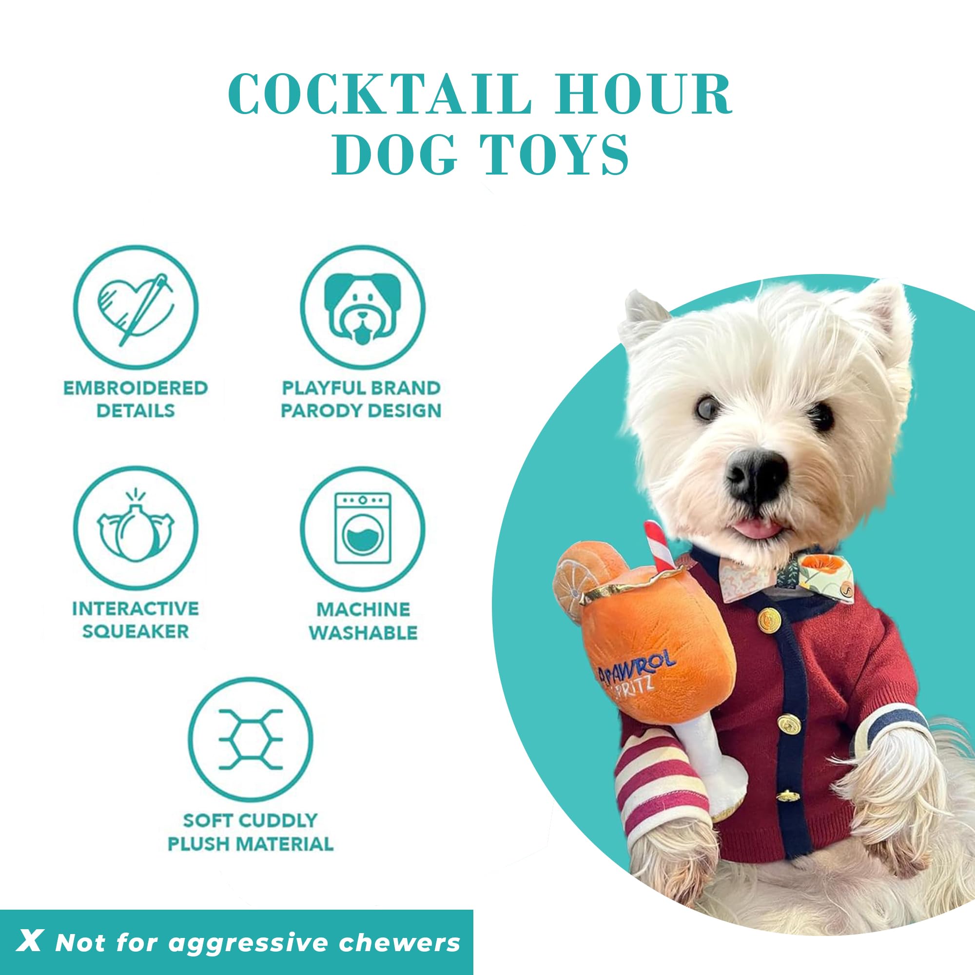 Funny Parody Plush Dog Toy: If your pup loves to pawty, then give them this 3-pack plush dog toy bundle featuring Apawrol Spritz, Cosmuttpolitan, and Dirty Muttini. Each toy has a soft plush exterior with a built-in squeaker hidden inside. It’s a fun, cute interactive squeaky dog toy that turns every playtime into happy hour! One size